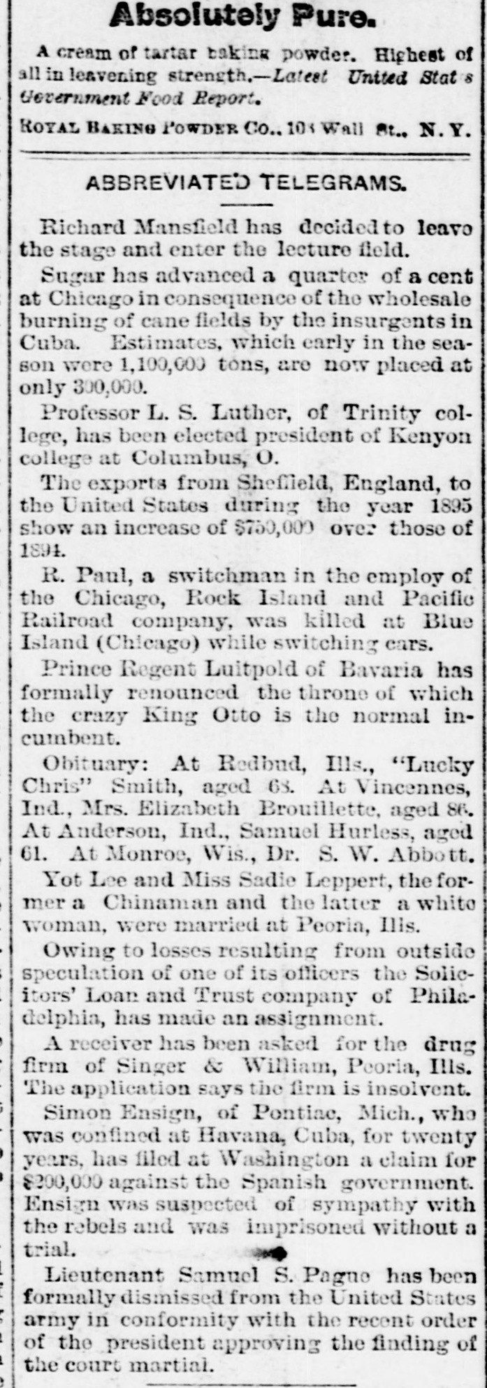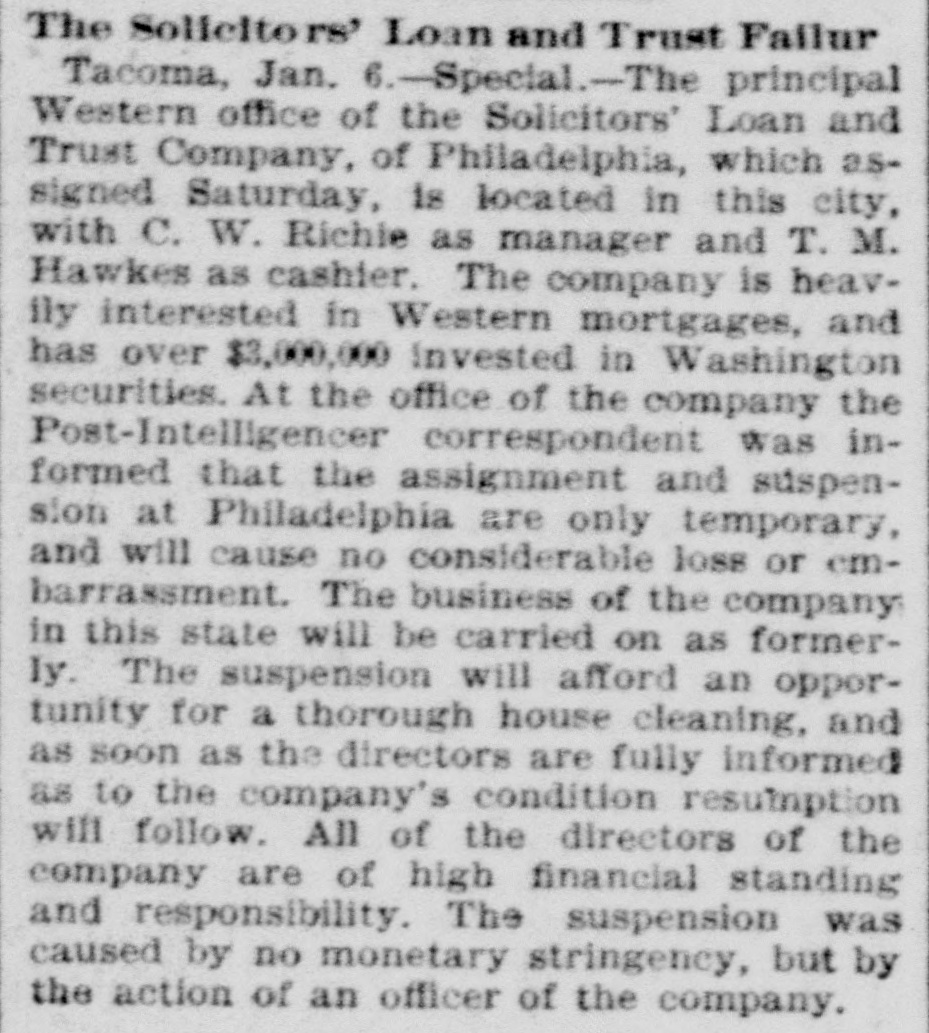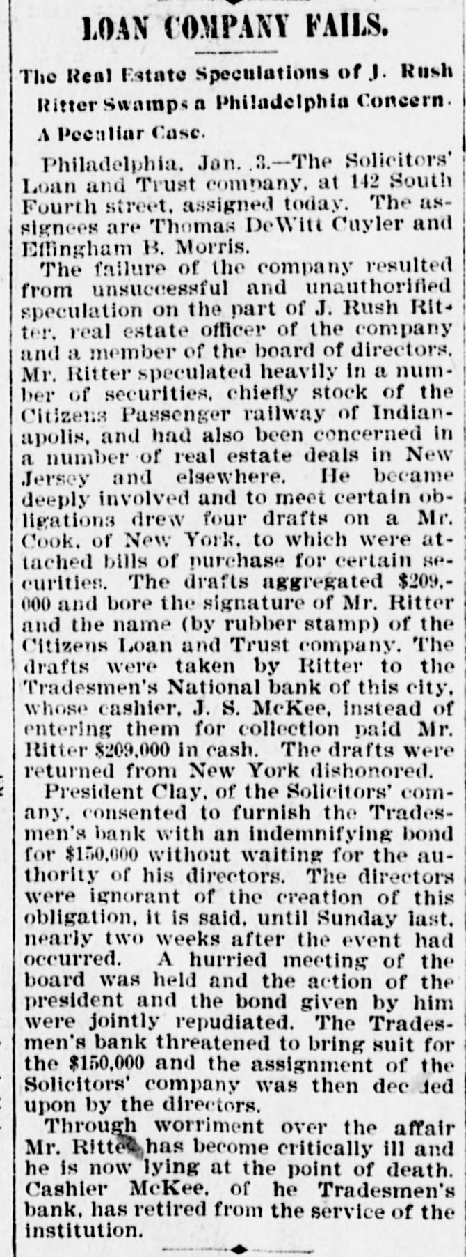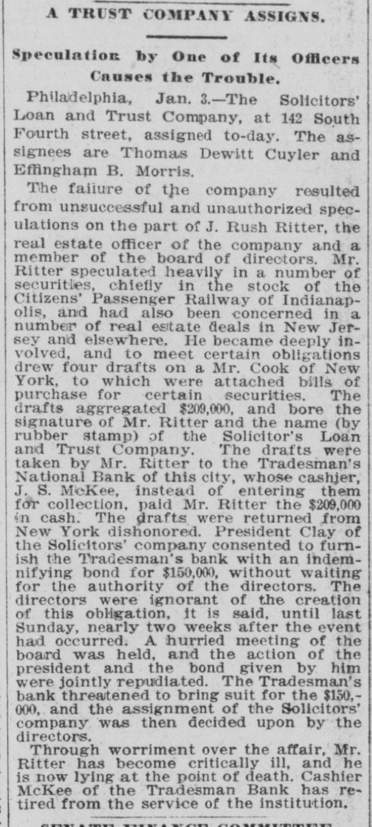 SOME SOUND MONEY MEN. The American Saving and Loan Association (sound) Minneapolis, Minn, is in the hands of a receiver. Money "good in Yurrip" wouldn't save it. The Western Carolina Lumber Company in Swain county, is in the hands of a receiver. The assets will, of course, bring some sound dollars. Keen, Sutterlee & Co., leather dealers, Philadelphia, Pa., have assigned. The liabilities will, it is said, reach the enormous sum of $4,000,000. Amount of assets unknown. The firm was for sound money. John M. Fenlin, a large morocco merchant, failed on the same day. Geo. Porter, a commission merchant, New York, committed suicide in a New York jail the other day. He was charged with passing a worthless check to get some dollars good in Europe. E. Seidenburg, Steifel & Co., New York, cigar manufacturers, have assigned. They owe $350,000 and claim to have $500,000 worth of assets. Perkins & Welsh, sugar and coffee importers, New York, have failed. They owe about $500,000 (sound.) The rapidity with which the big firms are getting out of business by the little end of the horn exit leads us to believe that they are well pleased with the gold standard policy, as it relieves them of all their property and business cares. Kahn, Schoenbrun & Co, dealers in clothing. Chicago, have assigned. They owe $300,000 (sound.) The failure of the Solicitors' Trust Company, Philadelphia, Pa., is causing "sensations." Crookedness is the cause. Honest money, of course, makes it all right. The Standard Electric Company, Chicago, Ill., assigned on the 16th. They wanted honest money and got it, also got left. The Old Judge Distilling Company, Frankfort, Ky., has made an assignment. The whiskey trust and the National Bank monopoly is as thick as peas in the pod, and yet the banks didn't come to the rescue. The banks have got sound money, however. The Moonsocket Rubber Company, at Millville, Mass., employing 1,000 men, closed indefinitely Wednesday. Sound money don't buy rubber goods, nor any other kind of goods to any great extent.