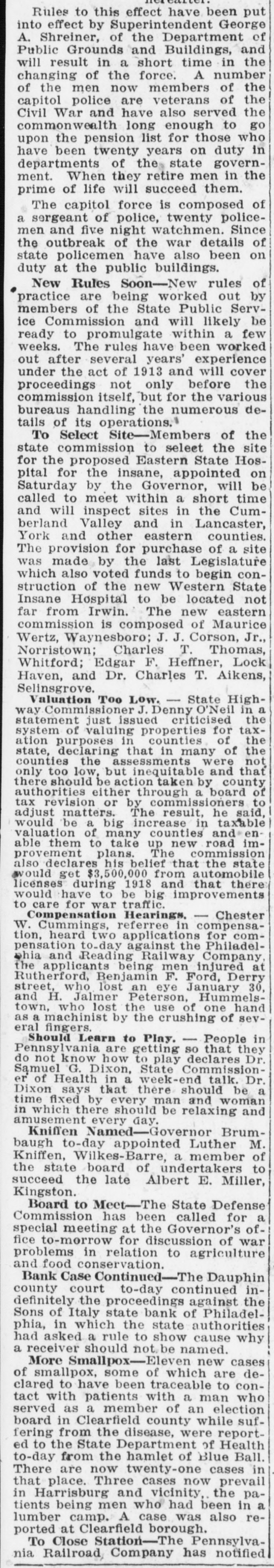 Rules to this effect have been put into effect by Superintendent George A. Shreiner, of the Department of Public Grounds and Buildings, and will result in a short time in the changing of the force. A number of the men now members of the capitol police are veterans of the Civil War and have also served the commonwealth long enough to go upon the pension list for those who have been twenty years on duty in departments of the state government. When they retire men in the prime of life will succeed them. The capitol force is composed of a sergeant of police, twenty policemen and five night watchmen. Since the outbreak of the war details of state policemen have also been on duty at the public buildings. New Rules Soon-New rules of practice are being worked out by members of the State Public Service Commission and will likely be ready to promulgate within a few weeks. The rules have been worked out after several years' experience under the act of 1913 and will cover proceedings not only before the commission itself, but for the various bureaus handling the numerous details of its operations. To Select Site-Members of the state commission to select the site for the proposed Eastern State Hospital for the insane, appointed on Saturday by the Governor, will be called to meet within a short time and will inspect sites in the Cumberland Valley and in Lancaster, York and other eastern counties. The provision for purchase of a site was made by the last Legislature which also voted funds to begin construction of the new Western State Insane Hospital to be located not far from Irwin. The new eastern commission is composed of Maurice Wertz, Waynesboro; J. J. Corson, Jr., Norristown; Charles T. Thomas, Whitford; Edgar F. Heffner, Lock Haven, and Dr. Charles T. Aikens, Selinsgrove. Valuation Too Low. - State Highway Commissioner J. Denny O'Neil in a statement just issued criticised the system of valuing properties for taxation purposes in counties of the state, declaring that in many of the counties the assessments were not only too low, but inequitable and that there should be action taken by county authorities either through a board of tax revision or by commissioners to adjust matters. The result, he said, would be a big increase in taxable valuation of many counties and enable them to take up new road improvement plans. The commission also declares his belief that the state would get $3,500,000 from automobile licenses during 1918 and that there would have to be big improvements to care for war traffic. Compensation Hearings. - Chester W. Cummings, referree in compensation, heard two applications for compensation to-day against the Philadelphia and Reading Railway Company, the applicants being men injured at Rutherford, Benjamin F. Ford, Derry street, who lost an eye January 30, and H. Jalmer Peterson, Hummelstown, who lost the use of one hand as a machinist by the crushing of several fingers. Should Learn to Play. - People in Pennsyl are getting SO that they do not know how to play declares Dr. Samuel G. Dixon, State Commissioner of Health in a week-end talk. Dr. Dixon says that there should be a time fixed by every man and woman in which there should be relaxing and amusement every day. Kniffen Named-Governor Brumbaugh to-day appointed Luther M. Kniffen, Wilkes-Barre, a member of the state board of undertakers to succeed the late Albert E. Miller, Kingston. Board to Meet-The State Defense Commission has been called for a special meeting at the Governor's office to-morrow for discussion of war problems in relation to agriculture and food conservation. Bank Case Continued-The Dauphin county court to-day continued indefinitely the proceedings against the Sons of Italy state bank of Philadelphia, in which the state authorities had asked a rule to show cause why a receiver should not be named. More Smallpox-Eleven new cases of smallpox, some of which are declared to have been traceable to contact with patients with a man who served as a member of an election board in Clearfield county while suffering from the disease, were reported to the State Department of Health to-day from the hamlet of Blue Ball