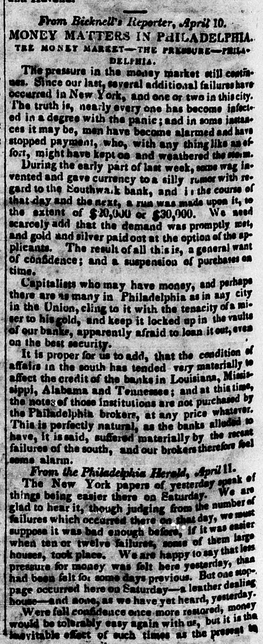 From Bicknell's Reporter, April 10. MONEY MATTERS IN PHILADELPHIA. TRE MONEY MARKET-THE DELPHIA. The pressure in the money market will contin. use. Since our last, several additional failures have occurred in New York, and one or two in this city. The truth is, nearly every one has become infect. ed in a degree with the panic; and in some instances it may be, men have become alarmed and have stopped payment, who, with any thing like an of fort, might have keptoo and weathered the nam. During the early part of last week, same wag in. vented and gave currency to a silly rumor with re. gard to the Southwa.k bank, and is the course or that day and the next, a EMAS was made upon it, to the extent of $20,000 or $30,000. We need scarcely add that the demand was promptly met, and gold and silver paid out at the option of the applicants. The result of all thisis, a general want of confidence; and a suspension of purebases on time. Capitaliess who may have money, and perhaps there are as many in Philadelphia as in any city in the Union, cling to it with the tenacity of a mi. ser to hisgold, and keep it locked up in the vaults of our banke, apparently afraid to loan it out,oven on the best security. It is proper for us to add, that the condition of affairs in the south has tended very materially w affect the credit of the banks in Louisiana, Minis sippi, Alabama and Tennessee; and at this time, the notes of those institutions are not purchased by the Philadelphia brokers, at any price whatever. This is perfectly natural, as the banks alluded 10 have, it is said, suffered materially by the recent failures of the south, and our brokers therefore feel some alarm. From the Philadelphia Herald, April 11. The New York papers of yesterday speak are of We things being easier there on Saturday. glad to hear it, though judging from the number of failures which occurred there on that day, we must suppose it was bad enough before, If it was easier when ten or twelve failures, some of them large houses, took place. Weare happy to say that less pressure for money was felt here yesterday, than had been felt for some days previous. But one stop page occurred here on Saturday-2 leather dealing house-and none, as we have yet heard, yesterday. Were full confidence once more resored, money would be tolerably easy again with u but it is the Inovitable effect of such times as the promat n