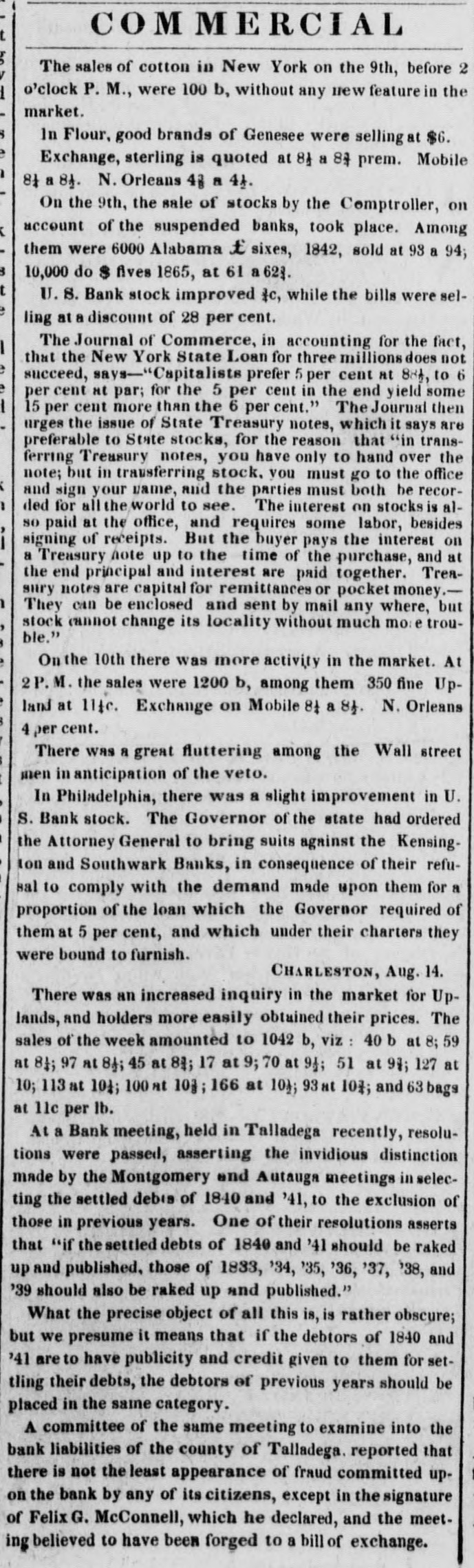 COMMERCIAL t 5 The sales of cotton in New York on the 9th, before 2 1 o'clock P. M., were 100 b, without any new feature in the market. 8 In Flour, good brands of Genesee were selling at $6. Exchange, sterling is quoted at 8 a 81 prem. Mobile I 81 a 8f. N. Orleans 4g a 41. On the 9th, the sale of stocks by the Comptroller, on < account of the suspended banks, took place. Among them were 6000 Alabama £ sixes, 1842, sold at 93 a 94; 8 10,000 do $ Aves 1865, at 61 a 62g. t U.S. Bank stock improved 4c, while the bills were sele ling at a discount of 28 per cent. The Journal of Commerce, in accounting for the fact, that the New York State Loan for three millions does not succeed, says-"Capitalists prefer 5 per cent at 8H to 6 e per cent at par; for the 5 per cent in the end yield some I 15 per cent more than the 6 per cent." The Journal then urges the issue of State Treasury notes, which it says are preferable to State stocks, for the reason that "in transferring Treasury notes, you have only to hand over the note; but in transferring stock, you must go to the office and sign your name, and the parties must both be recorI ded for all the world to see. The interest on stocks is also paid at the office, and requires some labor, besides I signing of receipts. But the buyer pays the interest on a Treasury note up to the time of the purchase, and at the end principal and interest are paid together. Treasury notes are capital for remittances or pocket money.1 They can be enclosed and sent by mail any where, but , stock cannot change its locality without much more trouble." I : On the 10th there was more activity in the market. At 2P. M. the sales were 1200 b, among them 350 fine Upland at 11tc. Exchange on Mobile 8t a 81. N. Orleans 4 per cent. There was a great fluttering among the Wall street men in anticipation of the veto. In Philadelphia, there was a slight improvement in U. S. Bank stock. The Governor of the state had ordered the Attorney General to bring suits against the Kensington and Southwark Banks, in consequence of their refusal to comply with the demand made upon them for a proportion of the loan which the Governor required of them at 5 per cent, and which under their charters they were bound to furnish. CHARLESTON, Aug. 14. There was an increased inquiry in the market for Uplands, and holders more easily obtained their prices. The sales of the week amounted to 1042 b, viz : 40 b at 8; 59 at 81; 97 at 8₦; 45 at 81; 17 at 9; 70 at 94; 51 at 97; 127 at 10; 113 at 101; 100 at 10g; 166 at 10); 93 at 101; and 63 bags at 11c per lb. At a Bank meeting, held in Talladega recently, resolutions were passed, asserting the invidious distinction made by the Montgomery and Autauga meetings in selecting the settled debts of 1840 and '41, to the exclusion of those in previous years. One of their resolutions asserts that "if the settled debts of 1840 and '41 should be raked up and published, those of 1833, '34, '35, '36, '37, 38, and '39 should also be raked up and published." What the precise object of all this is, is rather obscure; but we presume it means that if the debtors of 1840 and '41 are to have publicity and credit given to them for settling their debts, the debtors of previous years should be placed in the same category. A committee of the same meeting to examine into the bank liabilities of the county of Talladega. reported that there is not the least appearance of fraud committed upon the bank by any of its citizens, except in the signature of Felix G. McConnell, which he declared, and the meeting believed to have been forged to a bill of exchange.