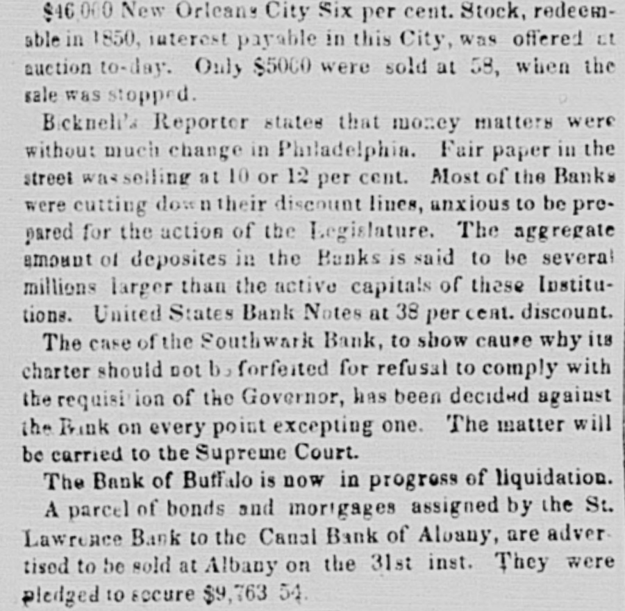 $46,000 New Orleans City Six per cent. Stock, redeemable in 1850, interest payable in this City, was offered at auction to-day. Only $5000 were sold at 58, when the sale was stopped. Bicknell's Reporter states that money matters were without much change in Philadelphia. Fair paper in the street was selling at 10 or 12 per cent. Most of the Banks were cutting dow n their discount lines, anxious to be preeared for the action of the Legislature. The aggregate amount of deposites in the Banks is said to be several millions larger than the active capitals of these Institutions. United States Bank Notes at 38 per ceat. discount. The case of the Southwark Bank, to show cause why its charter should not b, forfeited for refusal to comply with the requisition of the Governor, has been decided against the Prink on every point excepting one. The matter will be carried to the Supreme Court. The Bank of Buffalo is now in progress of liquidation. A parcel of bonds and mortgages assigned by the St. Lawrence Bank to the Canal Bank of Aloany, are adver tised to be sold at Albany on the 31st inst. They were pledged to secure $9,763 54.