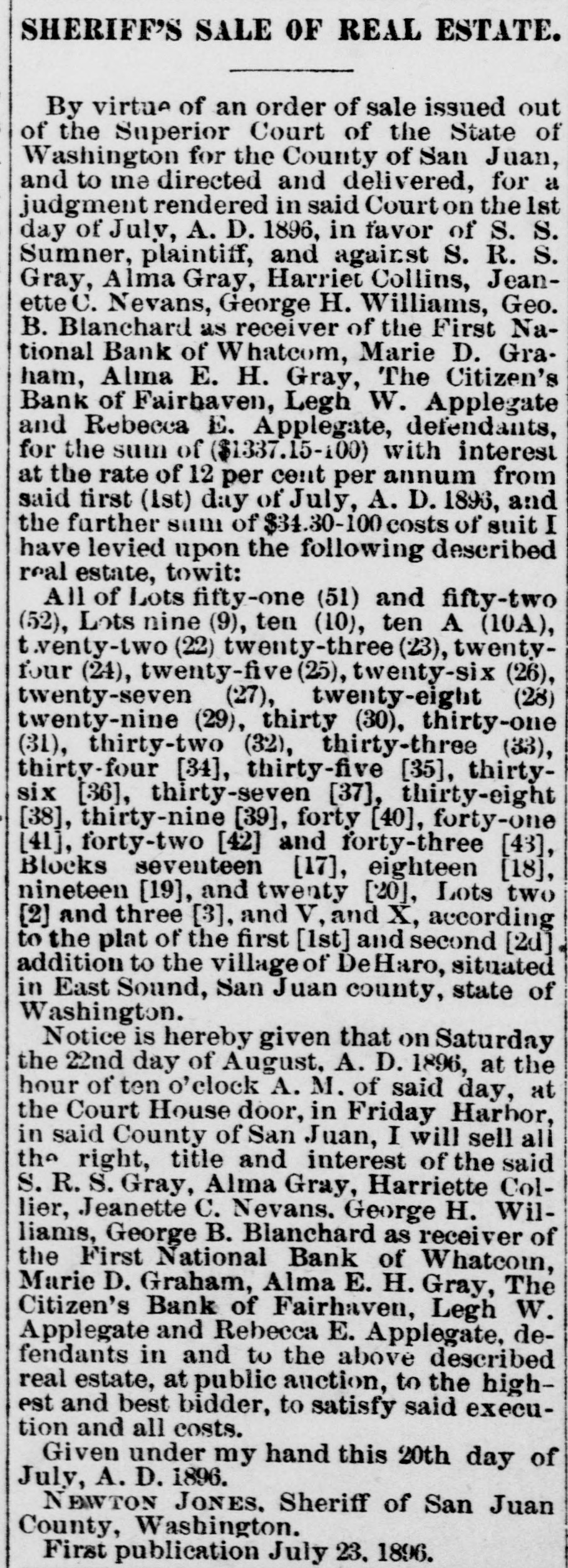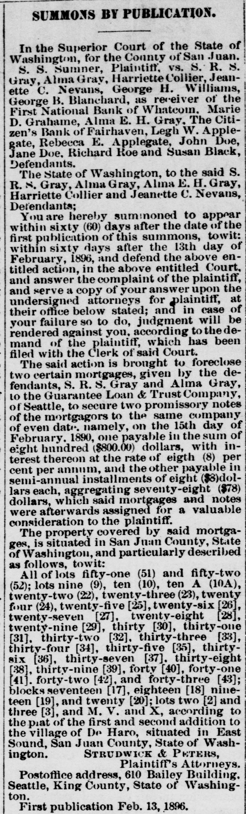 S. S. Sumner, Plaintiff, vs. S. R. S. Gray, Alma Gray, Harriette Collier, Jeanette C. Nevans, George H. Williams, George B. Blanchard, as receiver of the First National Bank of Whatcom, Marie D. Grahame, Alma E. H. Gray, The Citizen's Bank of Fairhaven, Legh W. Applegate, Rebecca E. Applegate, John Doe, Jane Doe, Richard Roe and Susan Black, Defendants.