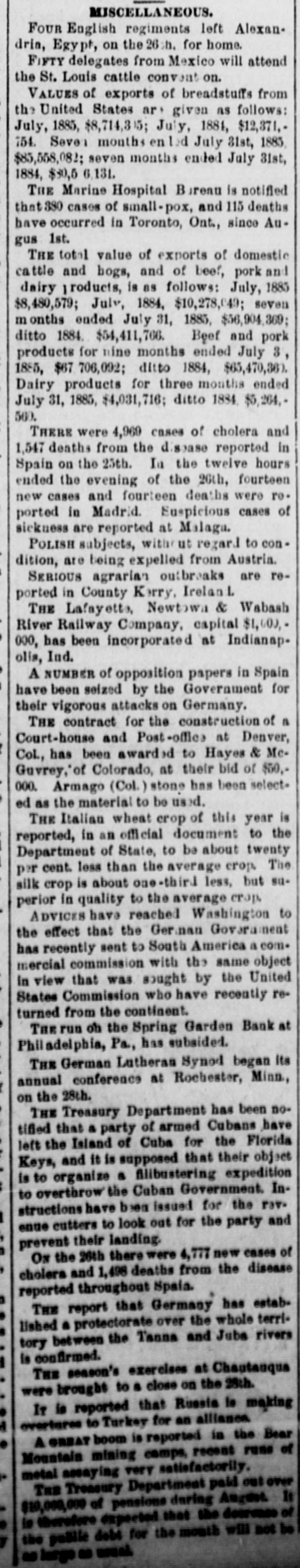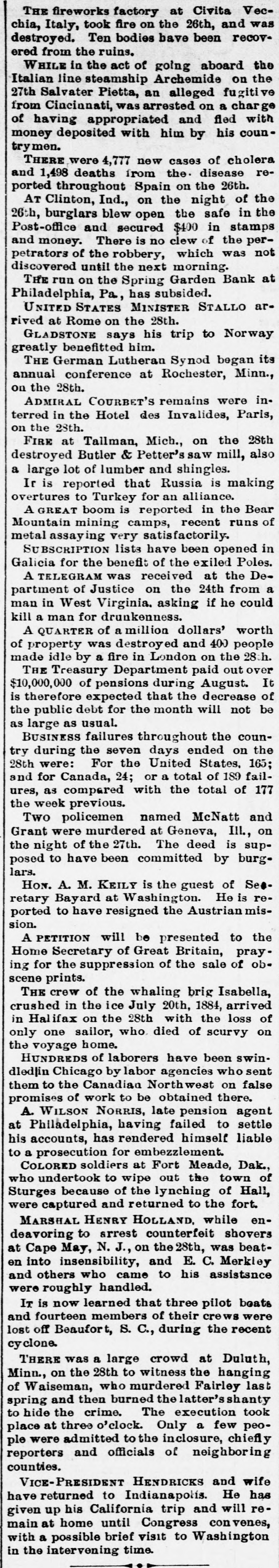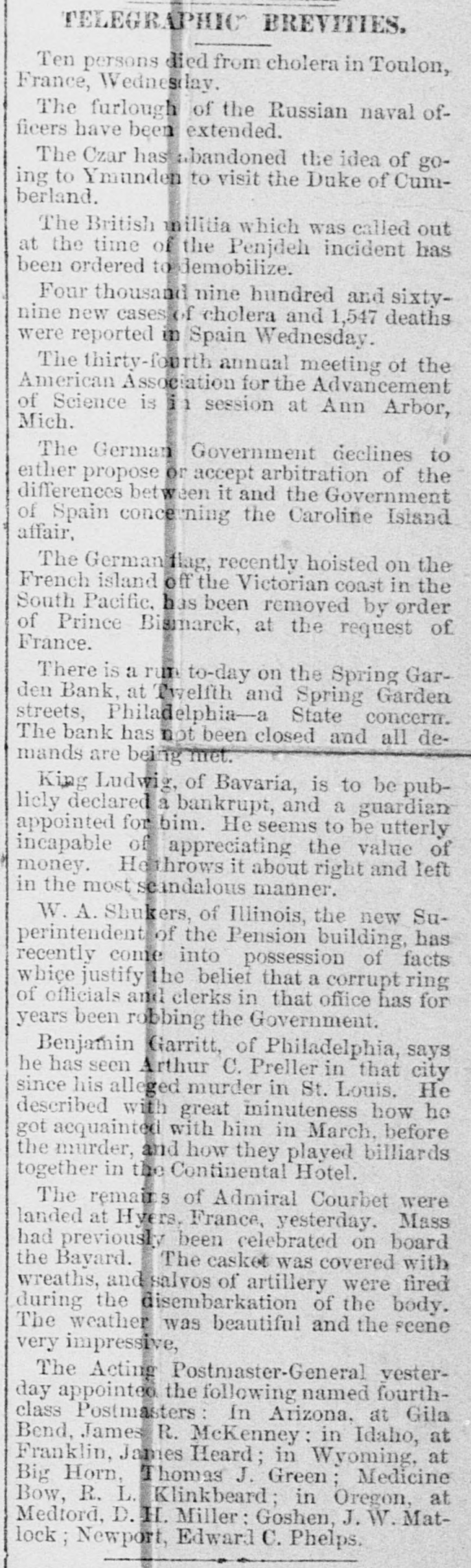 TELEGR (PHIC BREVITIES. Ten persons died from cholera in Toulon, France, Wednesday. The furlough of the Russian naval officers have been extended. The Czar has .bandoned the idea of going to Ymunden to visit the Duke of Cumberland. The British militia which was called out at the time of the Penjdeh incident has been ordered to demobilize. Four thousand nine hundred and sixtynine new cases of cholera and 1,547 deaths were reported in Spain Wednesday. The thirty-fourth annual meeting of the American Association for the Advancement of Science is ii session at Ann Arbor, Mich. The German Government declines to either propose or accept arbitration of the differences bet ween it and the Government of Spain conce ning the Caroline Isiand affair, The Germandfag, recently hoisted on the French island off the Victorian coast in the South Pacific, has been removed by order of Prince Bismarck, at the request of France. There is a run to-day on the Spring Garden Bank, at lwelfth and Spring Garden streets, Philadelphia-a State concern. The bank has not been closed and all demands are bei 1g met. King Ludwig, of Bavaria, is to be publicly declared a bankrupt, and a guardian appointed for bim. He seems to be utterly incapable of appreciating the value of money. Heitrows it about right and left in the most scindalous manner. W. A. Shukers, of Illinois, the new Superintendent of the Pension building, has recently come into possession of facts whice justify the belief that a corrupt ring of officials and clerks in that office has for years been robbing the Government. Benjamin Garritt, of Philadelphia, says he has seen Arthur C. Preller in that city since his alleged murder in St. Louis. He described with great minuteness how he got acquainted with him in March. before the murder, and how they played billiards together in the Continental Hotel. The remains of Admiral Courbet were landed at Hyers, France, yesterday. Mass had previously been celebrated on board the Bayard. The casket was covered with wreaths, and salvos of artillery were fired during the disembarkation of the body. The weather was beautiful and the scene very impressive, The Acting Postmaster-General vesterday appointed the following named fourthclass Postmasters : In Arizona. at Gila Bend, James R. McKenney : in Idaho, at Franklin, James Heard; in Wyoming, at Big Horn, Thomas J. Green; Medicine Bow, R. L. Klinkbeard; in Oregon, at Mediord, D. H. Miller: Goshen, J. W. Matlock; Newport, Edward C. Phelps.