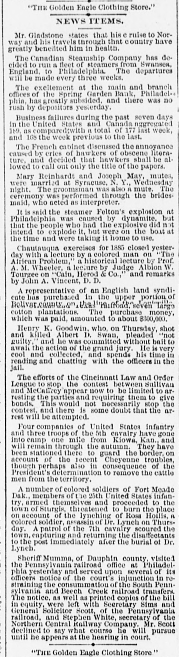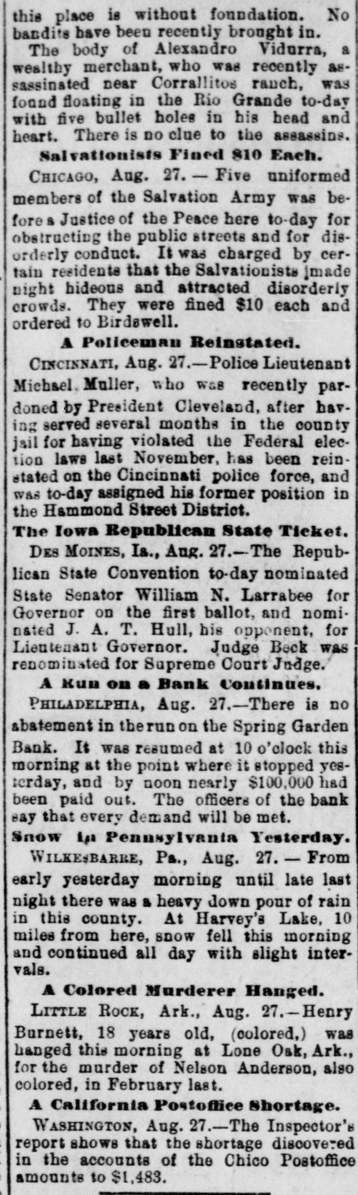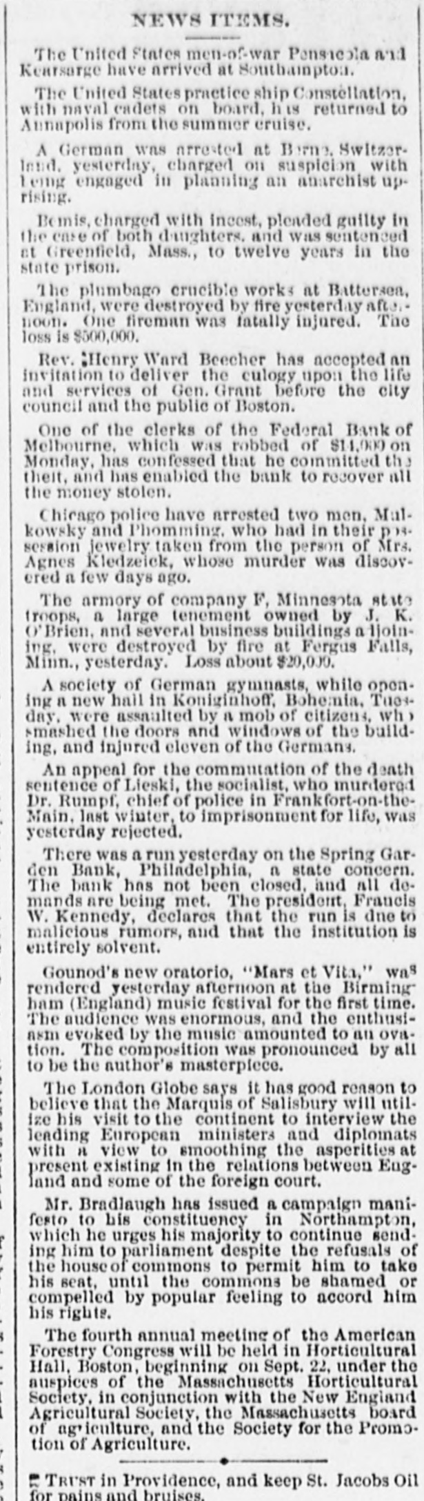 TELEGR (PHIC BREVITIES. Ten persons died from cholera in Toulon, France, Wednesday. The furlough of the Russian naval officers have been extended. The Czar has .bandoned the idea of going to Ymunden to visit the Duke of Cumberland. The British militia which was called out at the time of the Penjdeh incident has been ordered to demobilize. Four thousand nine hundred and sixtynine new cases of cholera and 1,547 deaths were reported in Spain Wednesday. The thirty-fourth annual meeting of the American Association for the Advancement of Science is ii session at Ann Arbor, Mich. The German Government declines to either propose or accept arbitration of the differences bet ween it and the Government of Spain conce ning the Caroline Isiand affair, The Germandfag, recently hoisted on the French island off the Victorian coast in the South Pacific, has been removed by order of Prince Bismarck, at the request of France. There is a run to-day on the Spring Garden Bank, at lwelfth and Spring Garden streets, Philadelphia-a State concern. The bank has not been closed and all demands are bei 1g met. King Ludwig, of Bavaria, is to be publicly declared a bankrupt, and a guardian appointed for bim. He seems to be utterly incapable of appreciating the value of money. Heitrows it about right and left in the most scindalous manner. W. A. Shukers, of Illinois, the new Superintendent of the Pension building, has recently come into possession of facts whice justify the belief that a corrupt ring of officials and clerks in that office has for years been robbing the Government. Benjamin Garritt, of Philadelphia, says he has seen Arthur C. Preller in that city since his alleged murder in St. Louis. He described with great minuteness how he got acquainted with him in March. before the murder, and how they played billiards together in the Continental Hotel. The remains of Admiral Courbet were landed at Hyers, France, yesterday. Mass had previously been celebrated on board the Bayard. The casket was covered with wreaths, and salvos of artillery were fired during the disembarkation of the body. The weather was beautiful and the scene very impressive, The Acting Postmaster-General vesterday appointed the following named fourthclass Postmasters : In Arizona. at Gila Bend, James R. McKenney : in Idaho, at Franklin, James Heard; in Wyoming, at Big Horn, Thomas J. Green; Medicine Bow, R. L. Klinkbeard; in Oregon, at Mediord, D. H. Miller: Goshen, J. W. Matlock; Newport, Edward C. Phelps.