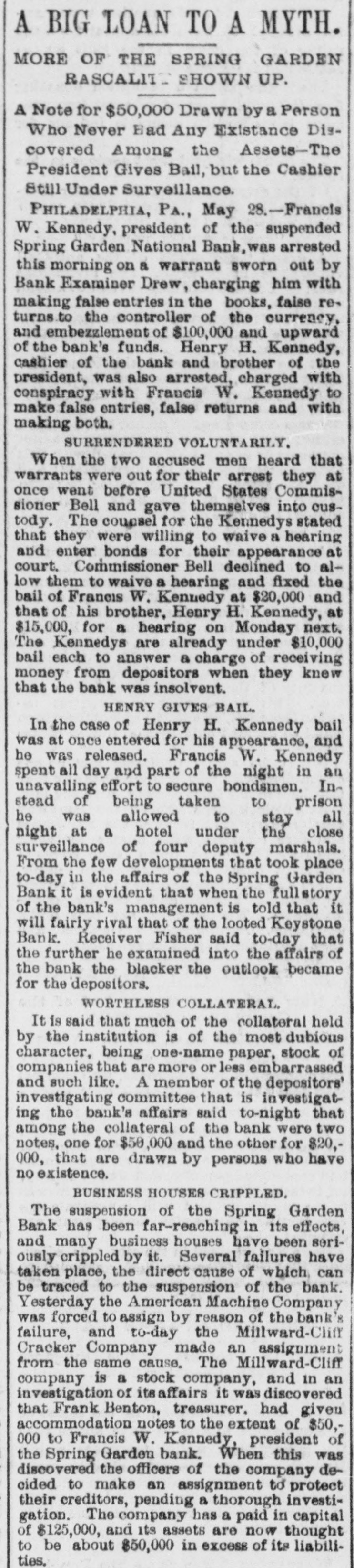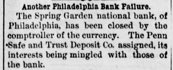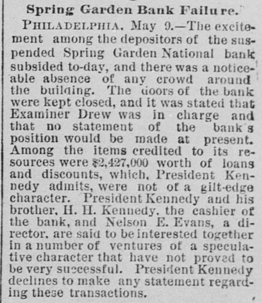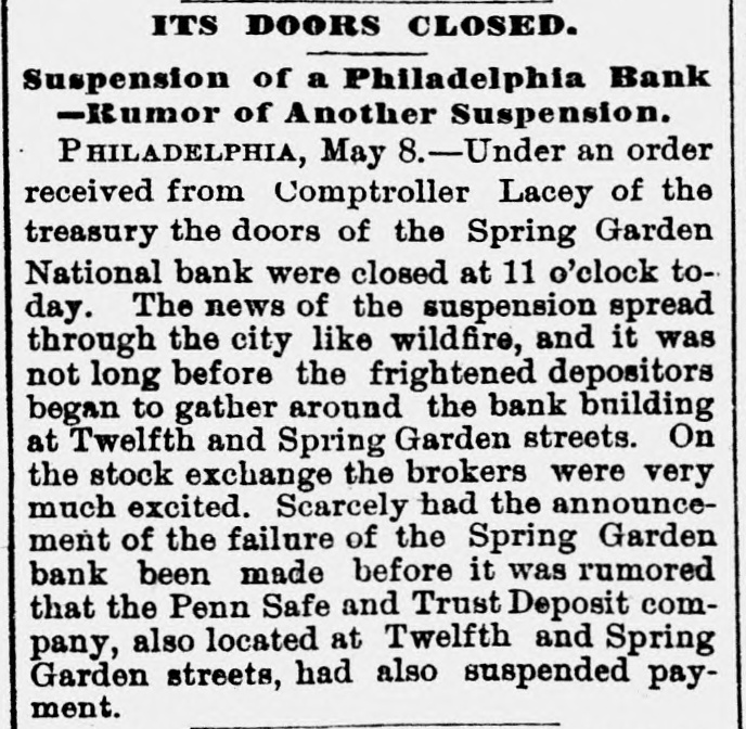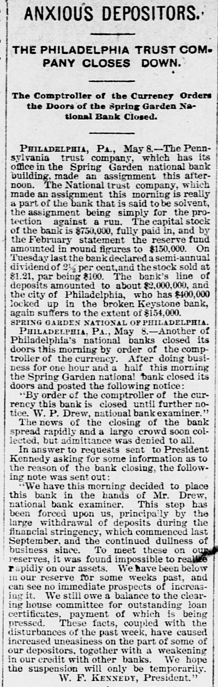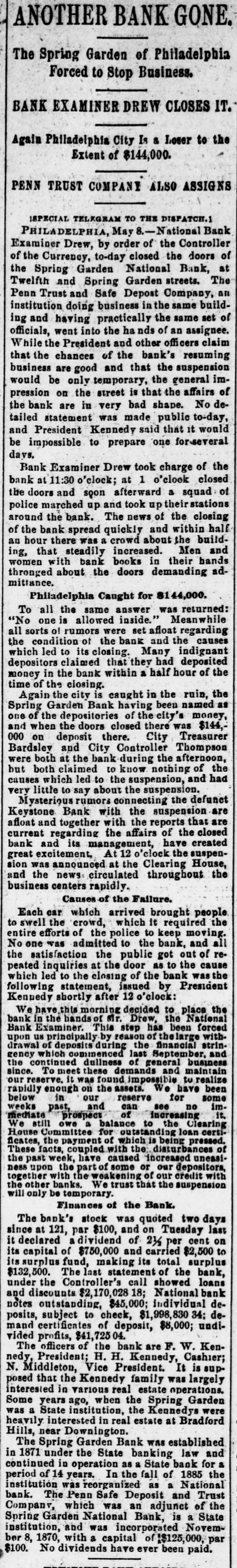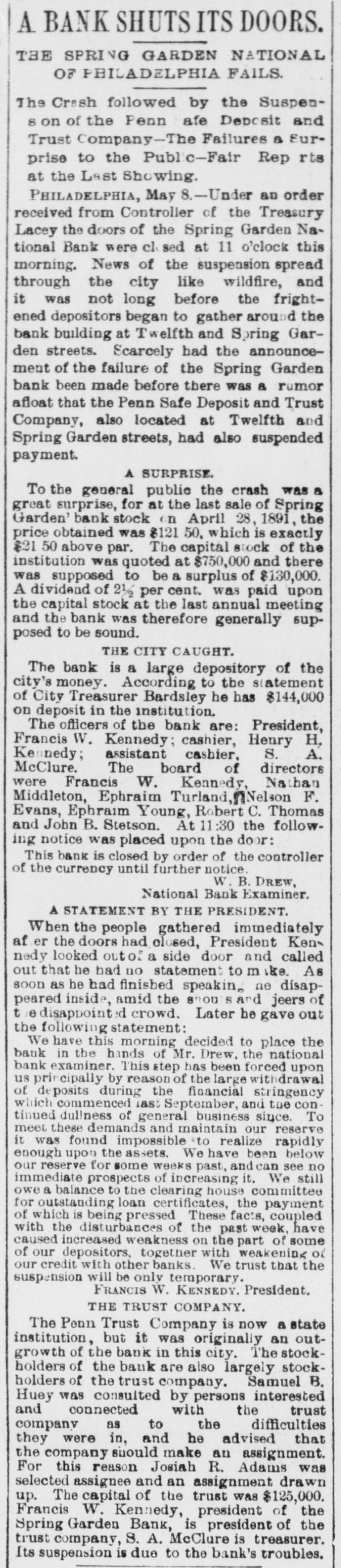 A BANK SHUTSIIS DOORS. THE SPRING GARDEN NATIONAL OF PHILADELPHIA FAILS. The Crash followed by the Suspen8 on of the Penn afe Deposit and Trust Company-The Failures a Eurprise to the Public-Fair Rep rts at the Last Showing. PHILADELPHIA, May 8.-Under an order received from Controller of the Treasury Lacey the doors of the Spring Garden National Bank were cl sed at 11 o'clock this morning. News of the suspension spread through the city like wildfire, and it was not long before the frightened depositors began to gather around the bank building at Twelfth and Spring Garden streets. Scarcely had the announcement of the failure of the Spring Garden bank been made before there was a rumor afloat that the Penn Safe Deposit and Trust Company, also located at Twelfth and Spring Garden streets, had also suspended payment. A SURPRISE. To the general public the crash was a great surprise, for at the last sale of Spring Garden' bank stock on April 28, 1891, the price obtained was $121 50, which is exactly $21 50 above par. The capital stock of the institution was quoted at $750,000 and there was supposed to be a surplus of $130,000. A dividend of 21/2 per cent. was paid upon the capital stock at the last annual meeting and the bank was therefore generally supposed to be sound. THE CITY CAUGHT. The bank is a large depository of the city's money. According to the statement of City Treasurer Bardsley he has $144,000 on deposit in the institution. The officers of the bank are: President, Francis W. Kennedy; cashier, Henry H, Kennedy; assistant cashier, S. A. McClure. The board of directors were Francis W. Kennedy, Nathan Middleton, Ephraim Turland, Nelson F. Evans, Ephraim Young, Robert C. Thomas and John B. Stetson. At 11:30 the following notice was placed upon the door: This bank is closed by order of the controller of the currency until further notice. W. B. DREW, National Bank Examiner. A STATEMENT BY THE PRESIDENT. When the people gathered immediately af er the doors had closed, President Kens nedy looked outof a side door and called out that he had no statement to m ke. As soon as he had finished speaking ne disappeared inside, amid the shou S and jeers of t e disappoint crowd. Later he gave out the following statement: We have this morning decided to place the bank in the hands of Mr. Drew. the national bank examiner. This step has been forced upon us principally by reason of the large withdrawal of deposits during the financial stringency which commenced last September, and the continued dullness of general business since. To meet these demands and maintain our reserve it was found impossible to realize rapidly enough upon the assets. We have been below our reserve for some weeks past, and can see no immediate prospects of increasing it. We still owe a balance to the clearing house committee for outstanding loan certificates, the payment of which is being pressed These facts, coupled with the disturbances of the past week, have caused increased weakness on the part of some of our depositors, together with weakening of our credit with other banks. We trust that the suspension will be only temporary. FRANCIS W. KENNEDY, President. THE TRUST COMPANY. The Penn Trust Company is now a state institution, but it was originally an outgrowth of the bank in this city. The stockholders of the bank are also largely stockholders of the trust company. Samuel B. Huey was consulted by persons interested and connected with the trust company 88 to the di