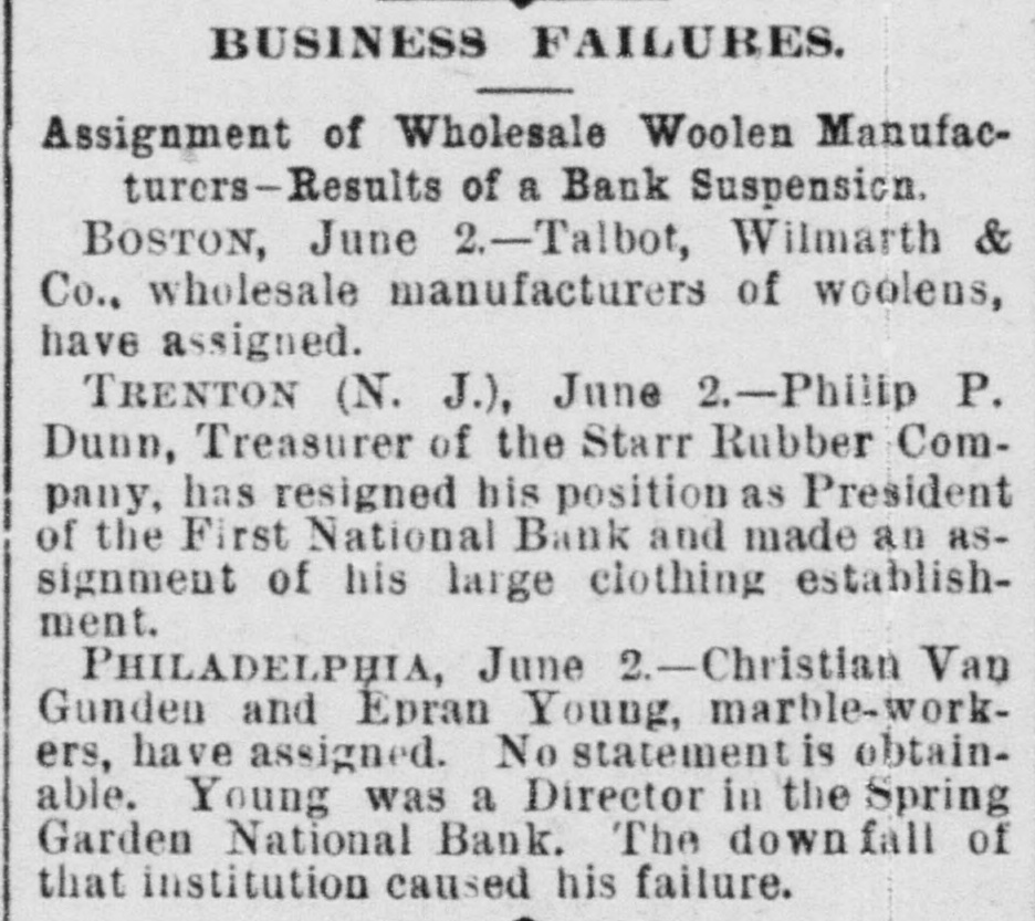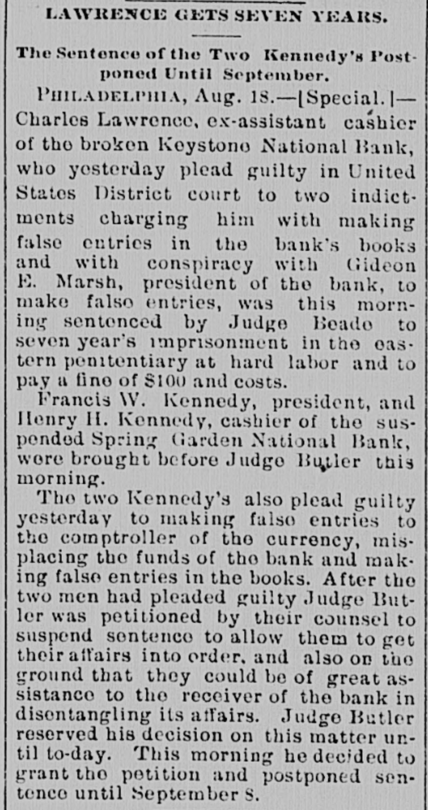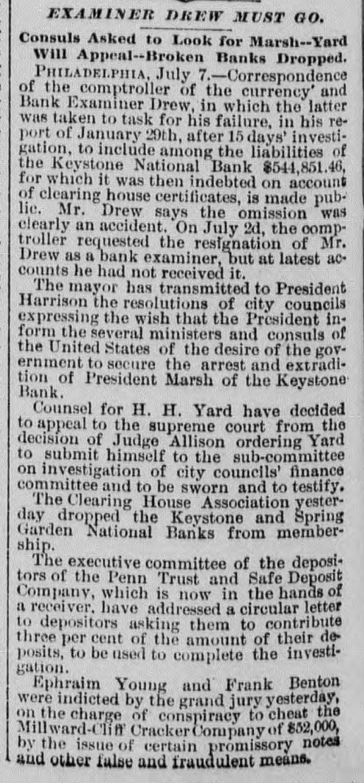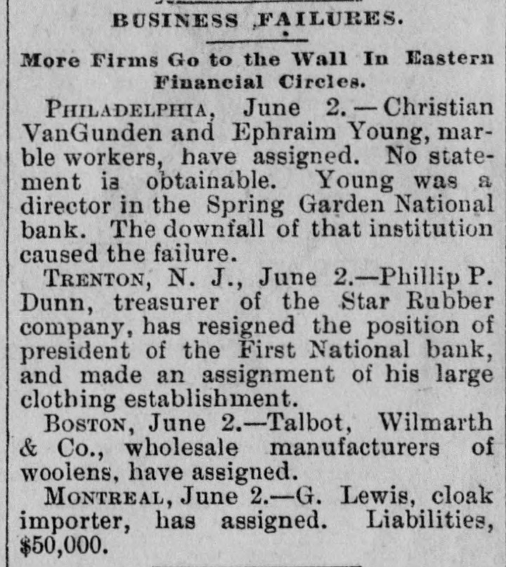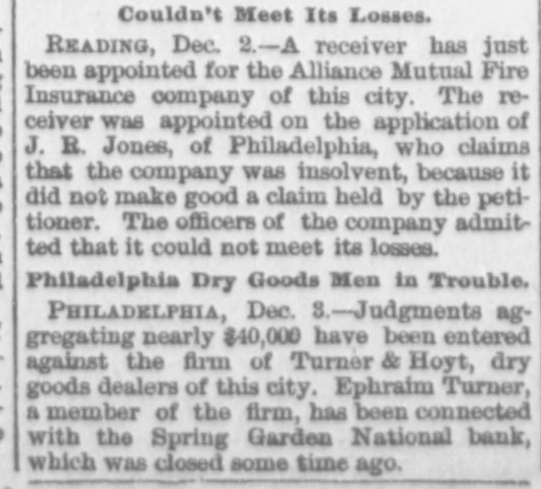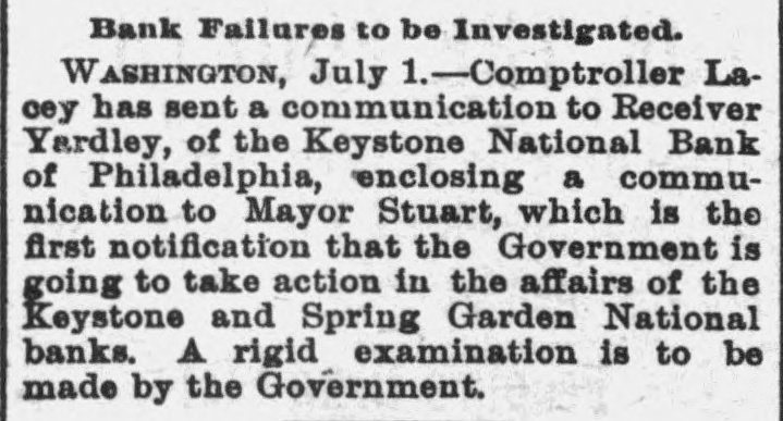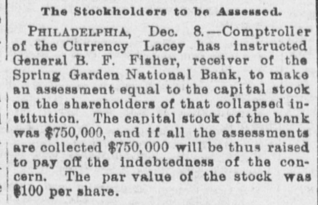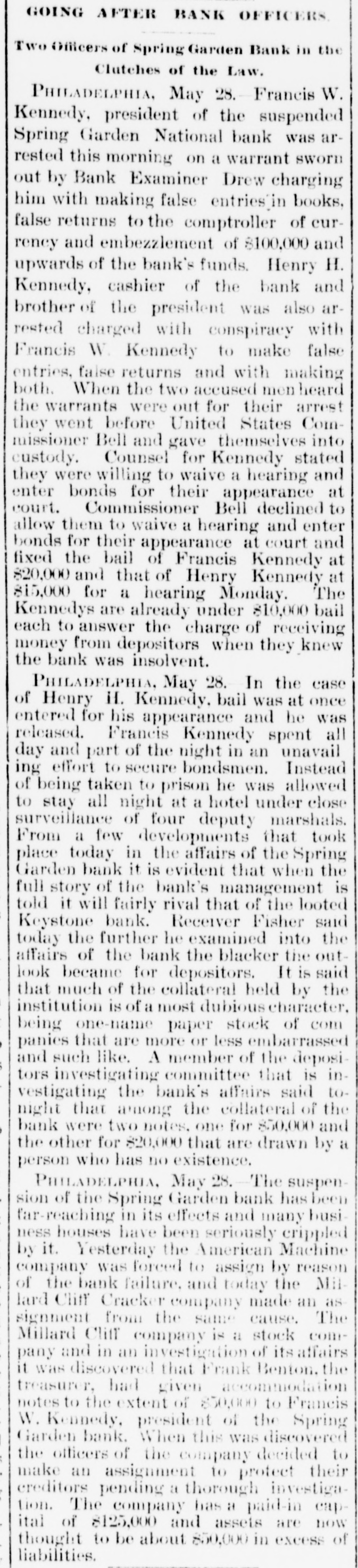 A BANK SHUTSIIS DOORS. THE SPRING GARDEN NATIONAL OF PHILADELPHIA FAILS. The Crash followed by the Suspen8 on of the Penn afe Deposit and Trust Company-The Failures a Eurprise to the Public-Fair Rep rts at the Last Showing. PHILADELPHIA, May 8.-Under an order received from Controller of the Treasury Lacey the doors of the Spring Garden National Bank were cl sed at 11 o'clock this morning. News of the suspension spread through the city like wildfire, and it was not long before the frightened depositors began to gather around the bank building at Twelfth and Spring Garden streets. Scarcely had the announcement of the failure of the Spring Garden bank been made before there was a rumor afloat that the Penn Safe Deposit and Trust Company, also located at Twelfth and Spring Garden streets, had also suspended payment. A SURPRISE. To the general public the crash was a great surprise, for at the last sale of Spring Garden' bank stock on April 28, 1891, the price obtained was $121 50, which is exactly $21 50 above par. The capital stock of the institution was quoted at $750,000 and there was supposed to be a surplus of $130,000. A dividend of 21/2 per cent. was paid upon the capital stock at the last annual meeting and the bank was therefore generally supposed to be sound. THE CITY CAUGHT. The bank is a large depository of the city's money. According to the statement of City Treasurer Bardsley he has $144,000 on deposit in the institution. The officers of the bank are: President, Francis W. Kennedy; cashier, Henry H, Kennedy; assistant cashier, S. A. McClure. The board of directors were Francis W. Kennedy, Nathan Middleton, Ephraim Turland, Nelson F. Evans, Ephraim Young, Robert C. Thomas and John B. Stetson. At 11:30 the following notice was placed upon the door: This bank is closed by order of the controller of the currency until further notice. W. B. DREW, National Bank Examiner. A STATEMENT BY THE PRESIDENT. When the people gathered immediately af er the doors had closed, President Kens nedy looked outof a side door and called out that he had no statement to m ke. As soon as he had finished speaking ne disappeared inside, amid the shou S and jeers of t e disappoint crowd. Later he gave out the following statement: We have this morning decided to place the bank in the hands of Mr. Drew. the national bank examiner. This step has been forced upon us principally by reason of the large withdrawal of deposits during the financial stringency which commenced last September, and the continued dullness of general business since. To meet these demands and maintain our reserve it was found impossible to realize rapidly enough upon the assets. We have been below our reserve for some weeks past, and can see no immediate prospects of increasing it. We still owe a balance to the clearing house committee for outstanding loan certificates, the payment of which is being pressed These facts, coupled with the disturbances of the past week, have caused increased weakness on the part of some of our depositors, together with weakening of our credit with other banks. We trust that the suspension will be only temporary. FRANCIS W. KENNEDY, President. THE TRUST COMPANY. The Penn Trust Company is now a state institution, but it was originally an outgrowth of the bank in this city. The stockholders of the bank are also largely stockholders of the trust company. Samuel B. Huey was consulted by persons interested and connected with the trust company 88 to the di