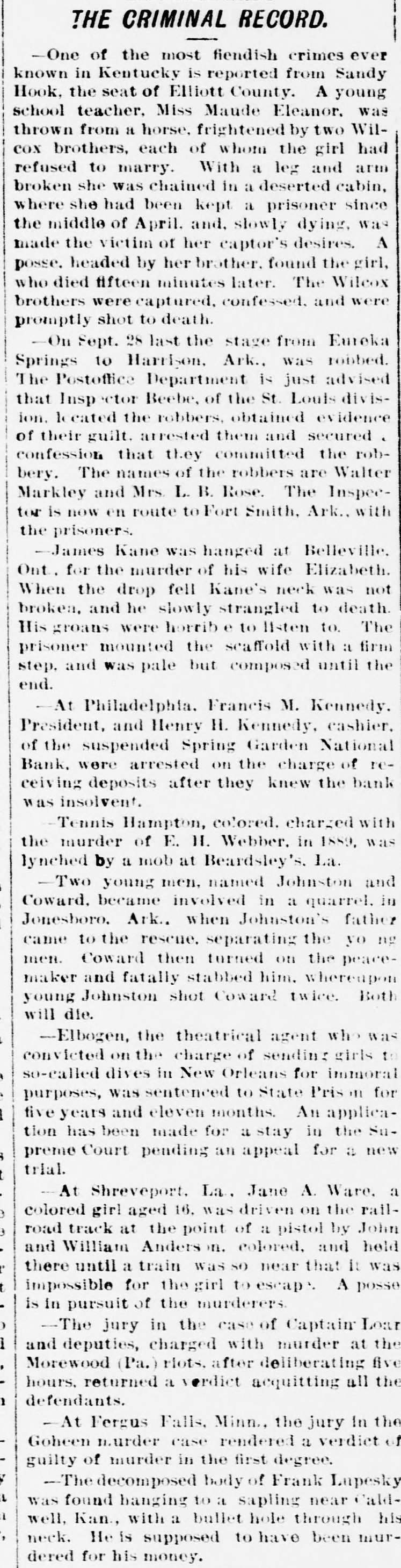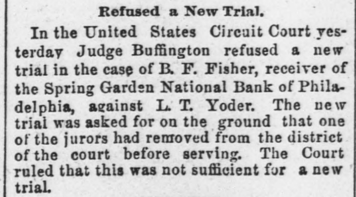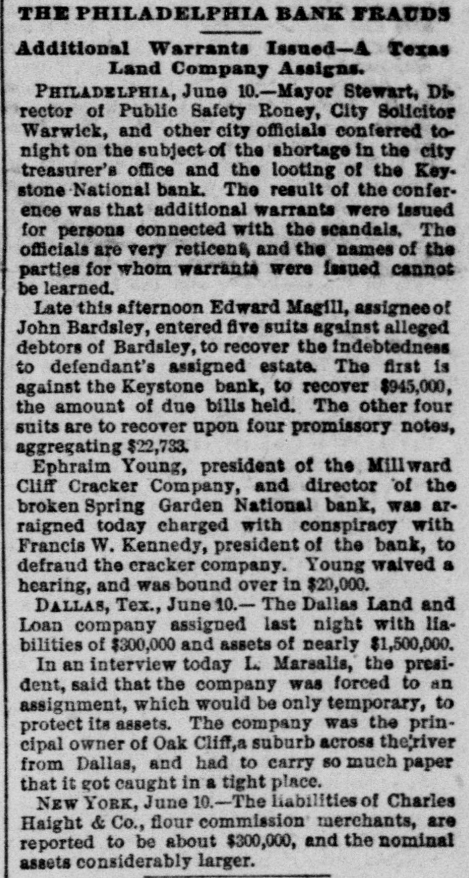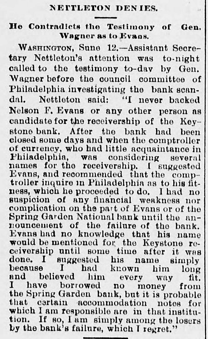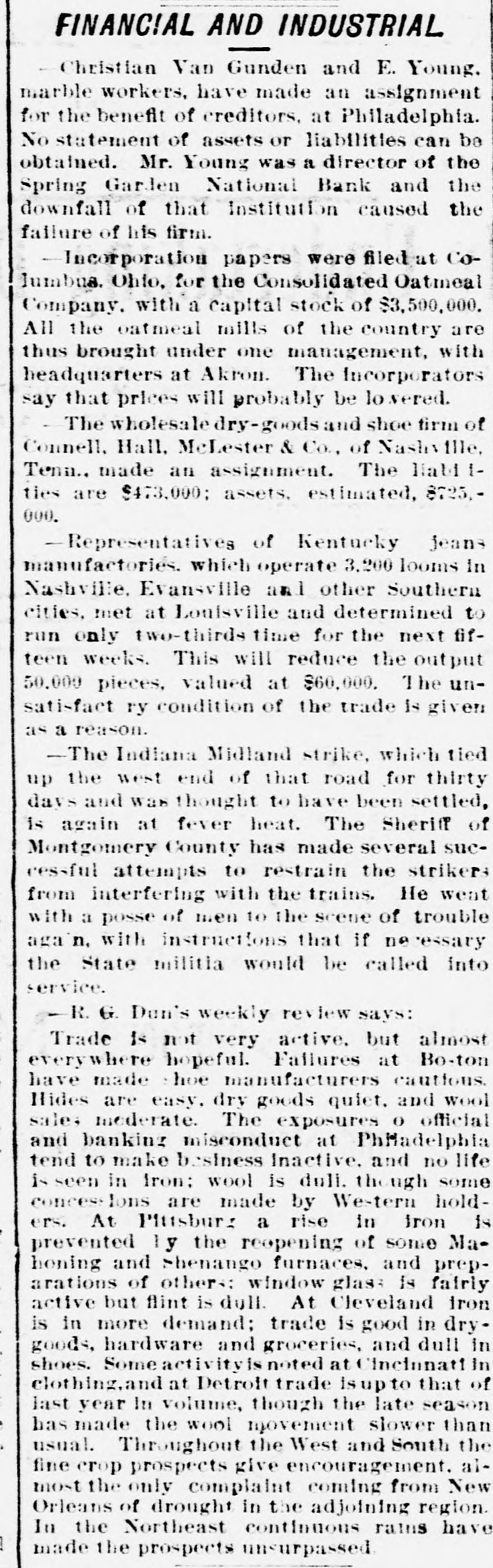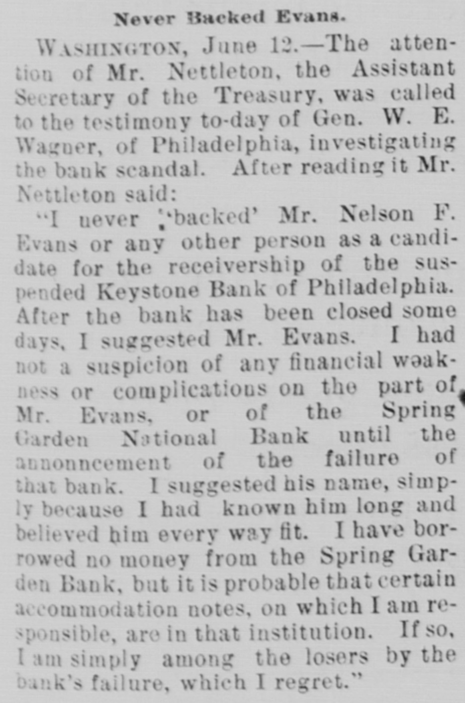 A BANK SHUTSIIS DOORS. THE SPRING GARDEN NATIONAL OF PHILADELPHIA FAILS. The Crash followed by the Suspen8 on of the Penn afe Deposit and Trust Company-The Failures a Eurprise to the Public-Fair Rep rts at the Last Showing. PHILADELPHIA, May 8.-Under an order received from Controller of the Treasury Lacey the doors of the Spring Garden National Bank were cl sed at 11 o'clock this morning. News of the suspension spread through the city like wildfire, and it was not long before the frightened depositors began to gather around the bank building at Twelfth and Spring Garden streets. Scarcely had the announcement of the failure of the Spring Garden bank been made before there was a rumor afloat that the Penn Safe Deposit and Trust Company, also located at Twelfth and Spring Garden streets, had also suspended payment. A SURPRISE. To the general public the crash was a great surprise, for at the last sale of Spring Garden' bank stock on April 28, 1891, the price obtained was $121 50, which is exactly $21 50 above par. The capital stock of the institution was quoted at $750,000 and there was supposed to be a surplus of $130,000. A dividend of 21/2 per cent. was paid upon the capital stock at the last annual meeting and the bank was therefore generally supposed to be sound. THE CITY CAUGHT. The bank is a large depository of the city's money. According to the statement of City Treasurer Bardsley he has $144,000 on deposit in the institution. The officers of the bank are: President, Francis W. Kennedy; cashier, Henry H, Kennedy; assistant cashier, S. A. McClure. The board of directors were Francis W. Kennedy, Nathan Middleton, Ephraim Turland, Nelson F. Evans, Ephraim Young, Robert C. Thomas and John B. Stetson. At 11:30 the following notice was placed upon the door: This bank is closed by order of the controller of the currency until further notice. W. B. DREW, National Bank Examiner. A STATEMENT BY THE PRESIDENT. When the people gathered immediately af er the doors had closed, President Kens nedy looked outof a side door and called out that he had no statement to m ke. As soon as he had finished speaking ne disappeared inside, amid the shou S and jeers of t e disappoint crowd. Later he gave out the following statement: We have this morning decided to place the bank in the hands of Mr. Drew. the national bank examiner. This step has been forced upon us principally by reason of the large withdrawal of deposits during the financial stringency which commenced last September, and the continued dullness of general business since. To meet these demands and maintain our reserve it was found impossible to realize rapidly enough upon the assets. We have been below our reserve for some weeks past, and can see no immediate prospects of increasing it. We still owe a balance to the clearing house committee for outstanding loan certificates, the payment of which is being pressed These facts, coupled with the disturbances of the past week, have caused increased weakness on the part of some of our depositors, together with weakening of our credit with other banks. We trust that the suspension will be only temporary. FRANCIS W. KENNEDY, President. THE TRUST COMPANY. The Penn Trust Company is now a state institution, but it was originally an outgrowth of the bank in this city. The stockholders of the bank are also largely stockholders of the trust company. Samuel B. Huey was consulted by persons interested and connected with the trust company 88 to the di
