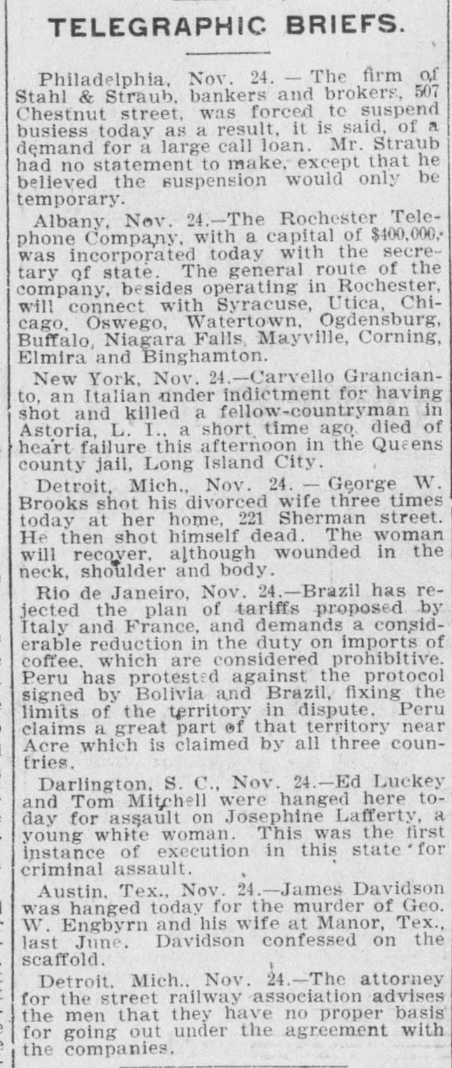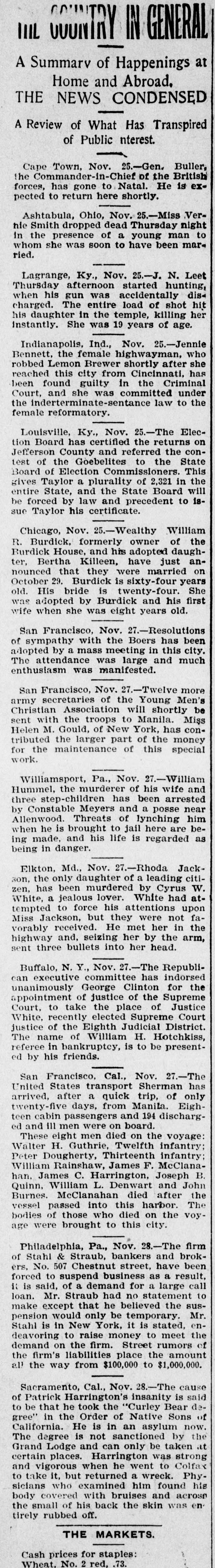IIIL GENERAL IN A Summarv of Happenings at Home and Abroad. THE NEWS CONDENSED A Review of What Has Transpired of Public nterest. Cape Town, Nov. 25.-Gen. Buller, the Commander-in-Chief of the British forces, has gone to Natal. He is expected to return here shortly. Ashtabula, Ohio, Nov. 25.-Miss Vernie Smith dropped dead Thursday night in the presence of a young man to whom she was soon to have been married. Lagrange, Ky., Nov. 25.-J. N. Leet Thursday afternoon started hunting, when his gun was accidentally discharged. The entire load of shot hit his daughter in the temple, killing her instantly. She was 19 years of age. Indianapolis, Ind., Nov. 25.-Jennie Bennett, the female highwayman, who robbed Lemon Brewer shortly after she reached this city from Cincinnati, has been found guilty in the Criminal Court, and she was committed under the inderterminate-sentance law to the female reformatory. Louisville, Ky., Nov. 25.-The Election Board has certified the returns on Jefferson County and referred the contest of the Goebelites to the State Board of Election Commissioners. This gives Taylor a plurality of 2,321 in the entire State, and the State Board will be forced by law and precedent to issue Taylor his certificate. Chicago, Nov. 25.-Wealthy William R. Burdick, formerly owner of the Burdick House, and his adopted daughter, Bertha Killeen, have just announced that they were married on October 29. Burdick is sixty-four years old. His bride is twenty-four. She was adopted by Burdick and his first wife when she was eight years old. San Francisco, Nov. 27.-Resolutions of sympathy with the Boers has been adopted by a mass meeting in this city. The attendance was large and much enthusiasm was manifested. San Francisco, Nov. 27.-Twelve more army secretaries of the Young Men's Christian Association will shortly be sent with the troops to Manila. Miss Helen M. Gould, of New York, has contributed the larger part of the money for the maintenance of this special work. Williamsport, Pa., Nov. 27.-William Hummel, the murderer of his wife and three step-children has been arrested by Constable Meyers and a posse near Allenwood. Threats of lynching him when he is brought to jail here are being made, and his life is regarded as being in danger. Elkton, Md., Nov. 27.-Rhoda Jackson, the only daughter of a leading citizen, has been murdered by Cyrus W. White, a jealous lover. White had attempted to force his attentions upon Miss Jackson, but they were not favorably received. He met her in the highway and, seizing her by the arm, sent three bullets into her head. Buffalo, N. Y., Nov. 27.-The Republican executive committee has indorsed unanimously George Clinton for the appointment of justice of the Supreme Court, to take the place of Justice White, recently elected Supreme Court justice of the Eighth Judicial District. The name of William H. Hotchkiss, referee in bankruptcy, is to be presented by his friends. San Francisco, Cal., Nov. 27.-The United States transport Sherman has arrived, after a quick trip, of only twenty-five days, from Manila. Eighteen cabin passengers and 194 discharged and ill men were on board. These eight men died on the voyage: Walter H. Guthrie, Twelfth infantry; Peter Dougherty, Thirteenth infantry; William Rainshaw, James F. McClanahan, James C. Harrington, Joseph B. Quinn, William L. Denwart and John Burnes. McClanahan died after the vessel passed into this harbor. The bodies of those who died on the voyage were brought to this city. Philadelphia, Pa., Nov. 28.-The firm of Stahl & Straub, bankers and brokers, No. 507 Chestnut street, have been forced to suspend business as a result, it is said, of a demand for a large call loan. Mr. Straub had no statement to make except that he believed the suspension would only be temporary. Mr. Stahl is in New York, it is stated, endeavoring to raise money to meet the demand on the firm. Street rumors of the firm's liabilities place the amount all the way from $100,000 to $1,000,000. Sacramento, Cal., Nov. 28.-The cause of Patrick Harrington's insanity is said to be that he took the "Curley Bear degree" in the Order of Native Sons of California. He is in an asylum now. The degree is not sanctioned by the Grand Lodge and can only be taken at certain places. Harrington was strong