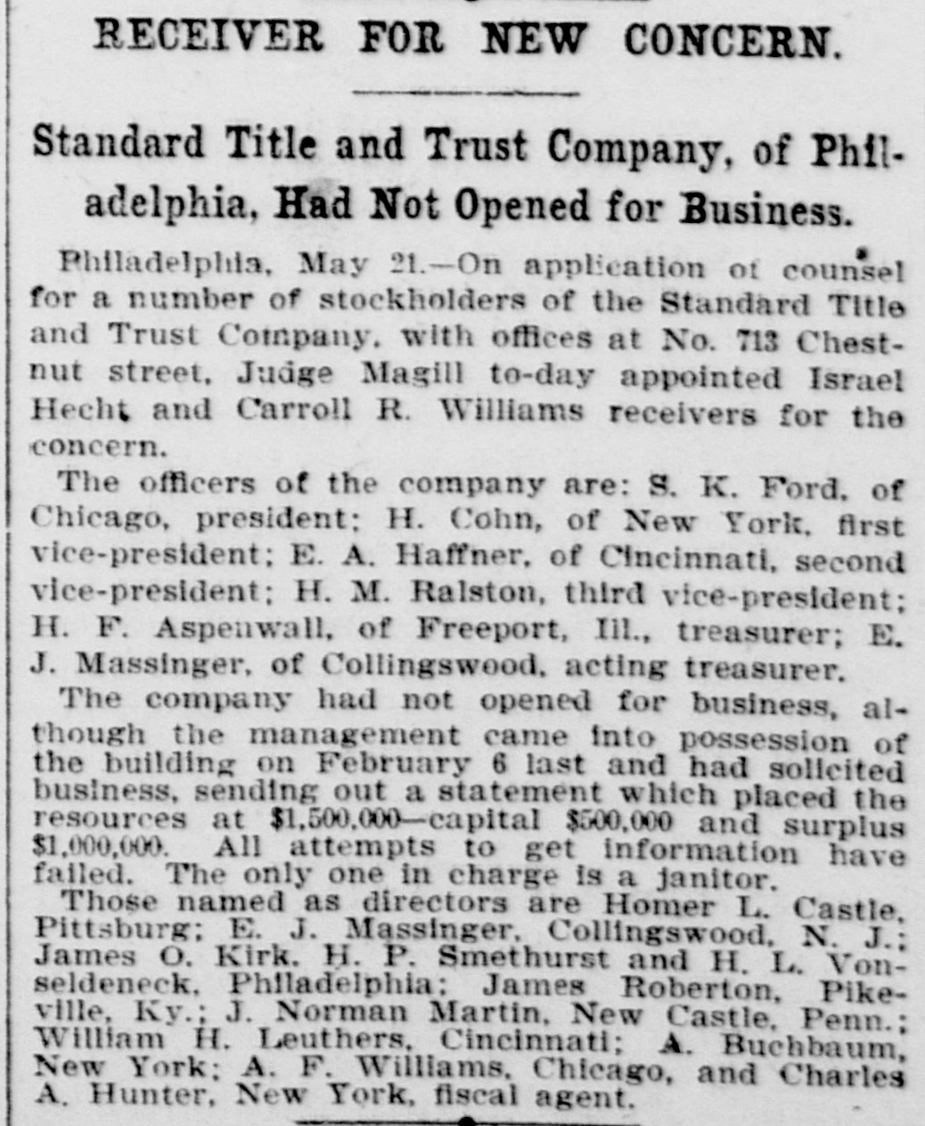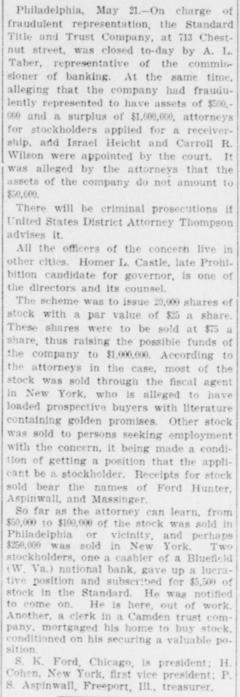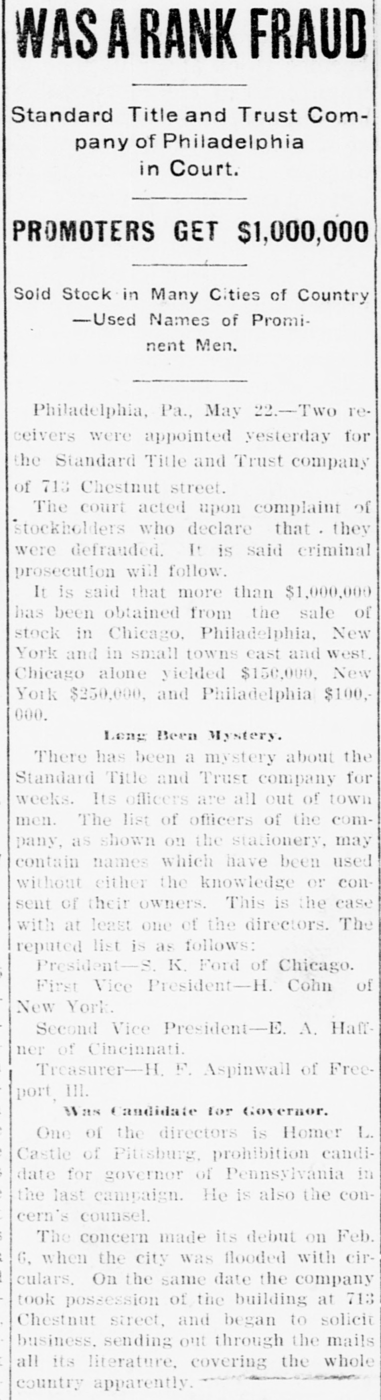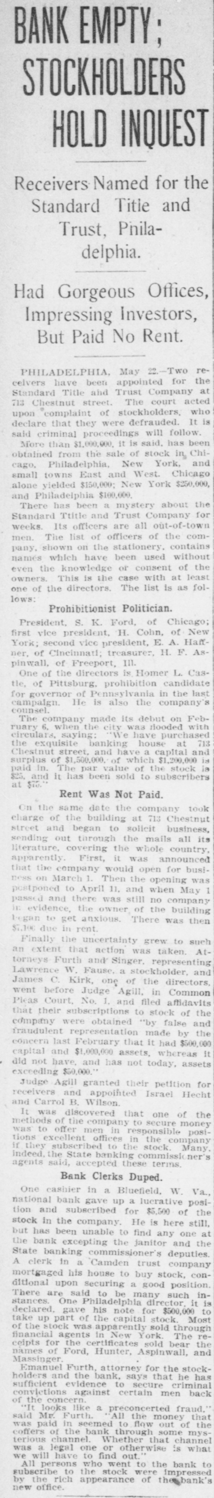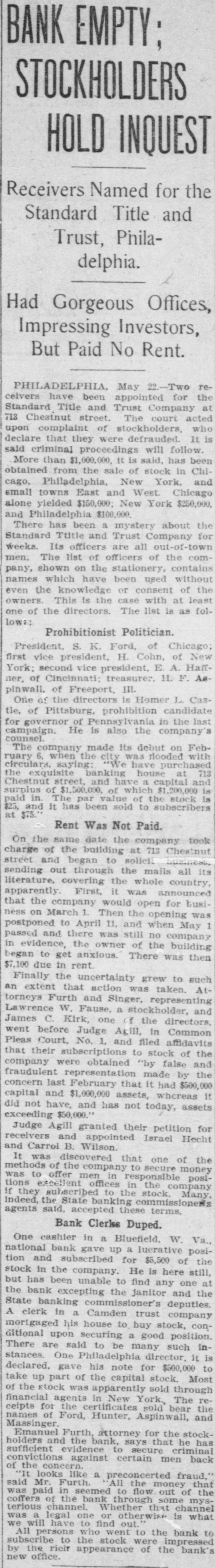 BANK EMPTY; STOCKHOLDERS HOLD INQUEST Receivers Named for the Standard Title and Trust, Philadelphia. Had Gorgeous Offices, Impressing Investors, But Paid No Rent. PHILADELPHIA. May 22. Two receivers have been appointed for the Standard Title and Trust Company at 713 Chestnut street. The court acted upon complaint of stockholders, who declare that they were defrauded. It is said criminal proceedings will follow. More than $1,000,000. it is said. has been obtained from the sale of stock in Chicago. Philadelphia, New York, and small towns East and West. Chicago alone yielded $150,000; New York $250,000. and Philadelphia $100,000 There has been a mystery about the Standard Ttitle and Trust Company for weeks. Its officers are all out-of-town men. The list of officers of the com pany, shown on the stationery, contains names which have been used without even the knowledge or consent of the owners. This is the case with at least one of the directors. The list is as follows: Prohibitionist Politician. President, S. K. Ford, of Chicago first vice president, H. Cohn, of New York: second vice president, E. A. Hall ner. of Cincinnati; treasurer. H. F. Ae pinwall. of Freeport III. One of the directors is Homer L. Castle, of Pittsburg, prohibition candidate for governor of Pennsylvania in the last campaign. He is also the company's counsel. The company made its debut on February 6. when the city was flooded with and circulars. saying: "We have purchased the exquisite banking house at 713 Chestnut street, and have a capital and surplus of $1,500,000, of which $1,200,000 is paid in. The par value of the stock is $25, and it has been sold to subscribers at $75. Rent Was Not Paid. On the same date the company took charge of the building at 713 Chestnut street and began to solicia sending out through the mails all its literature, covering the whole country, apparently. First, it was announced that the company would open for busi. ness on March 1. Then the opening was postponed to April 11, and when May passed and there was still no company in evidence, the owner of the building began to get anxious. There was then $7,100 due in rent. Finally the uncertainty grew to such an extent that action was taken. Attorneys Furth and Singer, representing Lawrence W. Fause, a stockholder, and James C. Kirk, one f the directors, went before Judge Agill, in Common Pleas Court. No. 1. and filed affidavits that their subscriptions to stock of the company were obtained "by false and fraudulent representation made by the concern last February that it had $500,000 capital and $1,000,000 assets, whereas it did not have, and has not today, assets exceeding $50,000.' Judge Agill granted their petition for receivers and appointed Israel Hecht and Carrol B. Wilson. It was discovered that one of the methods of the company to secure money was to offer men in responsible positions excellent offices in the company if they subscribed to the stock. Many indeed, the State banking commissioners agents said, accepted these terms. Bank Clerks Duped. One cashier in a Bluefield, W. Va. national bank gave up a luerative position and subscribed for $5,500 of the stock in the company. He is here still. but has been unable to find any one at the bank excepting the janitor and the State banking commissioner's deputies. A clerk in a Camden trust company mortgaged his house to buy stock, conditional upon securing a good position. There are said to be many such instances. One Philadelphia director. it is declared. gave his note for $500,000 to take up part of the capital stock. Most of the stock was apparently sold through financial agents in New York. The receipts for the certificates sold bear the names of Ford, Hunter, Aspinwall, and Massinger. Emanuel Furth, attorney for the stockholders and the bank. says that he has sufficient evidence to secure criminal convictions against certain men back of the concern. "It looks like a preconcerted fraud, said Mr. Furth All the money that was paid in seemed to flow out of the coffers of the bank through some mysterious channel. Whether that channel was a legal one or otherwise is what we will have to find out. All persons who went to the bank to subscribe to the stock were impressed by the ricir appearance of the bank s new office.
