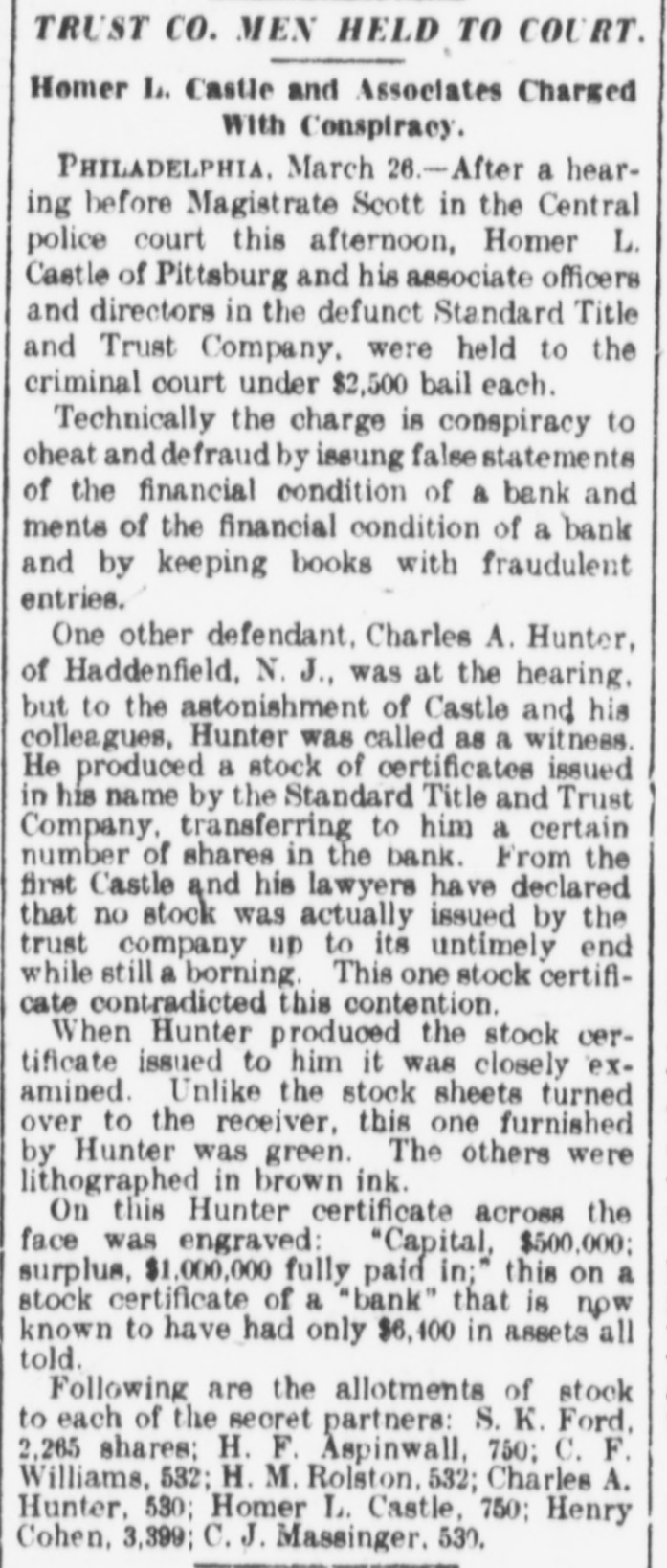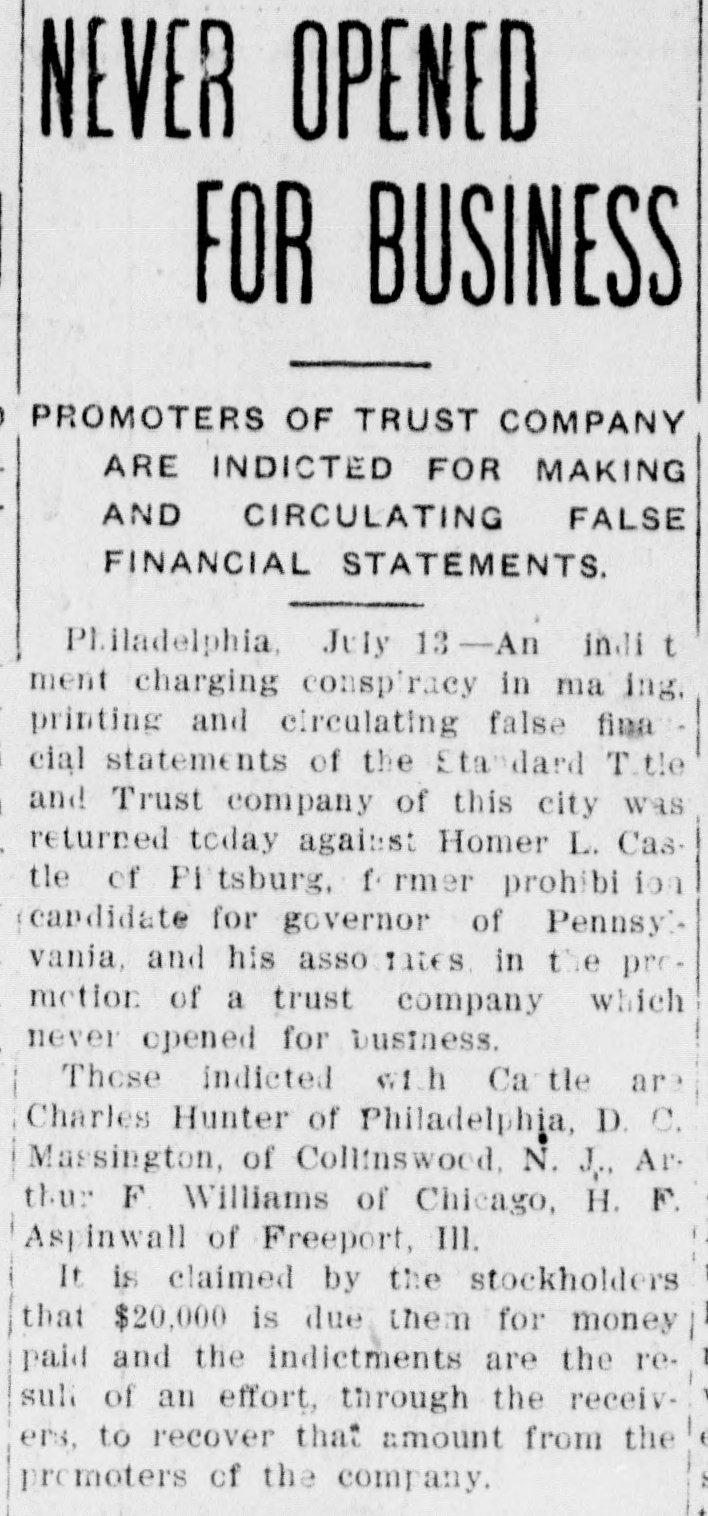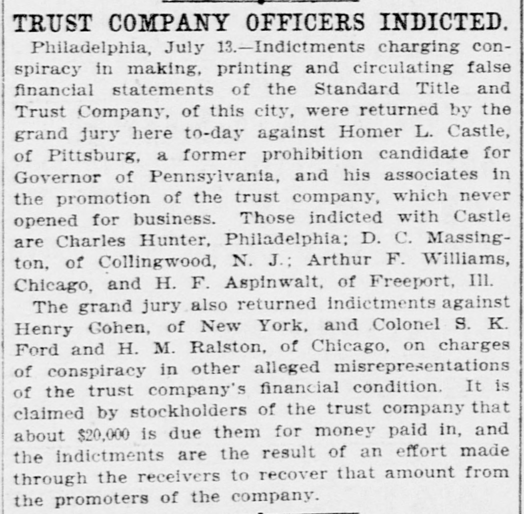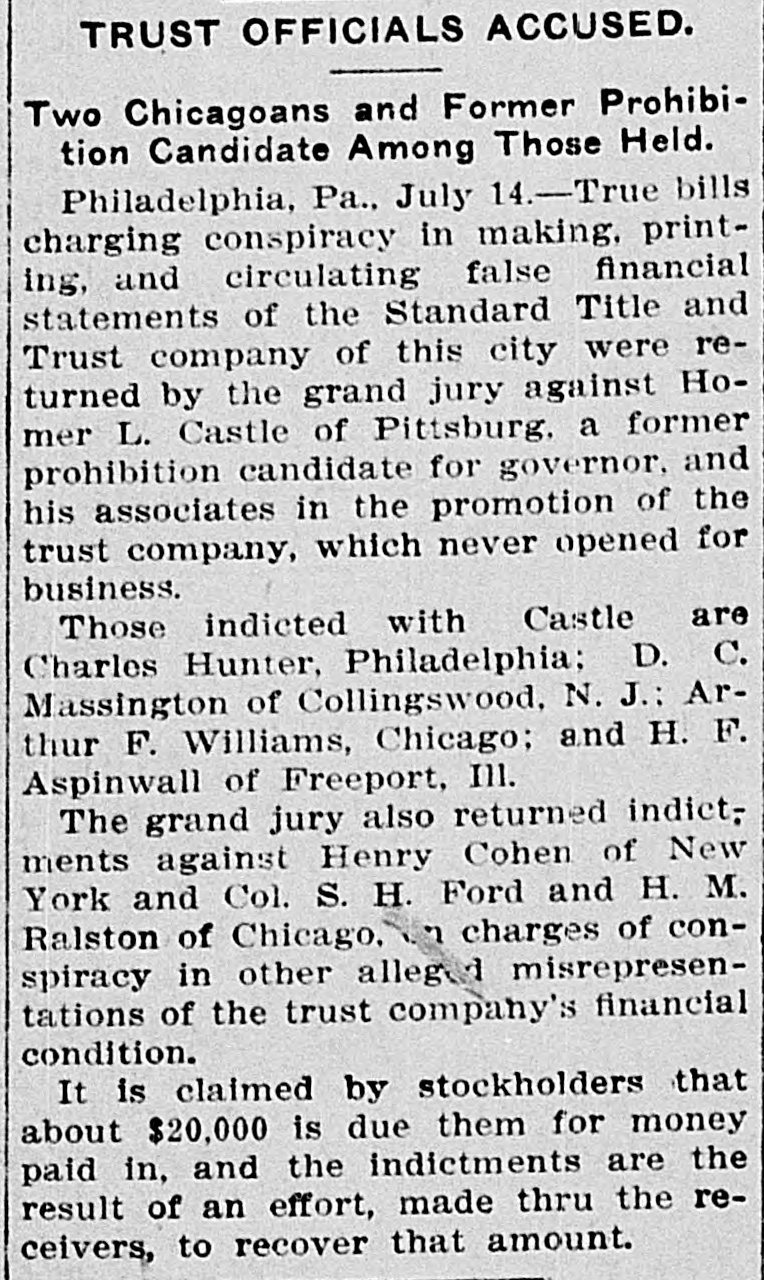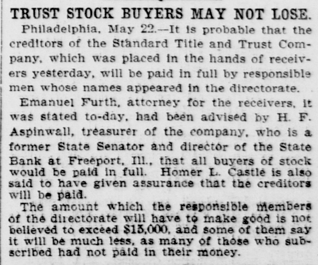 BANK EMPTY; STOCKHOLDERS HOLD INQUEST Receivers Named for the Standard Title and Trust, Philadelphia. Had Gorgeous Offices, Impressing Investors, But Paid No Rent. PHILADELPHIA. May 22. Two receivers have been appointed for the Standard Title and Trust Company at 713 Chestnut street. The court acted upon complaint of stockholders, who declare that they were defrauded. It is said criminal proceedings will follow. More than $1,000,000. it is said. has been obtained from the sale of stock in Chicago. Philadelphia, New York, and small towns East and West. Chicago alone yielded $150,000; New York $250,000. and Philadelphia $100,000 There has been a mystery about the Standard Ttitle and Trust Company for weeks. Its officers are all out-of-town men. The list of officers of the com pany, shown on the stationery, contains names which have been used without even the knowledge or consent of the owners. This is the case with at least one of the directors. The list is as follows: Prohibitionist Politician. President, S. K. Ford, of Chicago first vice president, H. Cohn, of New York: second vice president, E. A. Hall ner. of Cincinnati; treasurer. H. F. Ae pinwall. of Freeport III. One of the directors is Homer L. Castle, of Pittsburg, prohibition candidate for governor of Pennsylvania in the last campaign. He is also the company's counsel. The company made its debut on February 6. when the city was flooded with and circulars. saying: "We have purchased the exquisite banking house at 713 Chestnut street, and have a capital and surplus of $1,500,000, of which $1,200,000 is paid in. The par value of the stock is $25, and it has been sold to subscribers at $75. Rent Was Not Paid. On the same date the company took charge of the building at 713 Chestnut street and began to solicia sending out through the mails all its literature, covering the whole country, apparently. First, it was announced that the company would open for busi. ness on March 1. Then the opening was postponed to April 11, and when May passed and there was still no company in evidence, the owner of the building began to get anxious. There was then $7,100 due in rent. Finally the uncertainty grew to such an extent that action was taken. Attorneys Furth and Singer, representing Lawrence W. Fause, a stockholder, and James C. Kirk, one f the directors, went before Judge Agill, in Common Pleas Court. No. 1. and filed affidavits that their subscriptions to stock of the company were obtained "by false and fraudulent representation made by the concern last February that it had $500,000 capital and $1,000,000 assets, whereas it did not have, and has not today, assets exceeding $50,000.' Judge Agill granted their petition for receivers and appointed Israel Hecht and Carrol B. Wilson. It was discovered that one of the methods of the company to secure money was to offer men in responsible positions excellent offices in the company if they subscribed to the stock. Many indeed, the State banking commissioners agents said, accepted these terms. Bank Clerks Duped. One cashier in a Bluefield, W. Va. national bank gave up a luerative position and subscribed for $5,500 of the stock in the company. He is here still. but has been unable to find any one at the bank excepting the janitor and the State banking commissioner's deputies. A clerk in a Camden trust company mortgaged his house to buy stock, conditional upon securing a good position. There are said to be many such instances. One Philadelphia director. it is declared. gave his note for $500,000 to take up part of the capital stock. Most of the stock was apparently sold through financial agents in New York. The receipts for the certificates sold bear the names of Ford, Hunter, Aspinwall, and Massinger. Emanuel Furth, attorney for the stockholders and the bank. says that he has sufficient evidence to secure criminal convictions against certain men back of the concern. "It looks like a preconcerted fraud, said Mr. Furth All the money that was paid in seemed to flow out of the coffers of the bank through some mysterious channel. Whether that channel was a legal one or otherwise is what we will have to find out. All persons who went to the bank to subscribe to the stock were impressed by the ricir appearance of the bank s new office.