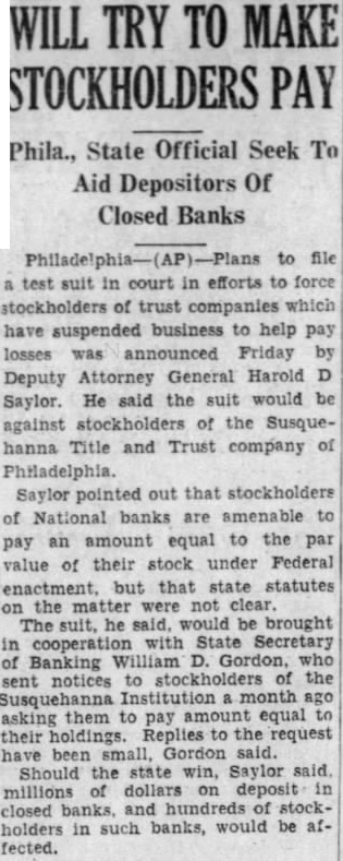 WILL TRY TO MAKE STOCKHOLDERS PAY Phila., State Official Seek To Aid Depositors Of Closed Banks to file suit in court in efforts to force stockholders of trust companies which business to help pay losses announced Friday by Deputy General Harold D Saylor. He said the suit would be against stockholders of the Susquehanna Title and Trust company of Philadelphia. Saylor pointed out that stockholders of National banks are amenable to pay an amount equal to the par value of their under Federal but that state statutes on the not clear The he said. brought cooperation Secretary Banking William D. who sent notices to stockholders of the Susquehanna Institution month ago asking them to pay amount equal to their holdings. the request been Gordon said. Should the state win, Saylor said millions of dollars on deposit closed and of stock. holders in such banks, would be affected.