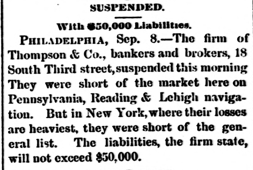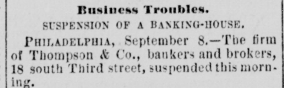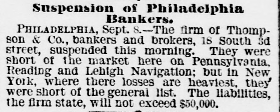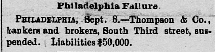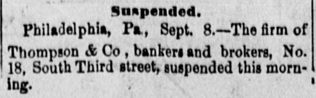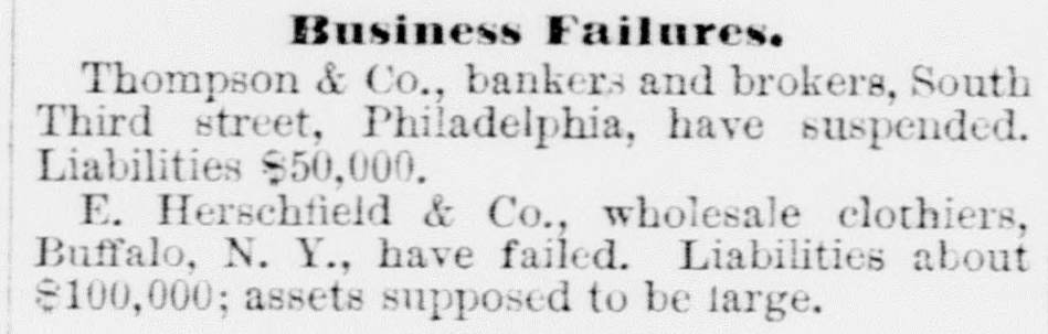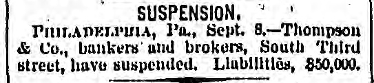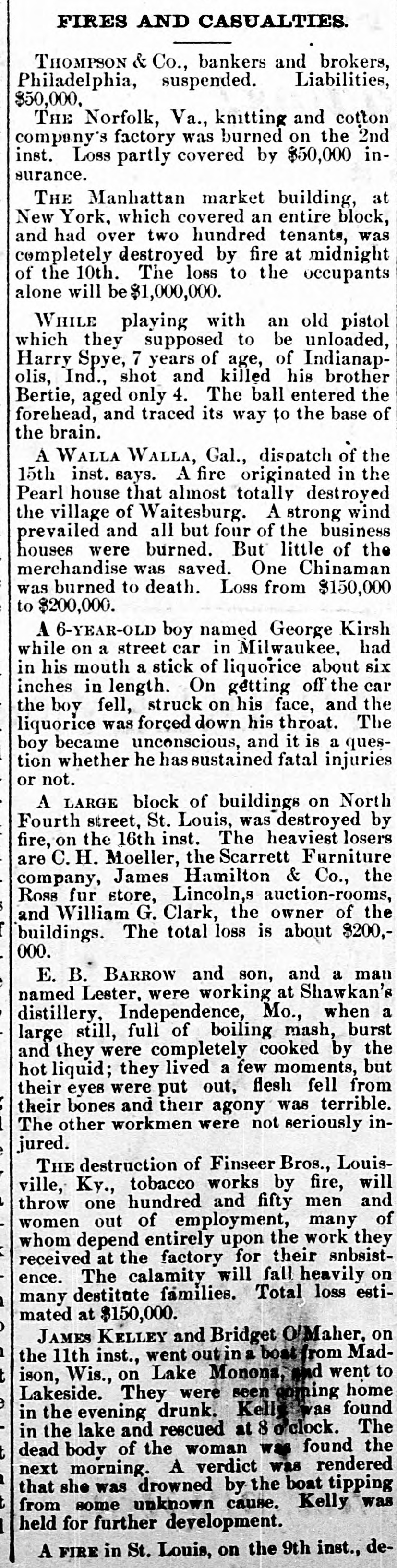 FIRES AND CASUALTIES. THOMPSON & Co., bankers and brokers, Philadelphia, suspended. Liabilities, $50,000, THE Norfolk, Va., knitting and cotton company's factory was burned on the 2nd inst. Loss partly covered by $50,000 insurance. THE Manhattan market building, at New York, which covered an entire block, and had over two hundred tenants, was completely destroyed by fire at midnight of the 10th. The loss to the occupants alone will be $1,000,000. WHILE playing with an old pistol which they supposed to be unloaded, Harry Spye, 7 years of age, of Indianapolis, Ind., shot and killed his brother Bertie, aged only 4. The ball entered the forehead, and traced its way to the base of the brain. A WALLA Walla, Gal., dispatch of the 15th inst. says. A fire originated in the Pearl house that almost totally destroyed the village of Waitesburg. A strong wind prevailed and all but four of the business houses were burned. But little of the merchandise was saved. One Chinaman was burned to death. Loss from $150,000 to $200,000. A 6-YEAR-OLD boy named George Kirsh while on a street car in Milwaukee, had in his mouth a stick of liquorice about six inches in length. On getting off the car the boy fell, struck on his face, and the liquorice was forced down his throat. The boy became unconscious, and it is a question whether he has sustained fatal injuries or not. A LARGE block of buildings on North Fourth street, St. Louis, was destroyed by fire, on the 16th inst. The heaviest losers are C. H. Moeller, the Scarrett Furniture company, James Hamilton & Co., the Ross fur store, Lincoln,s auction-rooms, and William G. Clark, the owner of the buildings. The total loss is about $200,000. E. B. BARROW and son, and a man named Lester, were working at Shawkan's distillery. Independence, Mo., when a large still, full of boiling mash, burst and they were completely cooked by the hot liquid; they lived a few moments, but their eyes were put out, flesh fell from their bones and their agony was terrible. The other workmen were not seriously injured. THE destruction of Finseer Bros., Louisville, Ky., tobacco works by fire, will throw one hundred and fifty men and women out of employment, many of whom depend entirely upon the work they received at the factory for their snbsistence. The calamity will fall heavily on many destitute families. Total loss estimated at $150,000. JAMES KELLEY and Bridget O'Maher, on the 11th inst., went out in a boat from Madison, Wis., on Lake Monona, and went to Lakeside. They were seen coming home in the evening drunk. Kells was found in the lake and rescued at 8 o'clock. The dead body of the woman was found the next morning. A verdict was rendered that she was drowned by the boat tipping from some unknown cause. Kelly was held for further development. A FIRE in St. Louis, on the 9th inst., de-