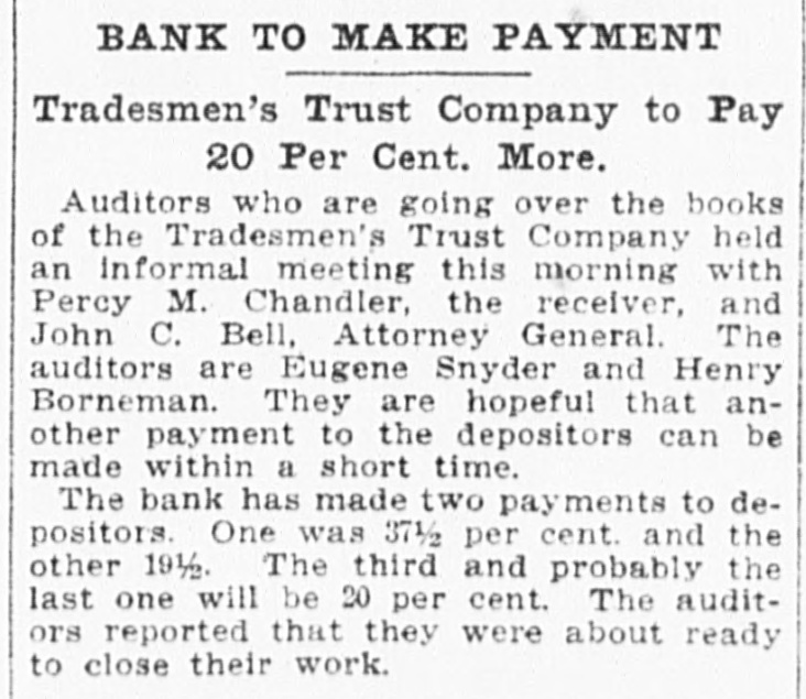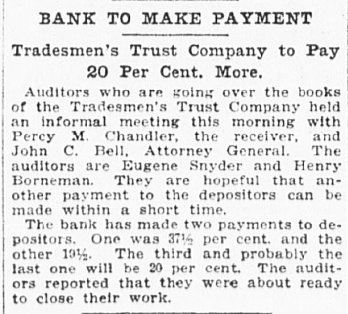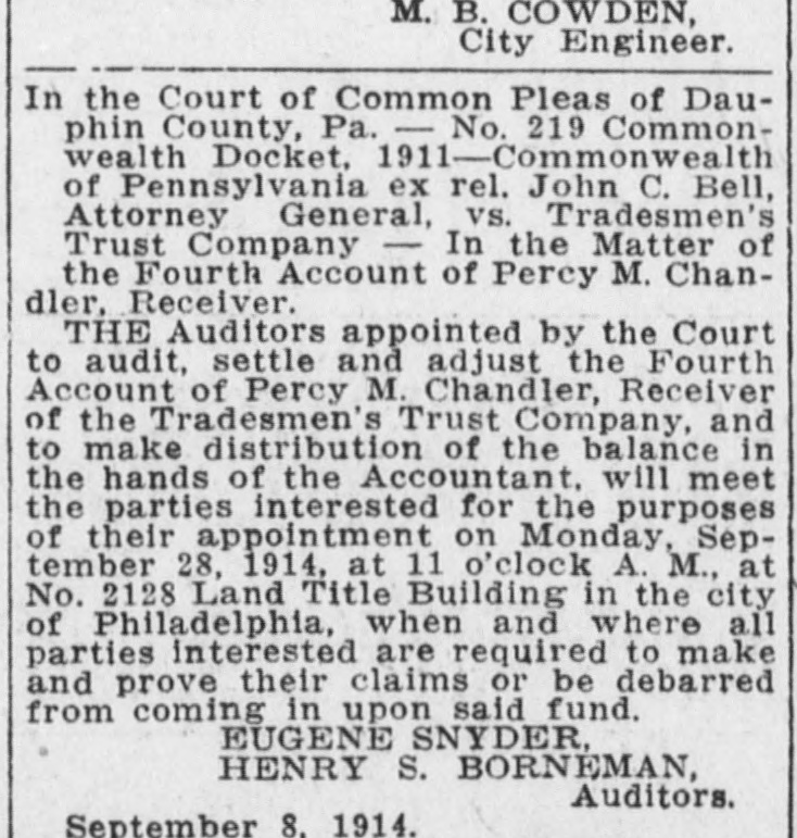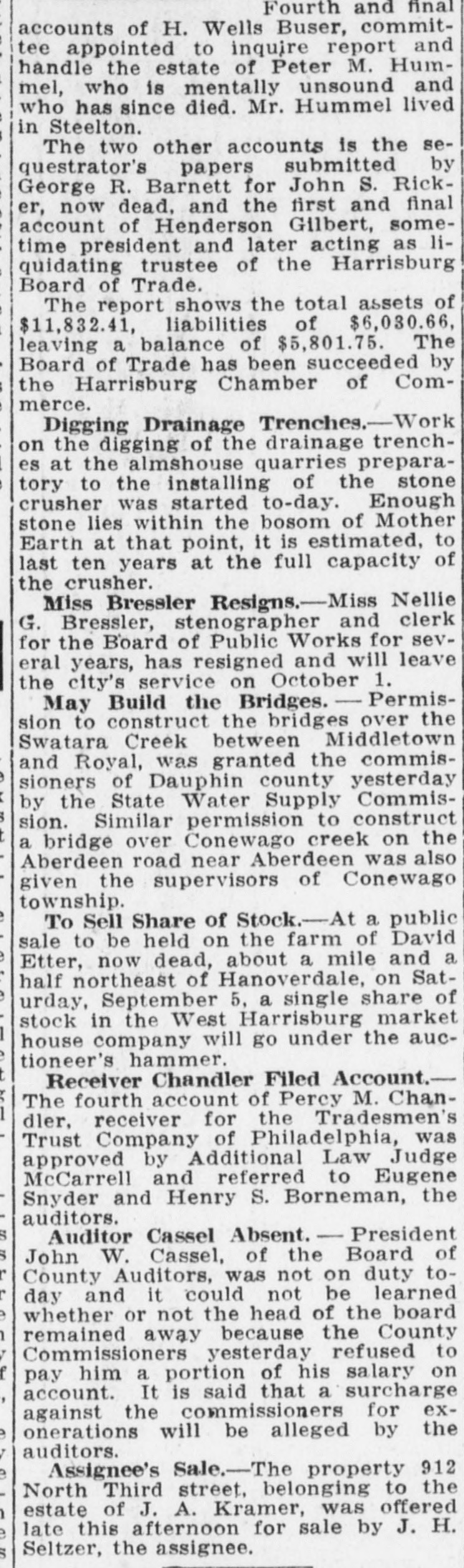 Fourth and final accounts of H. Wells Buser, committee appointed to inquire report and handle the estate of Peter M. Hummel, who is mentally unsound and who has since died. Mr. Hummel lived in Steelton. The two other accounts is the sequestrator's papers submitted by George R. Barnett for John S. Ricker, now dead, and the first and final account of Henderson Gilbert, sometime president and later acting as liquidating trustee of the Harrisburg Board of Trade. The report shows the total assets of $11,832.41, liabilities of $6,030.66, leaving a balance of $5,801.75. The Board of Trade has been succeeded by the Harrisburg Chamber of Commerce. Digging Drainage Trenches.-Work on the digging of the drainage trenches at the almshouse quarries preparatory to the installing of the stone crusher was started to-day. Enough stone lies within the bosom of Mother Earth at that point, it is estimated, to last ten years at the full capacity of the crusher. Miss Bressler Resigns.-Miss Nellie G. Bressler, stenographer and clerk for the Board of Public Works for several years, has resigned and will leave the city's service on October 1. May Build the Bridges. - Permission to construct the bridges over the Swatara Creek between Middletown and Royal, was granted the commissioners of Dauphin county yesterday by the State Water Supply Commission. Similar permission to construct a bridge over Conewago creek on the Aberdeen road near Aberdeen was also given the supervisors of Conewago township. To Sell Share of Stock.-At a public sale to be held on the farm of David Etter, now dead, about a mile and a half northeast of Hanoverdale, on Saturday, September 5, a single share of stock in the West Harrisburg market house company will go under the auctioneer's hammer. Receiver Chandler Filed Account.The fourth account of Percy M. Chandler, receiver for the Tradesmen's Trust Company of Philadelphia, was approved by Additional Law Judge McCarrell and referred to Eugene Snyder and Henry S. Borneman, the auditors. Auditor Cassel Absent. - President John W. Cassel, of the Board of County Auditors, was not on duty today and it could not be learned whether or not the head of the board remained away because the County Commissioners yesterday refused to pay him a portion of his salary on account. It is said that a surcharge against the commissioners for exonerations will be alleged by the auditors. Assignee's Sale.-The property 912 North Third street, belonging to the estate of J. A. Kramer, was offered late this afternoon for sale by J. H. Seltzer, the assignee.