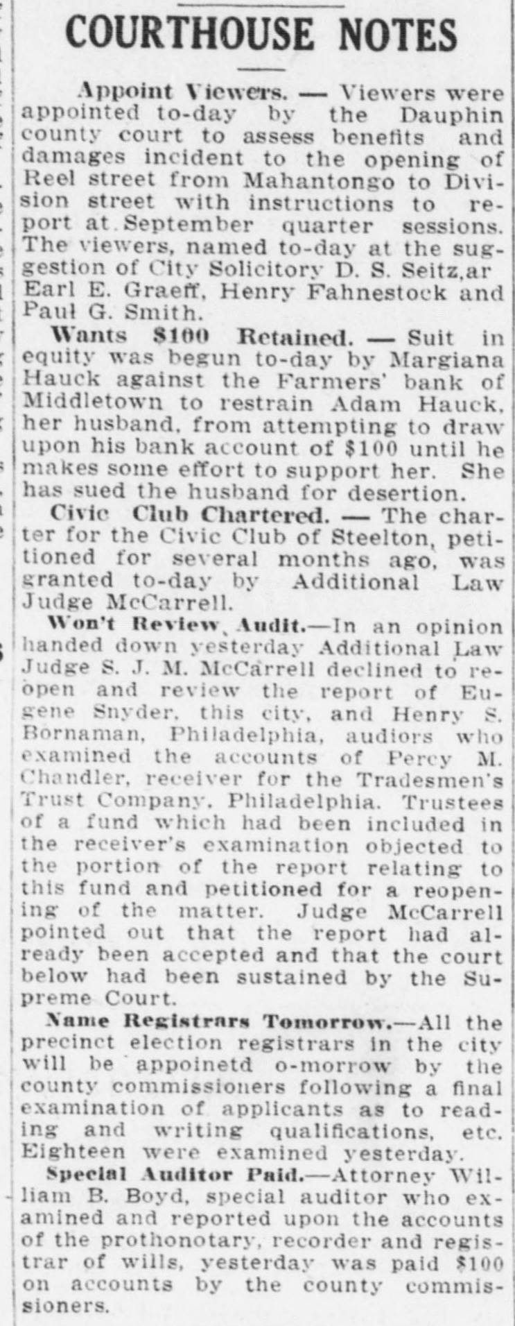 COURTHOUSE NOTES Appoint Viewers. - Viewers were appointed to-day by the Dauphin county court to assess benefits and damages incident to the opening of Reel street from Mahantongo to Division street with instructions to report at. September quarter sessions. The viewers, named to-day at the suggestion of City Solicitory D. S. Seitz, ar Earl E. Graeff, Henry Fahnestock and Paul G. Smith. Wants $100 Retained. - Suit in equity was begun to-day by Margiana Hauck against the Farmers' bank of Middletown to restrain Adam Hauck, her husband. from attempting to draw upon his bank account of $100 until he makes some effort to support her. She has sued the husband for desertion. Civic Club Chartered. - The charter for the Civic Club of Steelton, petitioned for several months ago, was granted to-day by Additional Law Judge McCarrell. Won't Review, Audit.-In an opinion handed down yesterday Additional Law Judge S. J. M. McCarrell declined to reopen and review the report of Eugene Snyder, this city, and Henry S. Bornaman, Philadelphia, audiors who examined the accounts of Percy M. Chandler, receiver for the Tradesmen's Trust Company. Philadelphia. Trustees of a fund which had been included in the receiver's examination objected to the portion of the report relating to this fund and petitioned for a reopening of the matter. Judge McCarrell pointed out that the report had already been accepted and that the court below had been sustained by the Supreme Court. Name Registrars Tomorrow.-All the precinct election registrars in the city will be appoinetd o-morrow by the county commissioners following a final examination of applicants as to reading and writing qualifications, etc. Eighteen were examined yesterday. Special Auditor Paid.-Attorney William B. Boyd, special auditor who examined and reported upon the accounts of the prothonotary, recorder and registrar of wills, yesterday was paid $100 on accounts by the county commissioners.