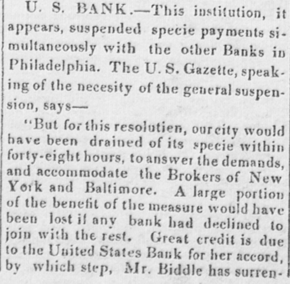 $125,766,121 Meantime, while the banks are in this state of confusion, the news generally will astound the country, and cause a general suspension of the banks over the state, and the Union. The Mechanics' Bank, and others, sent an agent to Philadelpkia yes. terday, to drain the U. S. Bank. The pet banks here having suspended, they will try to make the "monster" suspend also. There will be a terrible tug to bring down the U. S. Bank. Throughout this state, the whole confederacy of banks are gone. We have HOW a paper currency; nor can any body tell when specie payments may be restored. Great efforts will be made by speculators to start on fresh speculations. Prices will rise, valued in paper currency, and things may appear to flourish for a few months: but it will lead to terrible ruin in the end. The suspension of specie payments is merely an effort of jugglers and speculators to sustain themselves for a few months longer, against the consequences of their own folly. Neither honor, nor virtue, nor patriotism-notwithstanding what Mr. James G. King said in his speech on this point- nor truth-nor skill-nor purity-nor integrity-nor meanliness-characterise the movement. It is a matter of stern necessity. A man overtrades and breaks-a bank overbanks, and also breaks. That's all. The thing will be tolerated because we can't help ourselves, and have no redress. What do the Wall street prints now think of the state of things? Does the Courier believe it suicidal?