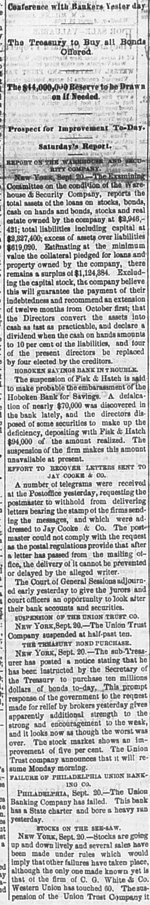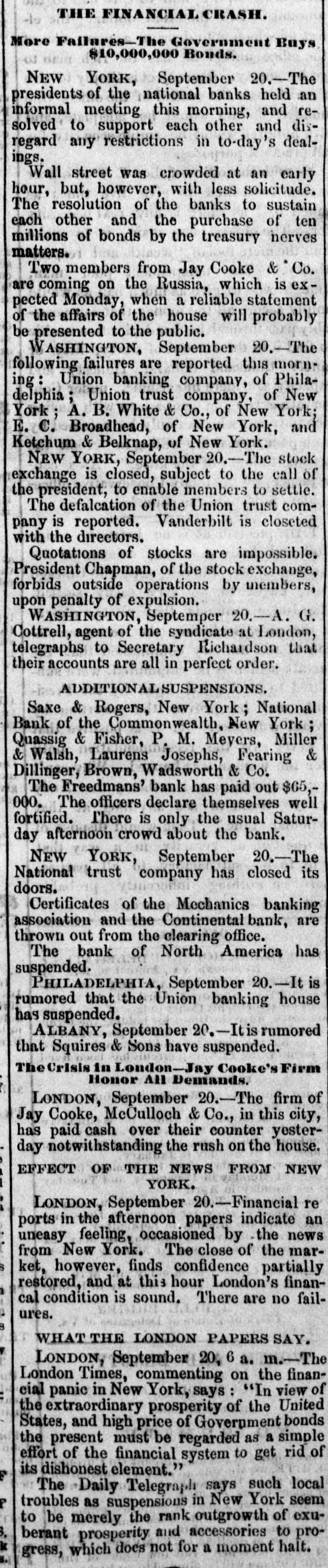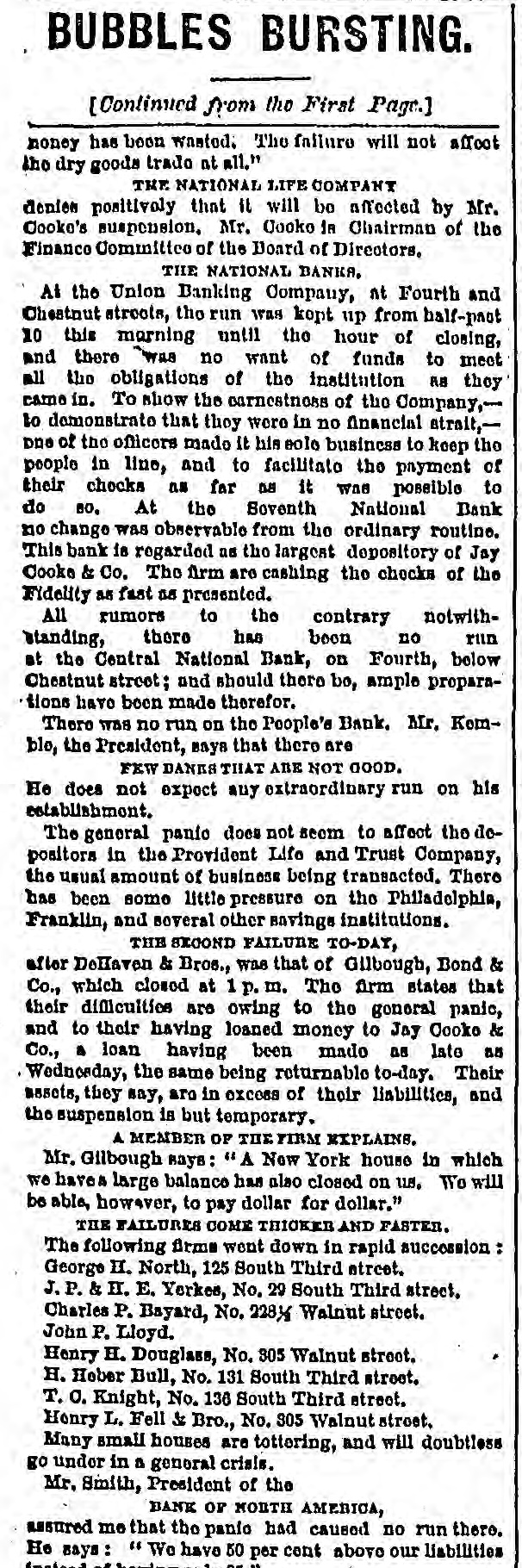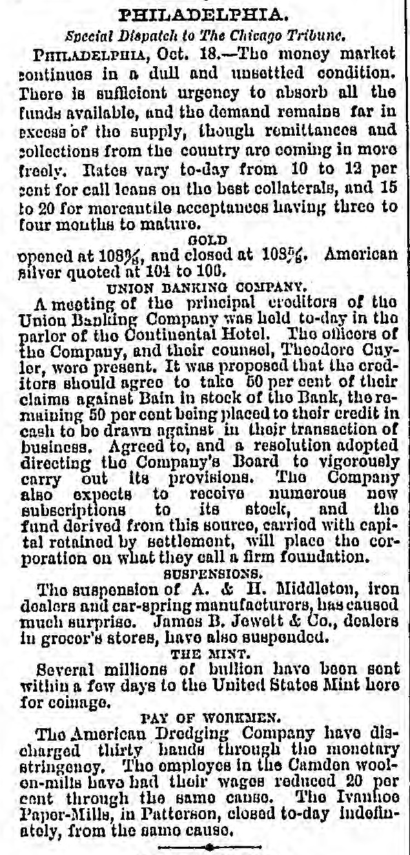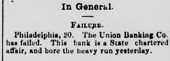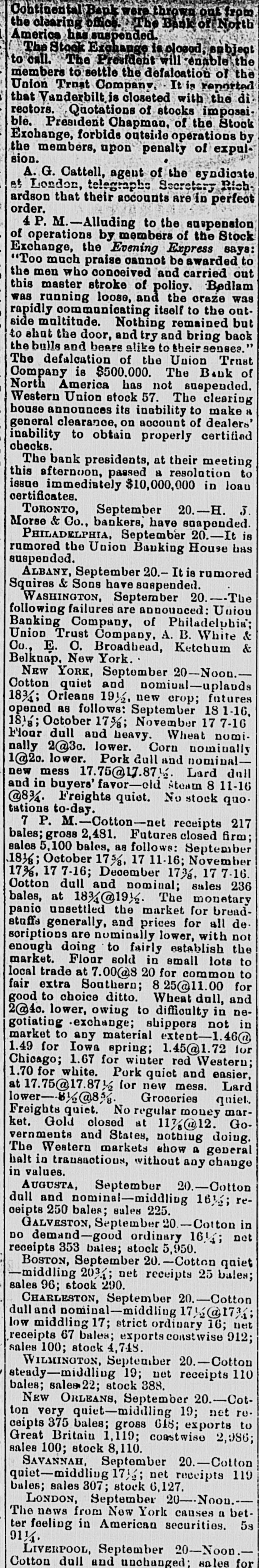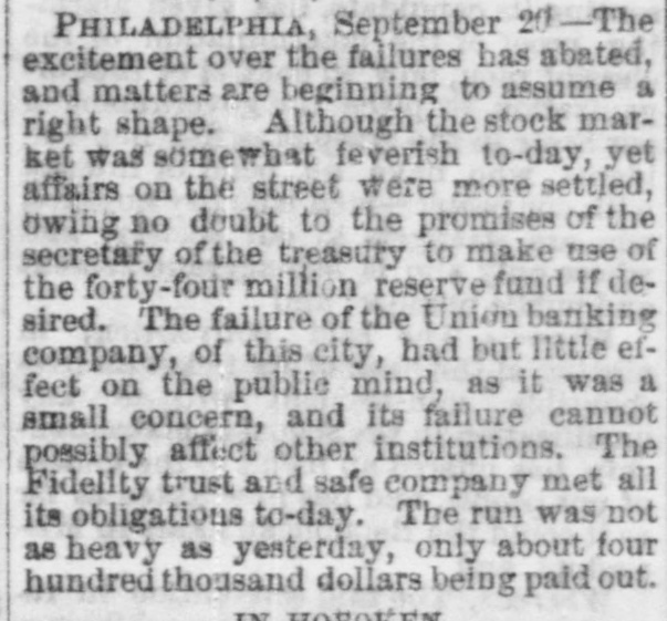 ally dosires 118 a asy that he has not cent thoro, publicly or privately, nor line he any monoy anywhere that dia danger. Gov. Hartrauft arrived to-day, but has no special mission. Thoscono In THE STOCK BOARD to-day WAR very exciting, there being many brokers present, and all were greatly excited. The aceno was almost indescribable, Mon were flying around the room shouting themselves hoarse, throwing their hata up, yelling, thrusting up their hands, bidding, selling, etc., requiring B constant use of the gavel by the President to maintain what did not even approach order. Tho First Board opened with & very buoyant feeling, with largo sales of Reading and Pennsylvania, the latter be ing in great demand. Presently the boars got control and began & heavy movement, which the bulls resiated tenaciously. Thon, however, disastrous news came from Now York of heavy falls in stocks, and the bulls gave way to the bears, allowing the latter full control for a while. When the pressure ceased the bulls went in again and hold the market steadily. The firm of Carlyle, on Third street, small operators, failed early in the day. The Stock Exchange has not closed. Until further orders from the President, all operations in the street are prohibited on a penalty of expulsion. INCIDENTALS OF THE DAY. Yesterday afternoon & rumor obtained currency that the night broker of No. 136 South Third street, and a member of the Board, had been obliged to suspond, and in the hurry and excitoment it obtained a place in somo of the evening papers, Wo are happy to state that there was no foundation whatover for the report. Mr. Knight weathered the atorm of yesterday successfully, and WAS thon, as ho is now, as sound as A week ago. The great house of Drexel & Co., No 36 South Third street, remains as stable as a rock. All the morning their office has been crowded, but the run has been for the purpose of getting rid of monoy, and not to clamor for it. Persons wishing to make an investment of their currency have been obliged to take their places in a long lino and wait their turn for a chance to pass their money over the counter. Pennsylvania appears to have been the favorito stock sought, and the operations of the Drexols in it have been very largo. The Cashier of the Union in Now York gave the fol lowing statement: 'We have a large number of depositors to whom we allow 4 per cent, and, in addition, wo havo n very largo country correspondonce. Universal distrust, which the events of tho past fow days has caused, Beized the holders of our paper in the interior and brought them down upon US. The result was that we were drained. We expected this, but not to the degree that was realized. Wo have a long lino of call loans, and from this wo hoped to realize enough to carry us through. We are now engaged upon a formal statement, but probably will not have it finished before Monday about noon." This statement is all very good, but it is my decided opinion, formed from conversation with somo of the most eminent financiers in this city, that the firm will NEVER RECOVER. At present, I can state on good substantial authority that they cannot pay 40 per cent. AN INTERVIEW WITH A BANK PRESIDENT, Immediately upon the reception of the news of the promised action of the Secretary of the Treasury, a reliable friend of mino called on the President of the Bank of North America, and gleaned the following Mr. F.-The Secretary of the Treasury has announce ed that if the $10,000,000 which he line set afloat will not rollevo the community ho will issuo $40,000,000 of groonbacks, which will be the end of that proceduro. Mr. Smith-That is as you look nt it. If the Secretary of the Treasury intends to place the $10,000,000 in our depositorios for the use of the banks the relief will undoubtedly be foll, and with the anticipated result, but if he morely intends to buy up that amount of five-twenty bonds, it is doubtful whether that result will be achieved. Mr. F.-Why Mr. Smith-Because, in the present distrossed condition of the community the people loze confidence in corporations and securities, and hold on to their bonds as the surest Investment they have. Those it is doubtful they will part with to an amount sufficient to have the offect that is desired, as the Government will only buy these bonds. It will be Been that the Secretary cannot get A large quantity of them. A large amount of greenbacks cannot in this way be released. If he intends to place the money so that the banks can have the ueo of it, then the rellef will certainly come. FEARS. It is feared that the excitement will bengain renowed on Monday. Many of my commercial frieuds in Wilmington and elsewhere havo been in town today. Some drew their funds, and others concluded to wait. I hear that n number are coming here on Monday from Reading, Pottsville, Chester, etc. Restdonta of Camden, N. J., are fearfully excited, and I firmly believo that not twenty of its residents have failed to draw their accounts. [To the Associated Press.] FAILURES. PHILADELPHIA, Sept. 20,-The Union Banking Company has failed. This bank has n State charter, and bore a heavy run yesterday. t Jay Cooke's the clerks are preparing a statement to be laid before the members of the from on the arrival of the Prussia, on board of which are two of the partners.