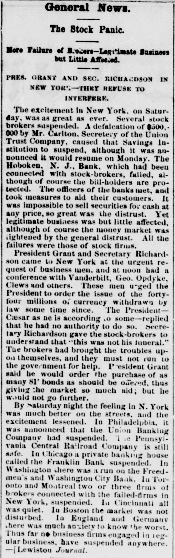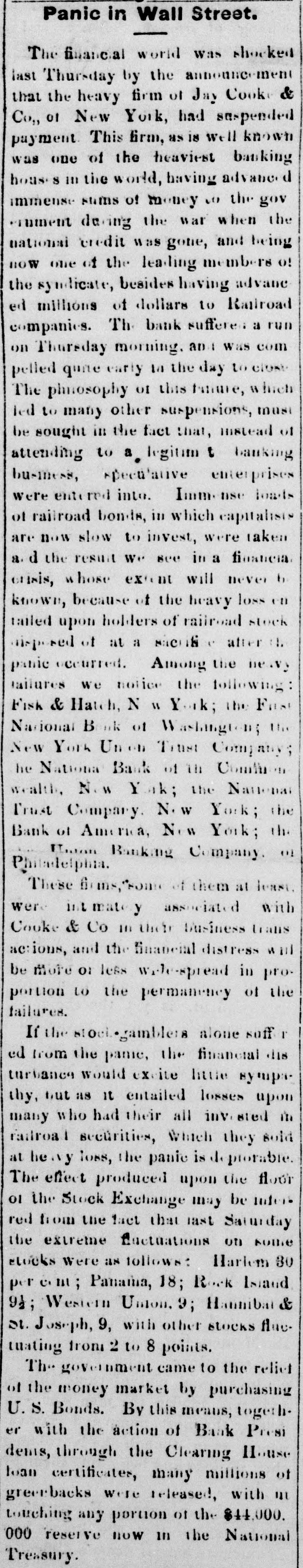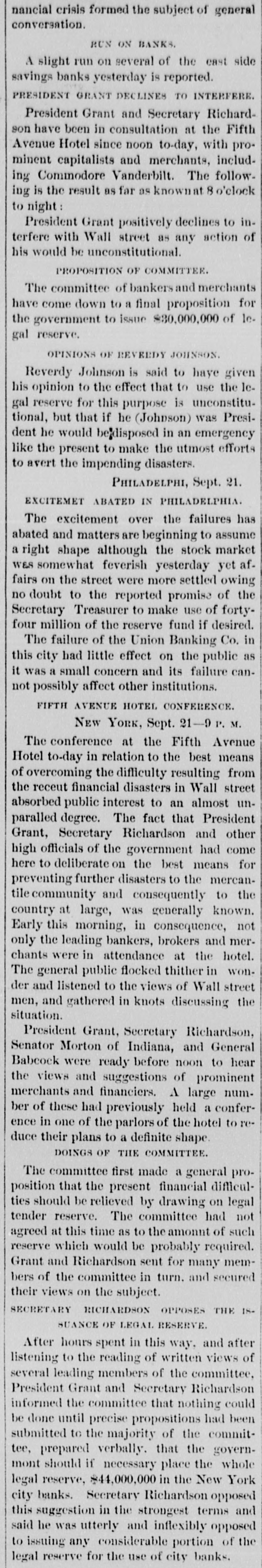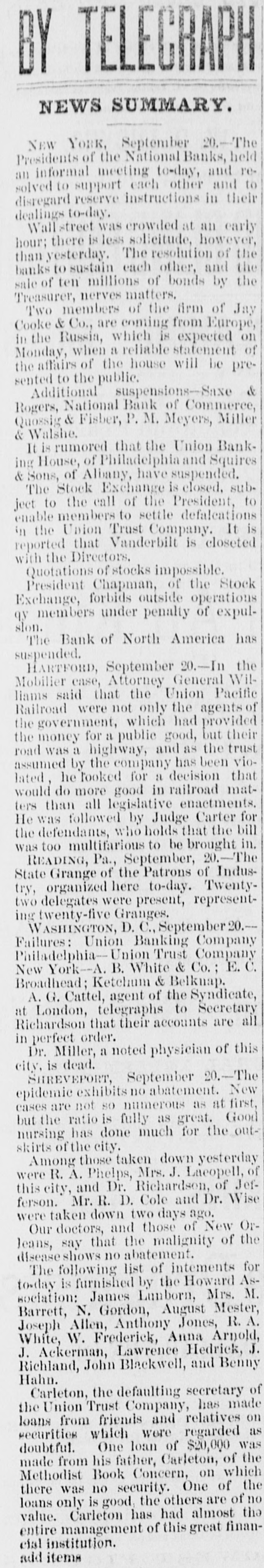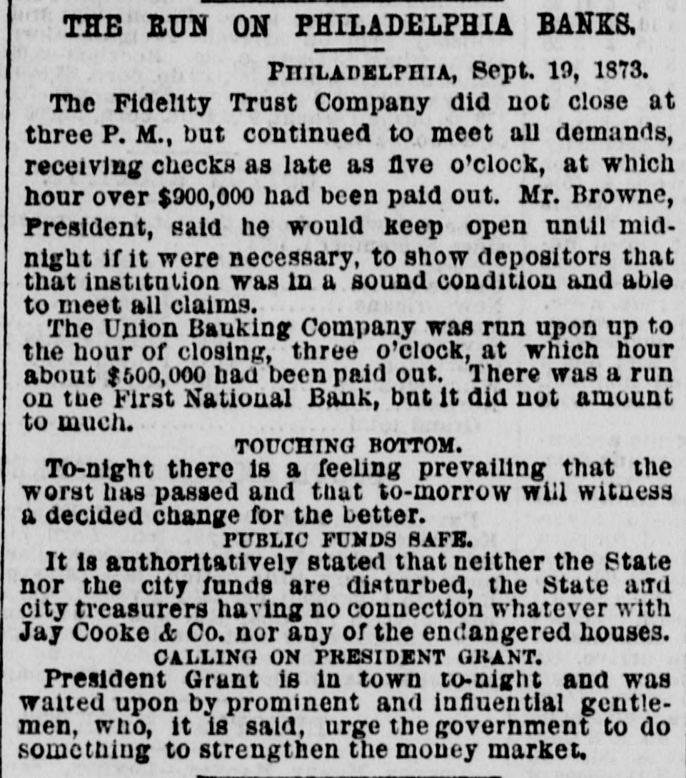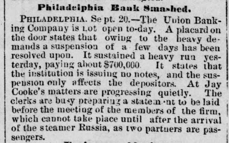 ally dosires 118 a asy that he has not cent thoro, publicly or privately, nor line he any monoy anywhere that dia danger. Gov. Hartrauft arrived to-day, but has no special mission. Thoscono In THE STOCK BOARD to-day WAR very exciting, there being many brokers present, and all were greatly excited. The aceno was almost indescribable, Mon were flying around the room shouting themselves hoarse, throwing their hata up, yelling, thrusting up their hands, bidding, selling, etc., requiring B constant use of the gavel by the President to maintain what did not even approach order. Tho First Board opened with & very buoyant feeling, with largo sales of Reading and Pennsylvania, the latter be ing in great demand. Presently the boars got control and began & heavy movement, which the bulls resiated tenaciously. Thon, however, disastrous news came from Now York of heavy falls in stocks, and the bulls gave way to the bears, allowing the latter full control for a while. When the pressure ceased the bulls went in again and hold the market steadily. The firm of Carlyle, on Third street, small operators, failed early in the day. The Stock Exchange has not closed. Until further orders from the President, all operations in the street are prohibited on a penalty of expulsion. INCIDENTALS OF THE DAY. Yesterday afternoon & rumor obtained currency that the night broker of No. 136 South Third street, and a member of the Board, had been obliged to suspond, and in the hurry and excitoment it obtained a place in somo of the evening papers, Wo are happy to state that there was no foundation whatover for the report. Mr. Knight weathered the atorm of yesterday successfully, and WAS thon, as ho is now, as sound as A week ago. The great house of Drexel & Co., No 36 South Third street, remains as stable as a rock. All the morning their office has been crowded, but the run has been for the purpose of getting rid of monoy, and not to clamor for it. Persons wishing to make an investment of their currency have been obliged to take their places in a long lino and wait their turn for a chance to pass their money over the counter. Pennsylvania appears to have been the favorito stock sought, and the operations of the Drexols in it have been very largo. The Cashier of the Union in Now York gave the fol lowing statement: 'We have a large number of depositors to whom we allow 4 per cent, and, in addition, wo havo n very largo country correspondonce. Universal distrust, which the events of tho past fow days has caused, Beized the holders of our paper in the interior and brought them down upon US. The result was that we were drained. We expected this, but not to the degree that was realized. Wo have a long lino of call loans, and from this wo hoped to realize enough to carry us through. We are now engaged upon a formal statement, but probably will not have it finished before Monday about noon." This statement is all very good, but it is my decided opinion, formed from conversation with somo of the most eminent financiers in this city, that the firm will NEVER RECOVER. At present, I can state on good substantial authority that they cannot pay 40 per cent. AN INTERVIEW WITH A BANK PRESIDENT, Immediately upon the reception of the news of the promised action of the Secretary of the Treasury, a reliable friend of mino called on the President of the Bank of North America, and gleaned the following Mr. F.-The Secretary of the Treasury has announce ed that if the $10,000,000 which he line set afloat will not rollevo the community ho will issuo $40,000,000 of groonbacks, which will be the end of that proceduro. Mr. Smith-That is as you look nt it. If the Secretary of the Treasury intends to place the $10,000,000 in our depositorios for the use of the banks the relief will undoubtedly be foll, and with the anticipated result, but if he morely intends to buy up that amount of five-twenty bonds, it is doubtful whether that result will be achieved. Mr. F.-Why Mr. Smith-Because, in the present distrossed condition of the community the people loze confidence in corporations and securities, and hold on to their bonds as the surest Investment they have. Those it is doubtful they will part with to an amount sufficient to have the offect that is desired, as the Government will only buy these bonds. It will be Been that the Secretary cannot get A large quantity of them. A large amount of greenbacks cannot in this way be released. If he intends to place the money so that the banks can have the ueo of it, then the rellef will certainly come. FEARS. It is feared that the excitement will bengain renowed on Monday. Many of my commercial frieuds in Wilmington and elsewhere havo been in town today. Some drew their funds, and others concluded to wait. I hear that n number are coming here on Monday from Reading, Pottsville, Chester, etc. Restdonta of Camden, N. J., are fearfully excited, and I firmly believo that not twenty of its residents have failed to draw their accounts. [To the Associated Press.] FAILURES. PHILADELPHIA, Sept. 20,-The Union Banking Company has failed. This bank has n State charter, and bore a heavy run yesterday. t Jay Cooke's the clerks are preparing a statement to be laid before the members of the from on the arrival of the Prussia, on board of which are two of the partners.