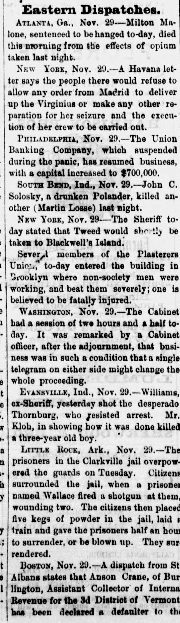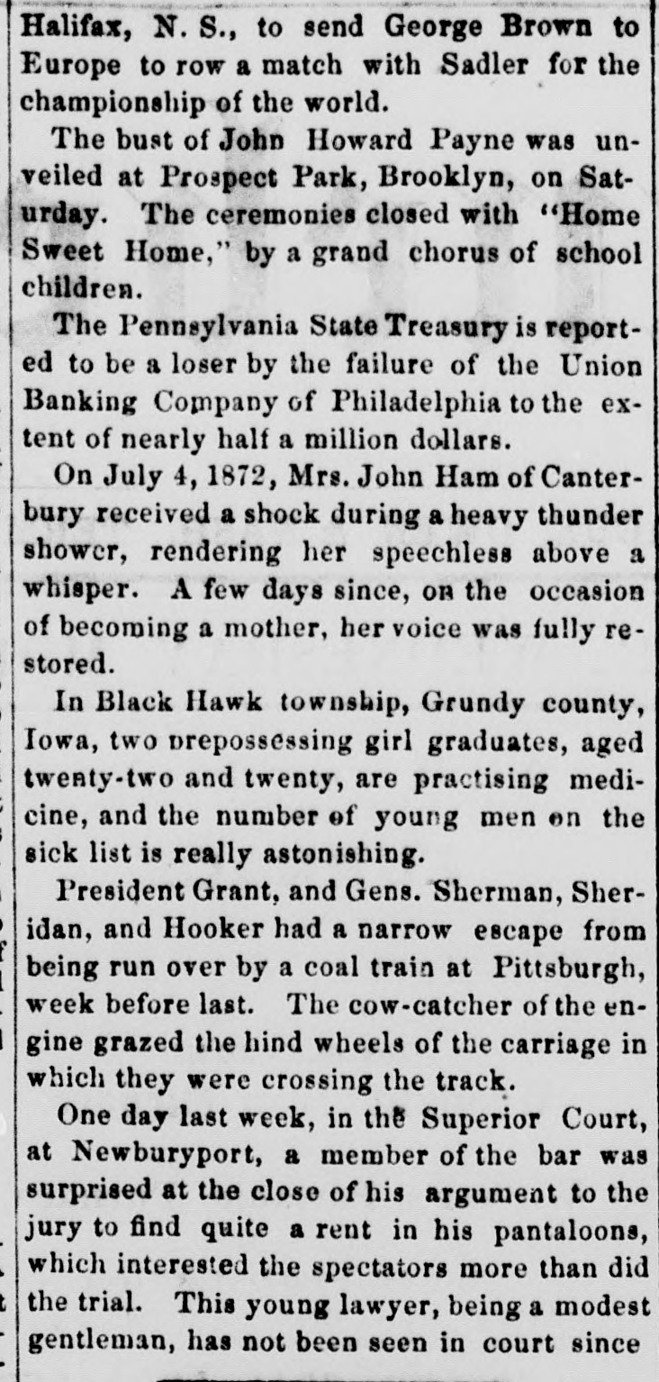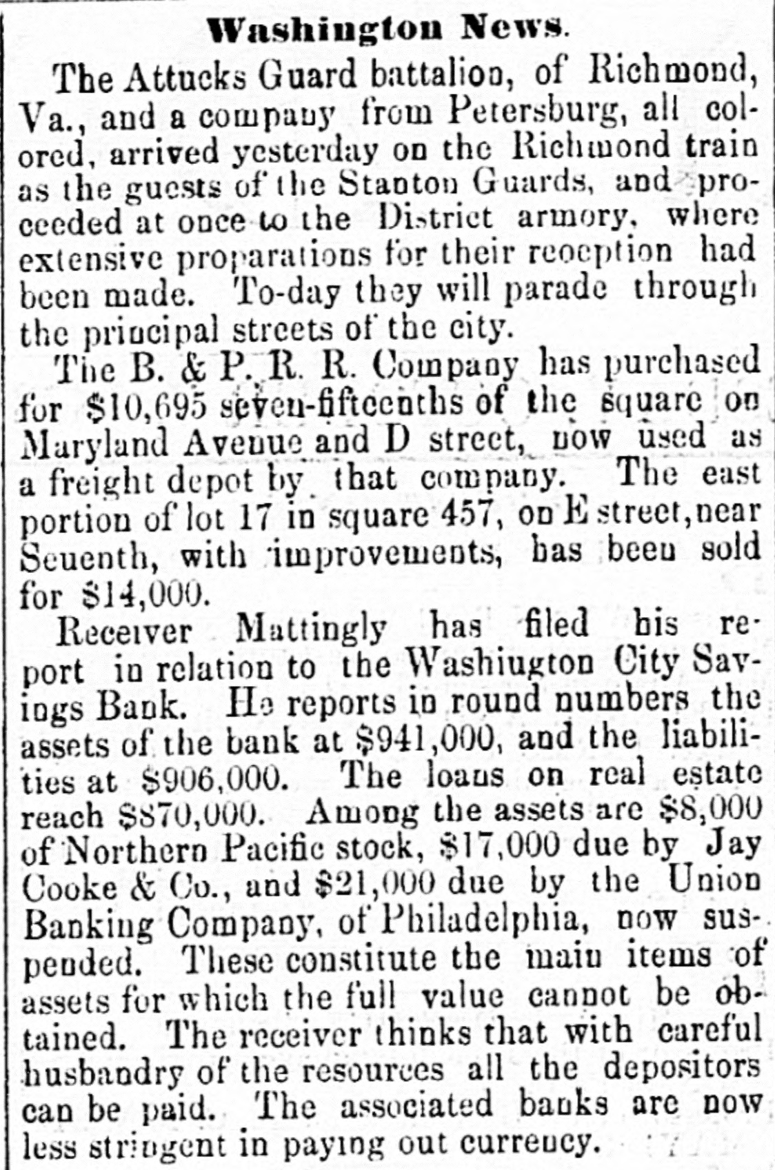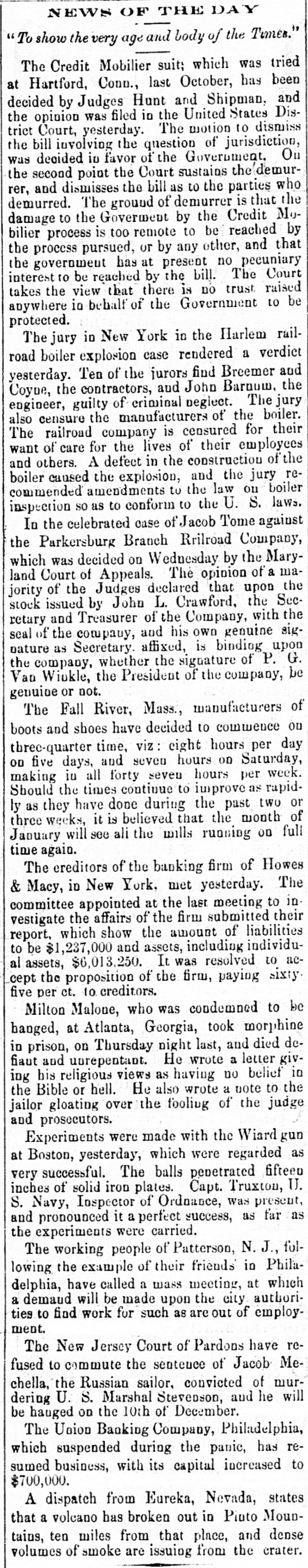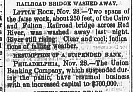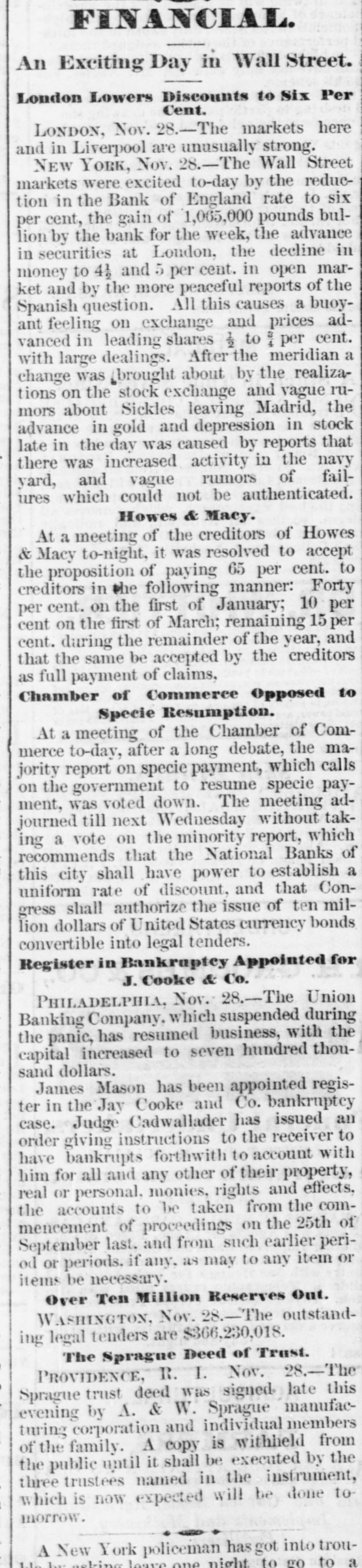 ally dosires 118 a asy that he has not cent thoro, publicly or privately, nor line he any monoy anywhere that dia danger. Gov. Hartrauft arrived to-day, but has no special mission. Thoscono In THE STOCK BOARD to-day WAR very exciting, there being many brokers present, and all were greatly excited. The aceno was almost indescribable, Mon were flying around the room shouting themselves hoarse, throwing their hata up, yelling, thrusting up their hands, bidding, selling, etc., requiring B constant use of the gavel by the President to maintain what did not even approach order. Tho First Board opened with & very buoyant feeling, with largo sales of Reading and Pennsylvania, the latter be ing in great demand. Presently the boars got control and began & heavy movement, which the bulls resiated tenaciously. Thon, however, disastrous news came from Now York of heavy falls in stocks, and the bulls gave way to the bears, allowing the latter full control for a while. When the pressure ceased the bulls went in again and hold the market steadily. The firm of Carlyle, on Third street, small operators, failed early in the day. The Stock Exchange has not closed. Until further orders from the President, all operations in the street are prohibited on a penalty of expulsion. INCIDENTALS OF THE DAY. Yesterday afternoon & rumor obtained currency that the night broker of No. 136 South Third street, and a member of the Board, had been obliged to suspond, and in the hurry and excitoment it obtained a place in somo of the evening papers, Wo are happy to state that there was no foundation whatover for the report. Mr. Knight weathered the atorm of yesterday successfully, and WAS thon, as ho is now, as sound as A week ago. The great house of Drexel & Co., No 36 South Third street, remains as stable as a rock. All the morning their office has been crowded, but the run has been for the purpose of getting rid of monoy, and not to clamor for it. Persons wishing to make an investment of their currency have been obliged to take their places in a long lino and wait their turn for a chance to pass their money over the counter. Pennsylvania appears to have been the favorito stock sought, and the operations of the Drexols in it have been very largo. The Cashier of the Union in Now York gave the fol lowing statement: 'We have a large number of depositors to whom we allow 4 per cent, and, in addition, wo havo n very largo country correspondonce. Universal distrust, which the events of tho past fow days has caused, Beized the holders of our paper in the interior and brought them down upon US. The result was that we were drained. We expected this, but not to the degree that was realized. Wo have a long lino of call loans, and from this wo hoped to realize enough to carry us through. We are now engaged upon a formal statement, but probably will not have it finished before Monday about noon." This statement is all very good, but it is my decided opinion, formed from conversation with somo of the most eminent financiers in this city, that the firm will NEVER RECOVER. At present, I can state on good substantial authority that they cannot pay 40 per cent. AN INTERVIEW WITH A BANK PRESIDENT, Immediately upon the reception of the news of the promised action of the Secretary of the Treasury, a reliable friend of mino called on the President of the Bank of North America, and gleaned the following Mr. F.-The Secretary of the Treasury has announce ed that if the $10,000,000 which he line set afloat will not rollevo the community ho will issuo $40,000,000 of groonbacks, which will be the end of that proceduro. Mr. Smith-That is as you look nt it. If the Secretary of the Treasury intends to place the $10,000,000 in our depositorios for the use of the banks the relief will undoubtedly be foll, and with the anticipated result, but if he morely intends to buy up that amount of five-twenty bonds, it is doubtful whether that result will be achieved. Mr. F.-Why Mr. Smith-Because, in the present distrossed condition of the community the people loze confidence in corporations and securities, and hold on to their bonds as the surest Investment they have. Those it is doubtful they will part with to an amount sufficient to have the offect that is desired, as the Government will only buy these bonds. It will be Been that the Secretary cannot get A large quantity of them. A large amount of greenbacks cannot in this way be released. If he intends to place the money so that the banks can have the ueo of it, then the rellef will certainly come. FEARS. It is feared that the excitement will bengain renowed on Monday. Many of my commercial frieuds in Wilmington and elsewhere havo been in town today. Some drew their funds, and others concluded to wait. I hear that n number are coming here on Monday from Reading, Pottsville, Chester, etc. Restdonta of Camden, N. J., are fearfully excited, and I firmly believo that not twenty of its residents have failed to draw their accounts. [To the Associated Press.] FAILURES. PHILADELPHIA, Sept. 20,-The Union Banking Company has failed. This bank has n State charter, and bore a heavy run yesterday. t Jay Cooke's the clerks are preparing a statement to be laid before the members of the from on the arrival of the Prussia, on board of which are two of the partners.