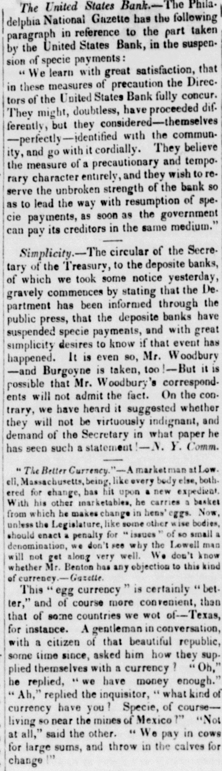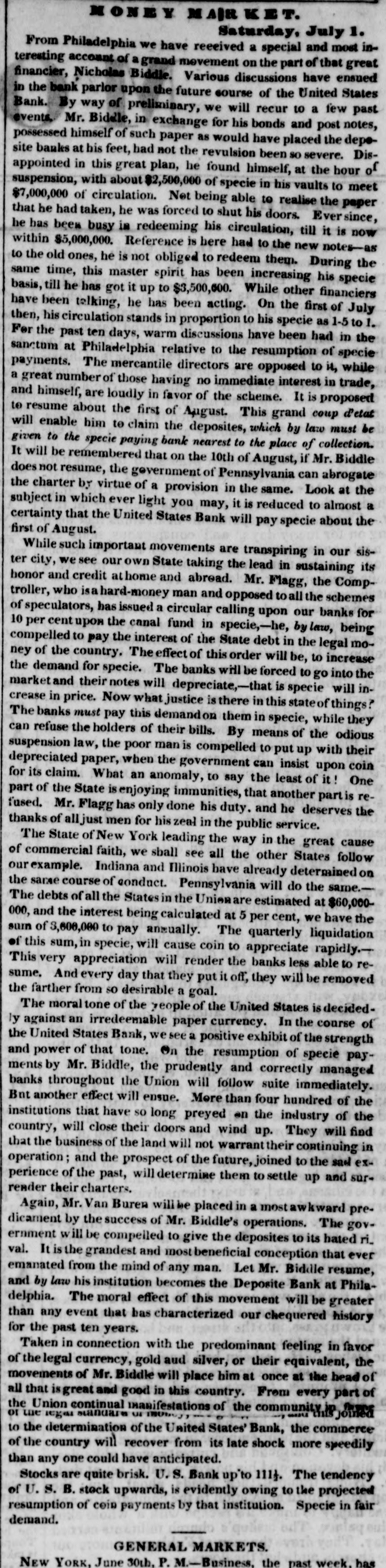 MONEY EAR K T. Saturday, July 1. From Philadelphia we have received a special and most interesting account of a grand movement on the part of that great financier, Nicholas Biddle. Various discussions have ensued in the bank parlor upon the future course of the United States Bank. By way of preliminary, we will recur to a few past events. Mr. Biddle, in exchange for his bonds and post notes, possessed himself of such paper as would have placed the deposite banks at his feet, had not the revulsion been so severe. Disappointed in this great plan, he found himself, at the hour of suspension, with about $2,500,000 of specie in his vaults to meet $7,000,000 of circulation. Net being able to realise the paper that he had taken, he was forced to shut his doors. Ever since, he has been busy in redeeming his circulation, till it is now within $5,000,000. Reference is here had to the new notes-as to the old ones, he is not obliged to redeem them. During the same time, this master spirit has been increasing his specie basis, till he has got it up to $3,500,000. While other financiers have been telking, he has been acting. On the first of July then, his circulation stands in proportion to his specie as 1-5 to 1. For the past ten days, warm discussions have been had in the sanctum at Philadelphia relative to the resumption of specie payments. The mercantile directors are opposed to it, while a great number of those having no immediate interest in trade, and himself, are loudly in favor of the scheme. It is proposed to resume about the first of August. This grand coup d'etat will enable him to claim the deposites, which by law must be given to the specie paying bank nearest to the place of collection. It will be remembered that on the 10th of August, if Mr. Biddle doesno resume, the government of Pennsylvania can abrogate the charter by virtue of a provision in the same. Look at the subject in which ever light you may, it is reduced to almost a certainty that the United States Bank will pay specie about the first of August. While such important movements are transpiring in our sister city, we see our own State taking the lead in sustaining its honor and credit athome and abread. Mr. Flagg, the Comptroller, who isa hard-money man and opposed toall the schemes of speculators, has issued a circular calling upon our banks for 10 per cent upon the canal fund in specie,-he, by law, being compelled to pay the interest of the State debt in the legal money of the country. The effect of this order will be, to increase the demand for specie. The banks will be forced to go into the market and their notes will depreciate,-that is specie will increase in price. Now what justice is there in this state of things? The banks must pay this demand on them in specie, while they can refuse the holders of their bills. By means of the odious suspension law, the poor man is compelled to put up with their depreciated paper, when the government can insist upon coin for its claim. What an anomaly, to say the least of it ! One part of the State is enjoying immunities, that another part is refused. Mr. Flagg has only done his duty. and he deserves the thanks of all just men for his zeal in the public service. The State of New York leading the way in the great cause of commercial faith, we sball see all the other States follow our example. Indiana and Illinois have already determined on the sarae course of conduct. Pennsylvania will do the same.The debts of all the States in the Unionare estimated at $60,000000, and the interest being calculated at 5 per cent, we have the sun of 3,600,000 to pay annually. The quarterly liquidation of this sum, in specie, will cause coin to appreciate rapidly.This very appreciation will render the banks less able to resume. And every day that they put it off, they will be removed the farther from so desirable a goal. The moral tone of the yeople of the United States is decidedly against an irredeemable paper currency. In the course of the United States Bank, wesee a positive exhibit of the strength and power of that tone. On the resumption of specie payments by Mr. Biddle, the prudently and correctly managed banks throughout the Union will follow suite immediately. Bnt another effect will ensue. More than four hundred of the institutions that have so long preyed on the industry of the country, will close their doors and wind up. They will find that the business of the land will not warrant their continuing in operation; and the prospect of the future, joined to the sad experience of the past, will determine them to settle up and surrender their charters. Again, Mr. Van Buren will 1 placed in a nostawkward predicament by the success of Mr. Biddle's operations. The government will be compelled to give the deposites to its hated ri. val. It is the grandest and beneficial conception that ever emanated from the mind of any man. Let Mr. Biddle resume, and by law his institution becomes the Deposite Bank at Philadelphia. The moral effect of this movement will be greater than any event that has characterized our chequered history for the past ten years. Taken in connection with the predominant feeling in favor of the legal currency, gold aud silver, or their equivalent, the movements of Mr. Biddle will place him at once at the head of all that great and good in this country. From every part of or we standare us legal the Union continual manifestations of the community.jp joined to the determination of the United States' Bank, the commerce of the country will recover from its late shock more speedily than any one could have anticipated. Stocks are quite brisk. U.S. Bank up 111). The tendency of U. S. B. stock upwards, is evidently owing to the projected resumption of coin payments by that institution. Specie in fair demand. GENERAL MARKETS. NEW YORK. June 30th, P. M.-Business, the past week. has