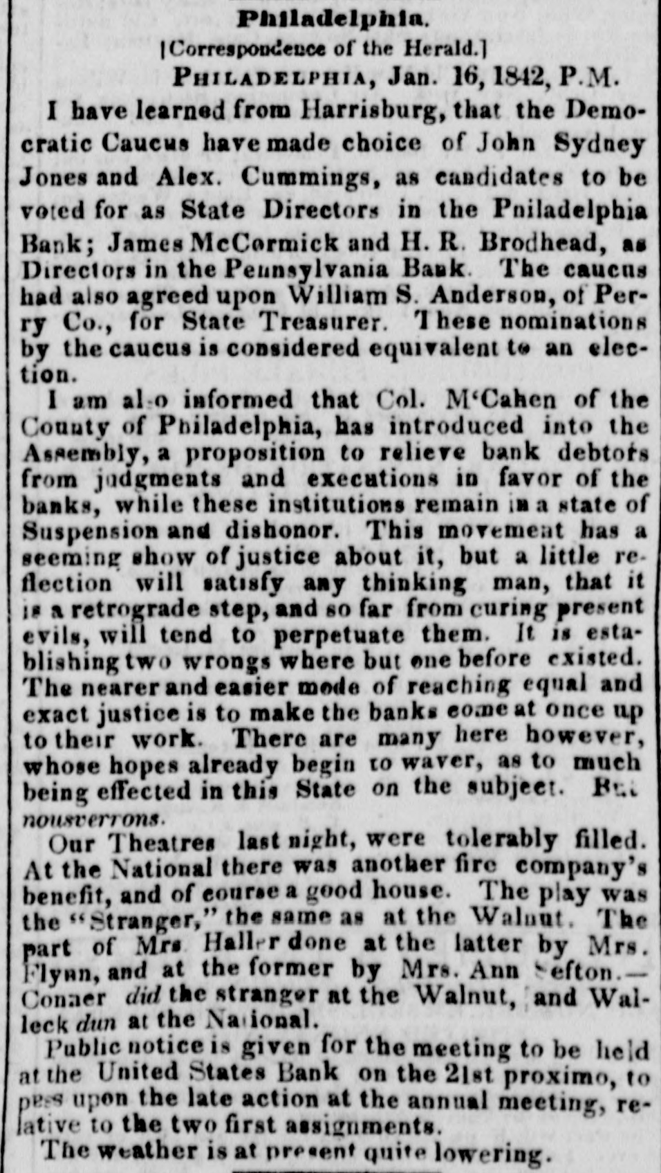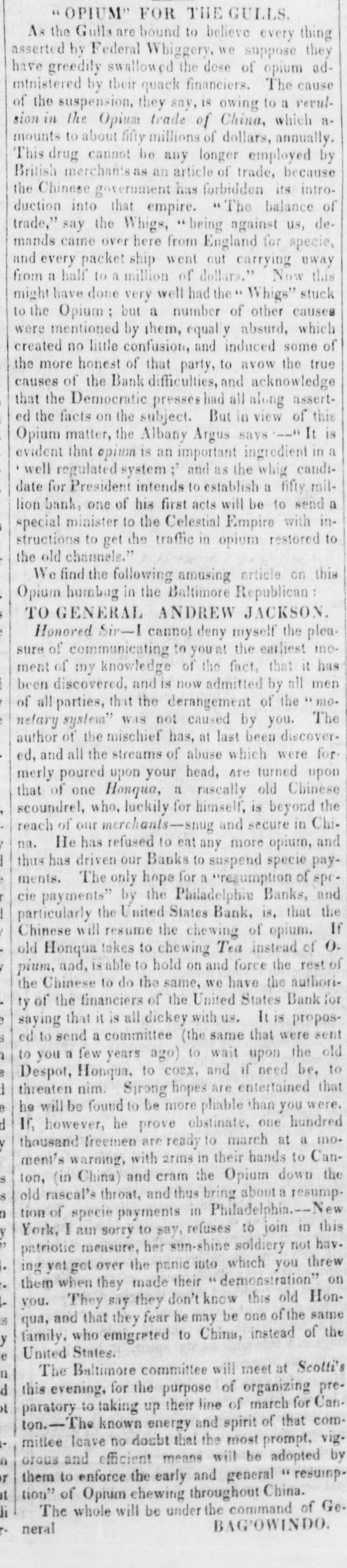 # "OPIUM" FOR THE GULLS. As the Gulls are bound to believe every thing asserted by Federal Whiggery, we suppose they have greedily swallowed the dose of opium ad-mtnistered by their quack financiers. The cause of the suspension, they say, is owing to a revulsion in the Opium trade of China, which amounts to about fifty millions of dollars, annually. This drug cannot be any longer employed by British merchants as an article of trade, because the Chinese government has forbidden its introduction into that empire. "The balance of trade," say the Whigs, "being against us, demands came over here from England for specie, and every packet ship went out carrying away from a half to a million of dollars." Now this might have done very well had the "Whigs" stuck to the Opium; but a number of other causes were mentioned by them, equaly absurd, which created no little confusion, and induced some of the more honest of that party, to avow the true causes of the Bank difficulties, and acknowledge that the Democratic presses had all along asserted the facts on the subject. But in view of this Opium matter, the Albany Argus says --" It is evident that opium is an important ingredient in a well regulated system; and as the whig candidate for President intends to establish a fifty million bank, one of his first acts will be to send a special minister to the Celestial Empire with instructions to get the traffic in opium restored to the old channels." We find the following amusing article on this Opium humbug in the Baltimore Republican: TO GENERAL ANDREW JACKSON. Honored Sir-I cannot deny myself the pleasure of communicating to you at the earliest moment of my knowledge of the fact, that it has been discovered, and is now admitted by all men of all parties, that the derangement of the "monetary system" was not caused by you. The author of the mischief has, at last been discovered, and all the streams of abuse which were formerly poured upon your head, are turned upon that of one Honqua, a rascally old Chinese scoundrel, who, luckily for himself, is beyond the reach of our merchants-snug and secure in China. He has refused to eat any more opium, and thus has driven our Banks to suspend specie payments. The only hope for a "resumption of specie payments" by the Philadelphie Banks, and particularly the United States Bank, is, that the Chinese will resume the chewing of opium. If old Honqua takes to chewing Tea instead of Opium, and, is able to hold on and force the rest of the Chinese to do the same, we have the authority of the financiers of the United States Bank for saying that it is all dickey with us. It is proposed to send a committee (the same that were sent to you a few years ago) to wait upon the old Despot, Honqua, to coax, and if need be, to threaten him. Strong hopes are entertained that he will be found to be more pliable than you were. If, however, he prove obstinate, one hundred thousand freemen are ready to march at a moment's warning, with arms in their hands to Canton, (in China) and cram the Opium down the old rascal's throat, and thus bring about a resumption of specie payments in Philadelphia.--New York, I am sorry to say, refuses to join in this patriotic measure, her sun-shine soldiery not having yet got over the panic into which you threw them when they made their "demonstration" on you. They say they don't know this old Hon-squa, and that they fear he may be one of the same family, who emigrated to China, instead of the United States. The Baltimore committee will meet at Scotti's this evening, for the purpose of organizing preparatory to taking up their line of march for Canton. The known energy and spirit of that committee leave no doubt that the most prompt, vigorous and efficient means will be adopted by them to enforce the early and general "resuinption" of Opium chewing throughout China. The whole will be under the command of General BAGOWINDO.