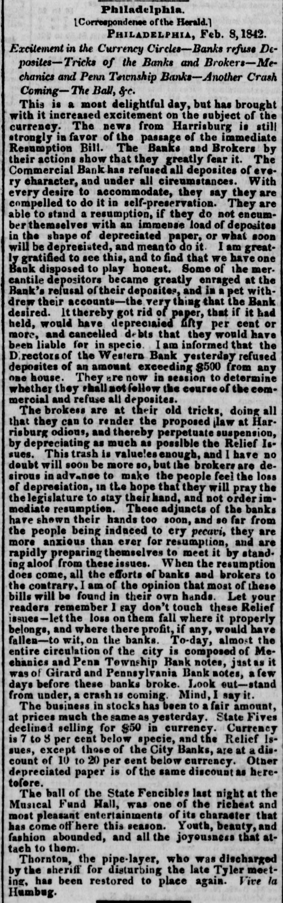 Philadelphia. [Correspondence of the Herald.] PHILADELPHIA, Feb. 3,1842. Excitement in the Currency Circles-Banks refuse Deposites-Tricks of the Banks and Brokers-Mechanics and Penn Township Banks-Another Crash Coming-The Ball, &.c. This is a most delightful day, but has brought with it increased excitement on the subject of the currency. The news from Harrisburg is still strongly in favor of the passage of the immediate Resumption Bill. The Banks and Brokers by their actions show that they greatly fear it. The Commercial Bank has refused all deposites of every character, and under all circumstances. With every desire to accommodate, they say they are compelled to do it in self-preservation. They are able to stand a resumption, if they do not encumberthemselves with an immense load of deposites in the shape of depreciated paper, or what soon will be depreciated, and meanto do it. I am greatly gratified to see this, and to find that we have one Bank disposed to play honest. Some of the mercantile depositors became greatly enraged at the Bank's refusal of their deposites, and in a pet withdrew their accounts-the very thing that the Bank desired. lt thereby got rid of paper, that if it had held, would have depreciaied fifty per cent or more, and cancelled de bts that they would have been liable for in specie. I am informed that the Directors of the Western Bank yesterday refused deposites of an amount exceeding $500 from any one house. They are now in session to determine whether they shall not follow the course of the commercial and refuse all deposites. The brokess are at their old tricks, doing all that they can to render the proposed jlaw at Harrisburg odious, and thereby perpetuate suspension, by depreciating as much as possible the Relief Issues. This trash is valueles enough, and I have no doubt will SOON be more so, but the brokers are desirous in advance to make the people feel the loss of depreciation, in the hope that they will pray the the legislature to stay their hand, and not order immediate resumption. These adjuncts of the banks have shown their hands too soon, and se far from the people being induced to cry pecavi, they are more anxious than ever for resumption, and are rapidly preparing themselves to meet it by stand. ing aloof from these issues. When the resumption does come, all the efforts of banks and brokers to the contrary, I am of the opinion that most of these bills will be found in their own hands. Let your readers remember 1 say don't touch these Relief issues-let the loss on them fall where it properly belongs, and where there profit, if any, would have fallen-to wit, on the banks. To-day, almost the entire circulation of the city is composed of Mechanics and Penn Township Bank notes, just as it was of Girard and Pennsylvania Bank notes, a few days before these banks broke. Look out-stand from under, a crash coming. Mind, I say it. The business in stocks has been to a fair amount, at prices much the same as yesterday. State Fives declined selling for $50 in currency. Currency is 7 to 3 per cent below specie, and the Relief Issues, except those of the City Banks, are at a dis. count of 10 to 20 per cent below currency. Otner depreciated paper is of the same discount as heretolore. The ball of the State Fencibles last night at the Musical Fund Hall, was one of the richest and most pleasant entertainments of its character that has come off here this season. Youth, beauty, and fashion abounded, and all the joyousness that attach to them. Thornton, the pipe-layer, who was discharged by the sheriff for disturbing the late Tyler meeting, has been restored to place again. Vive la Humbug.
