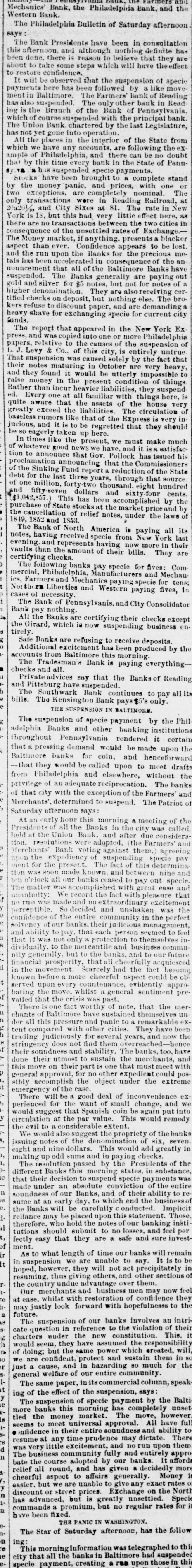 Mechanics Bank, Western Bank The of Bulletin Saturday afternool Philadelphia in been consultat has done. says Bank Presidents although have believe that definite they some and reason to have theed this aftern fternoon, there is steps which will of spect about take confidence. that the suspension by like Reading move here has been The followed Farmers Bank bank in Read course Baltended Baltimore The other of Pennsy bank of the Bank with the prit pincipal Levislature, the Branch chartered by the last from which Union Bank petterior of the State The yet gone into the interior are allowing the doubt the have places any account accounts. and the in the can state be of Ponn which we Philade "serv Iphia, every bank pa ements stand this time nded specie compt by to with The , a have been brough and price nominal money panic, comp etely Reading Railroad by the are were in The rate York in exceptions. transactions sixes at si little effect cities rates only and but City this had very beth between the Exchange black there are no quence of the anything nears to be lost The Money mark et, Confidence Adence fo the of the have than the Banks Banks aspect run upon rated Baltimore out and has the been of the generally are paying notes The that Banks but not for receiving wilver They nothing exempended for $0 notes, notes. also else. The hr but city higher checks on scount deposit paper and are for current efuse for exchange aging specie New York EX funds heavy shave that appeared in or the more Philadelp The report into one of the suspe untru and was to of the this causes city is entirely by the fact heav that & Co. solely are very to Levy October utterly impos impossible things That susper notes maturing it would be condition of suspend their they money found in the giet liabilities, things they here, very raise than incur hea all familiar with of the house Exp Rather Every aware oue at that the liabilities. assets The ess very should incious, taken we make and it up here must creatly baseless quite exceed rumors is to the like that of gretted the that they much tisfac tion to annout be times eagerly like the present, have.and Pollock and has issued hi Juction whatever since good that Gov that the Comm the State source of the the last three thousand thousand Sinking Fund report years, through eight that hundred cents of debt one for million, forty-to dollars and sixty-fou by th by of fifty weven This has been the market price the laws rehase 042,85 of State stocks relief at notes, under all its the cancellation 1852 and 1853. America is paying New York last than the The Bank of North specie from now more jo their are having received having bills They evening notes, and conresents amount of their for Aves: Com vaults certifying checks banks pay facturers specie and for Mechan tens here ties and Libert Inhia, Mant paying specie fives, 1: Philade Mecha West paying necessity and Ivanis City Pennsy Consolidator All except checks is which The Bank nothing. certify ing their business en Bank the Banks are now suspending deposits th a tirely the Girard, are refusing has to receive been produced by Safe Additional Banks itement this morning The Tradesman and all counts from Baltimore Bank is paying dvices the that say of Bank Readi Private adv nded. have suspet to all pay continues bills. The only THE IN SUSPENSION and The Pittsburg Sout Kensington wark Bank Bank MALTIMORM. pays The of the by specie ayment enspension Banks and other banking institutio it cert vania rendered Pennsy be demand th made would upon for and banks coin, called would to meet upon draf and the where, without The of the Farmers The Patriot meeting was due adopt in the perte the They that the object their on their no other under expect the good deal of change, could suggest at value the par be want small again put remedy There sienced for that Spanish coin This would the extent. of bank the We of the den This would add evil to the greatly in checks. notes dollars. esidents of the issuing and nine sums and in the substat volution morning passed by states in The this momand specie of the Banks enspend COD viction ability their decision bsolute of their that under of our Banks, and which end the Implic who sume will be day carefully upon this banki inst submit safe and are fectly therefore should they the Banks be play hold the notes to Josees, our and sure feel inves tations easy that of will our banks in to It is It what length are of unable time to act say ivitately sections AS suspension we they will not and other hoped, in howe giving cantage others, over them. now at ease. resuming thus ad men may they look justly our whilst with forward restoration with the count merchants undue and toration business fulnesss to th an intr. banks involves of future suspension of ference our to institution. the violation This. The suspended in new the respected. protect cate question Hoder the have assume med which greated, them 80 charte would seem, but they the same power and sustain much for the doing; are confide and in hazard rding community. speal cause, of out entire column, just welfare in its says Balt general same paper, of the suspension, by the is ing The of the effect of specie payment has complete unset ful seems in The banks suspethis suspension morning market The move, All ability have prudence run more tled the to meet set mone their universal entire approval whindness may dictate. and upon them approved was very by our decidedly infidence crume at little any community excitellite time ment. fully and and banks tirely afford mo The business course adopte and has given generally Money rates relief bate the all round, to affairs to riveany exact on the Nort has advance cheer ful aspect we are unable Exchange for discount anced, but but no promium, easier. but or street prices. greatly regular rates D commands have been fixed. PANIC IN WASHINGTON has the foll to th The Star of THE Saturday afternoor, was that city ink This morning all the b