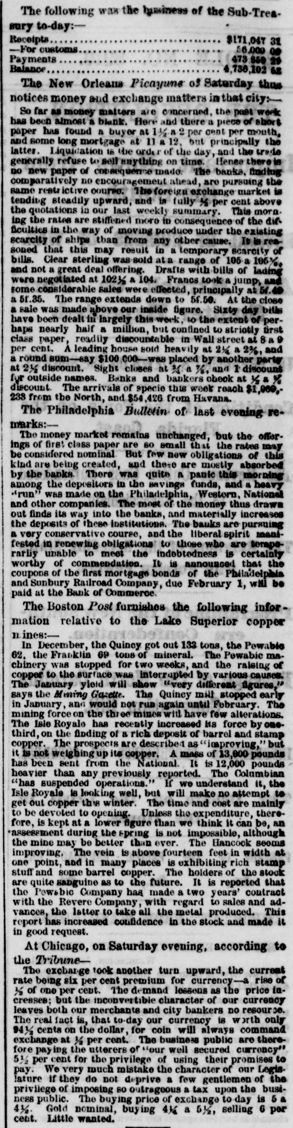 The following was the business of the Sub-Treasury to-day:Receipts $171,047 31 -For customs 56,009 00 Payments 473 859 29 Balance 4,736,102 62 The New Orleans Picayuns of Saturday thus notices money and exchange matters that city:So far as money matters are concerned, the past week has been almost a blank. Here and there a piece of short paper has found a buyer at 1/2.a.2 per cent per month, and some long mortgage at 11 a 12, but principally the latter. Liquidation 18 the order of the day, and the trade generally refuse to sell anything on time. Henee there is no new paper of consequence made. The banks. finding comparatively no encouragement ahead, are pursuing the same restr ictive course. The foreign exchange market is tending steadily upward, and is fully X per cent above the quotations in our last weekly summary. This morn. ing the rates are stiffened more in consequence of the dieficulties in the way of moving produce under the existing scarcity of ships than from any other cause. It is reasoned that this may result in a temporary scarcity of bills. Clear sterling was sold ata range of 105 106% and not a great deal offering. Drafts with bills of lading were negotiated at 102½ a 104. Francs took a jump, and some considerable sales were effected, principally at 51.40 a 5f.35. The range extends down to 5f.50. At the close a sale was made above our inside figure. Sixty day bills have been dealt in largely this week, to the extent of perhaps nearly half a million, but confined to strictly first class paper, readily discountable in Wall street at 8 a 9 per cent. À leading house sold heavily at 2½ a 2%, and a round sum-say $100 000-was placed by another party at 2½ discount. Sight closes at M a 7/8, and 1 discount for outside names. Banks and bankers check at ½ a % discount. The arrivals of specie this week reach $1,000,233 from the North, and $54 ,426 from Havana. The Philadelphia Bullotin of last evening remarks:-The money market remains unchanged, but the offerings of first class paper are 60 small that the rates may be considered nominal But few new obligations of this kind are being created, and these are mostly absorbed by the banks. There was quite a panic this morning among the depositors in the savings funds, and a heavy "run" was made on the Philadelphia, Western, National and other companies. The most of the money thus drawn out finds its way into the banks, and materially increases the deposits of these institutions. The banks are pursuing a very conservative course, and the liberal spirit manifested in renewing obligations to those who are temporariiy unable to meet the indebtedness is certainly worthy of commendation. It is announced that the coupons of the first mortgage bonds of the Philadelphia and Sunbury Railroad Company, due February 1, will be paid at the Bank of Commerce. The Boston Post furnishes the following information relative to the Lake Superior copper n. ines:In December, the Quincy got out 133 tons, the Pewable 62, the Franklin 69 tons of mineral. The Pewabic machinery was stopped for two weeks, and the raising of copper to the surface was interrupted by various causes. The January yield will show "very different figures,' says the Mining Gazette. The Quincy mill stopped early in January, and would not run again until February. The mining force on the the mines will have few alterations. The Isle Royale has recently increased its force by onethird, on the finding of a rich deposit of barrel and stamp copper. The prospects are described as "improving," but it is not weighing up its copper, A mass of 13,000 pounds has been sent from the National. It is 12,000 pounds heavier than any previously reported. The Columbian "has suspended operations." If we understand it, the Isle Royale is looking well, but will make no attempt to get out copper this winter. The time and cost are mainly to be devoted to opening. Unless the expenditure, therefore, is kept at a lower figure than we think it can be, an assessment during the spring is not impossible, although the mine may be better than ever. The Hancock seems improving. The vein is above fourteen feet in width at one point, and in many places is exhibiting rich stamp stuff and some barrel copper. The holders of the stock are quite sanguine as to the future. It is reported that the Pewsbic Company has made a two years' contract with the Revere Company, with regard to sales and advances, the latter to take all the metal produced. This report has increased confidence in the stock and made it in good request. At Chicago, on Saturday ovening, according to the TribuneThe exchange took another turn upward, the current rate being six per cent premium for currency-a rise of ½ of one per cebt. The demand lessens as the price increases; but the inconvertible character of our currency leaves both our merchants and city bankers no resour The real fact is, that to-day our currency is orth only 943/2 cents on the dollar, for coin will always command exchange at ½ per cent. The business public are therefore paying the utterers of "our well secured currency" 5½ per cent for the privilege of using their promises to pay. We very much mistake the character of our Legis. lature If they do not deprive a few gentlemen of the privilege of imposing 80 outrageous a tax upon the business public. The buying price of exchange to day is 5 a wanted. 4½. cent. Gold Little nominal, buying 41/4 a 5½, selling 6 per