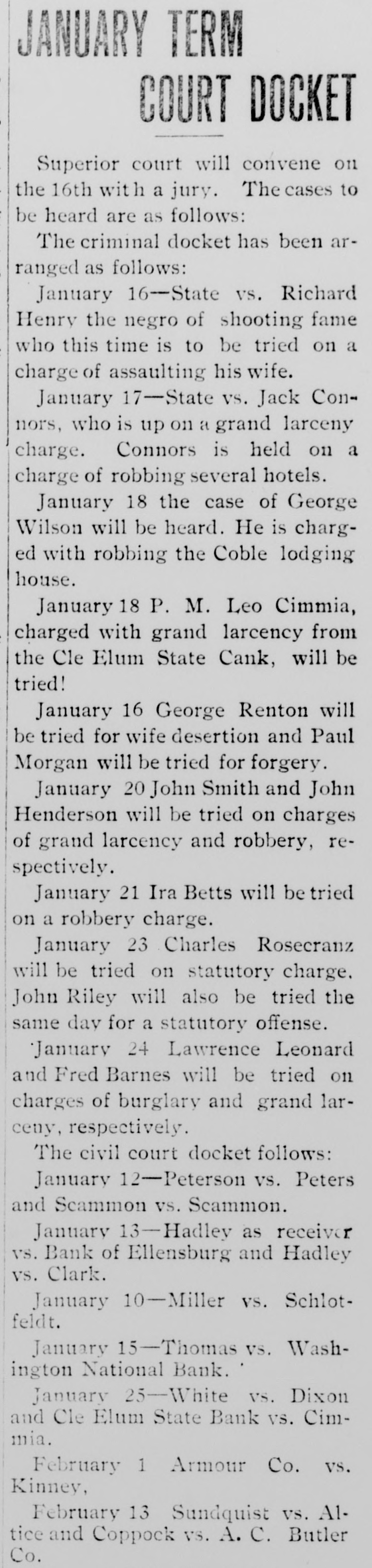 JANUARY TERM COURT DOCKET Superior court will convene on the 16th with a jury. The cases to be heard are as follows: The criminal docket has been arranged as follows: January 16-State vs. Richard Henry the negro of shooting fame who this time is to be tried on a charge of assaulting his wife. January 17-State vs. Jack Connors, who is up on a grand larceny charge. Connors is held on a charge of robbing several hotels. January 18 the case of George Wilson will be heard. He is charged with robbing the Coble lodging house. January 18 P. M. Leo Cimmia, charged with grand larcency from the Cle Elum State Cank, will be tried! January 16 George Renton will be tried for wife desertion and Paul Morgan will be tried for forgery. January 20 John Smith and John Henderson will be tried on charges of grand larcency and robbery, respectively. January 21 Ira Betts will be tried on a robbery charge. January 23 Charles Rosecranz will be tried on statutory charge. John Riley will also be tried the same day for a statutory offense. January 24 Lawrence Leonard and Fred Barnes will be tried on charges of burglary and grand larceny, respectively. The civil court docket follows: January 12-Peterson vs. Peters and Scammon vs. Scammon. January 13-Hadley as receiver vs. Bank of Ellensburg and Hadley vs. Clark. January 10-Miller vs. Schlotfeldt. January 15-Thomas vs. Washington National Bank. January 25-White vs. Dixon and Cle Elum State Bank vs. Cimmia. February 1 Armour Co. vs. Kinney, February 13 Sundquist vs. Altice and Coppock vs. A. C. Butler Co.