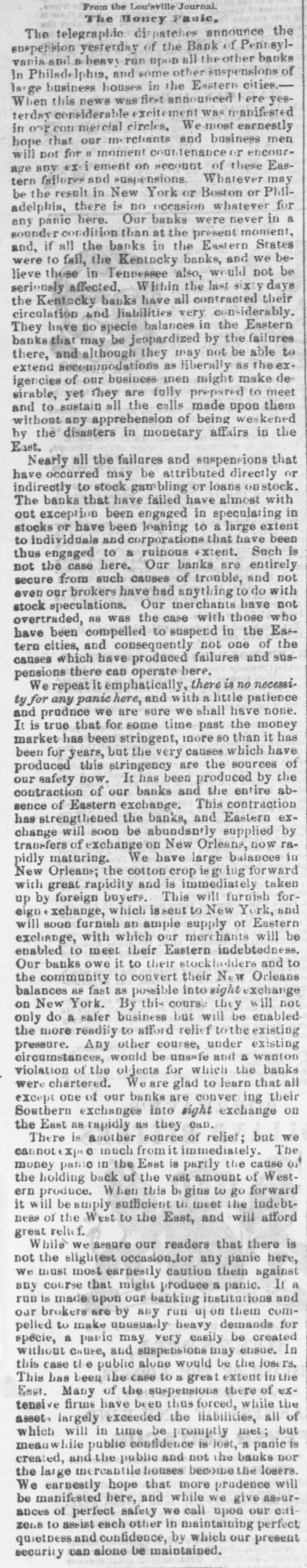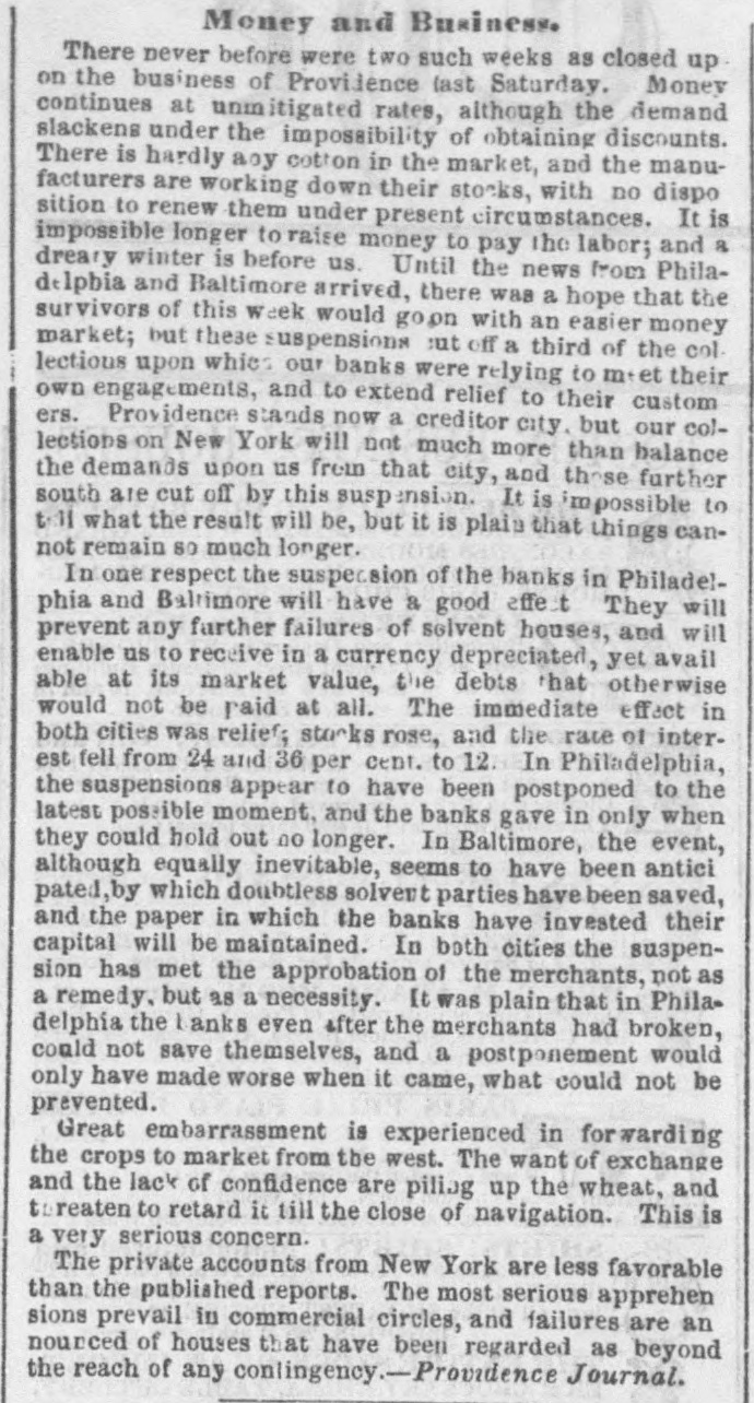 Money and Business. There never before were two such weeks as closed up. on the business of Providence last Saturday. Money continues at unmitigated rates, although the demand slackens under the impossibility of obtaining discounts. There is hardly any cotton in the market, and the manufacturers are working down their stocks, with no dispo sition to renew them under present circumstances. It is impossible longer to raise money to pay the labor; and 8 dreavy winter is before us. Until the news from Philadelpbia and Baltimore arrived, there was a hope that the survivors of this week would goon with an eagier money market; but these suspensions at off a third of the col. lections upon which our banks were relying to their own engagements, and to extend relief to their custom ers. Providence stands now a creditor city. but our collections on New York will not much more than balance the demands upon us from that city, and those further south are cut off by this suspension. It is impossible to till what the result will be, but it is plain that things cannot remain 80 much longer. In one respect the suspession of the banks in Philadelphia and Baltimore will have a good effect They will prevent any further failures of solvent houses, and will enable us to receive in a currency depreciated, yet avail able at its market value, the debts that otherwise would not be raid at all. The immediate effect in both cities was relief; stocks rose, and the rate of interest fell from 24 and 36 per cent. to 12. In Philadelphia, the suspensions appear to have been postponed to the latest possible moment, and the banks gave in only when they could hold out no longer. In Baltimore, the event, although equally inevitable, seems to have been antici pated, by which doubtless solvent parties have been saved, and the paper in which the banks have invested their capital will be maintained. In both cities the suspension has met the approbation of the merchants, not as a remedy. but as a necessity. It was plain that in Philadelphia the 1 anks even after the merchants had broken, could not save themselves, and a postponement would only have made worse when it came, what could not be prevented. Great embarrassment is experienced in forwarding the crops to market from the west. The want of exchange and the lack of confidence are piliag up the wheat, and toreaten to retard it till the close of navigation. This is a very serious concern. The private accounts from New York are less favorable than the published reports. The most serious apprehen sions prevail in commercial circles, and failures are an nounced of houses that have been regarded as beyond the reach of any conlingency.-Providence Journal.