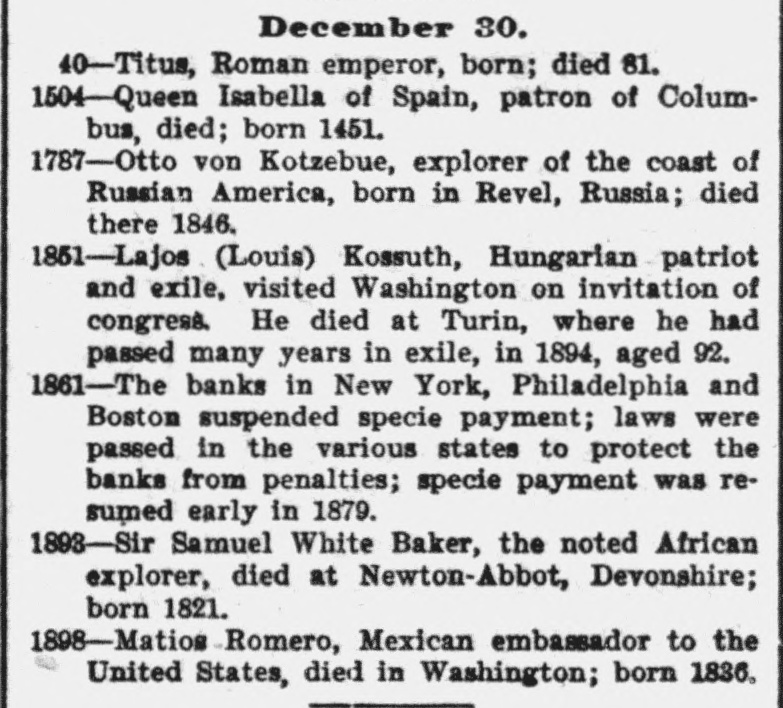 December 30. 40-Titus, Roman emperor, born; died 81. 1504 Queen Isabella of Spain, patron of Columbus, died; born 1451. 1787-Otto von Kotzebue, explorer of the coast of Russian America, born in Revel, Russia; died there 1846. 1851-Lajos (Louis) Kossuth, Hungarian patriot and exile, visited Washington on invitation of congress. He died at Turin, where he had passed many years in exile, in 1894, aged 92. 1861-The banks in New York, Philadelphia and Boston suspended specie payment; laws were passed in the various states to protect the banks from penalties; specie payment was resumed early in 1879. 1893-Sir Samuel White Baker, the noted African explorer, died at Newton-Abbot, Devonshire; born 1821. 1898-Matios Romero, Mexican embassador to the United States, died in Washington; born 1836,
