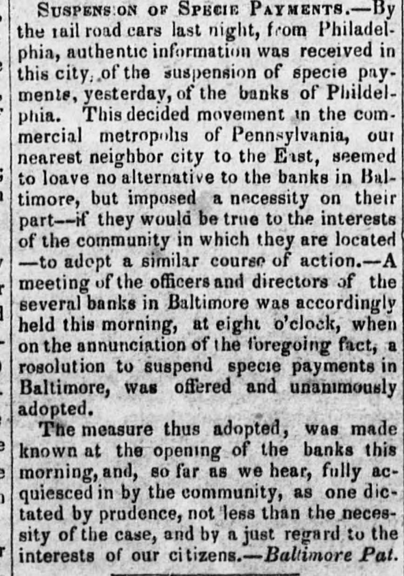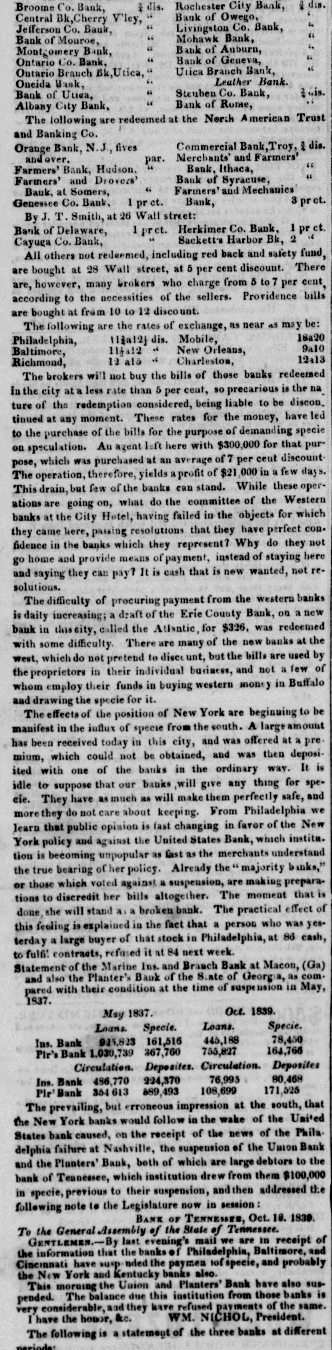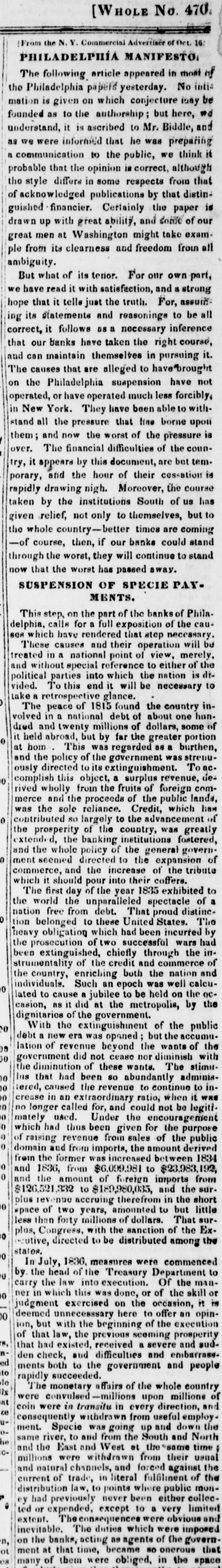 but, unwilling to create an unnecessary excitement, we merely said, in opposition to the Inquirer, which asserted the impossibility of a suspension, that it would take place very soon.--Our forebodings have been realized! This morning the unwelcome truth burst upon our citizens like a thunder clap All was suspense and consternation!- The day AFTER the ELECTION, too!! thereby proving it to be a piece of premeditated villainy-an outrageous conspiracy, between the banks and the Whig party, to promote the interests of the one, and the success of the other. If the banks had suspended but one day sooner, the whole Democratic city ticket would have been elected; for there is no man, no voter, no honest citizen, who would not have seen, who would not have felt, the iden- tity between the Bank Dynasty, Bank Tyranny, Bank Interest, and the domination throughout Philadelphia of Whig principles and their pernicious tendency. A spontaneous meeting of the people was held this morning, in consequence of the excitement (which may be found in another column) at the District Court-room, to take the subject into consideration: Lemuel Payn- ter, our Representative from the Ist Congressional Dis- trict, was called to the Chair, and Thomas Vaughan, C. V. Hagner, C. A. Koehler, William H. Hartnet, and J. Rutherford, sr., were appointed Vice Presidents, and Joseph M. Doran, Secretary. Mr. Doran made an eloquent speech on the occasion, and was pertinently followed by W. L Hirst and E. A Penniman-the lat- ter, one of our Representatives elect to the State Legis- lature. Like bold hearts, but true to the cause of De- mocracy and good morals, they deprecated all resort to violent action, even while they considered most unjustifi- ble this last high handed and atrocious act of our special privileged Corporations. They dwelt upon the beauty of a strict adherence to the law in a virtuous and well governed community, and begged the adoption on the part of the people of firm, but peaceable measures: in fine, to do nothing wrong, but to submit to nothing that was not unquestionably right. A Committee was ap- pointed, which will report to another meeting, to be held in Independence Square, on Saturday afternoon next at 4 o'clock. We want words to express our abhorrence of this last specimen of Philadelphia dishonesty! Citizens! look to it. It is thus ye are imposed upon; it is thus ye are trifled with; it is thus ye are deliberately cheated by your own privileged creatures, and then mocked at and despised for your credulity and long suffering. [Philad. Spirit of the Times, Oct. 10. # GREAT MEETING An immense concourse of ci- tizens, assembled without previous notice, at the county Court-house, yesterday morning about eleven o'clock, on learning the news that the banks of Philadelphia had suspended specie payment. The hall and avenues were thronged, and on motion of Jos. M. Doran, Esq, a meet- ing was organised by calling the Hon. LEMUEL PAYNTER to the Chair, and electing the following officers:--Thos Vaughan, Sen., Charles A. Koehler, George Hoffman. Joseph M. Doran, Wm. H. Hartnet, Wm W. Weeks, Charles V Hagner, John Rutherford, Sr., Abel M James, Thomas Daily, Vice Presidents; Augustus E Armstrong, Samuel C. Thompson, Edward G. Webb, Secretaries. On motion of C. F B. O'Neill, Esq it was Resolved, That a committee be appointed to inquire into the object of the meeting, and report facts and reso- lutions to a general meeting of the citizens of the city