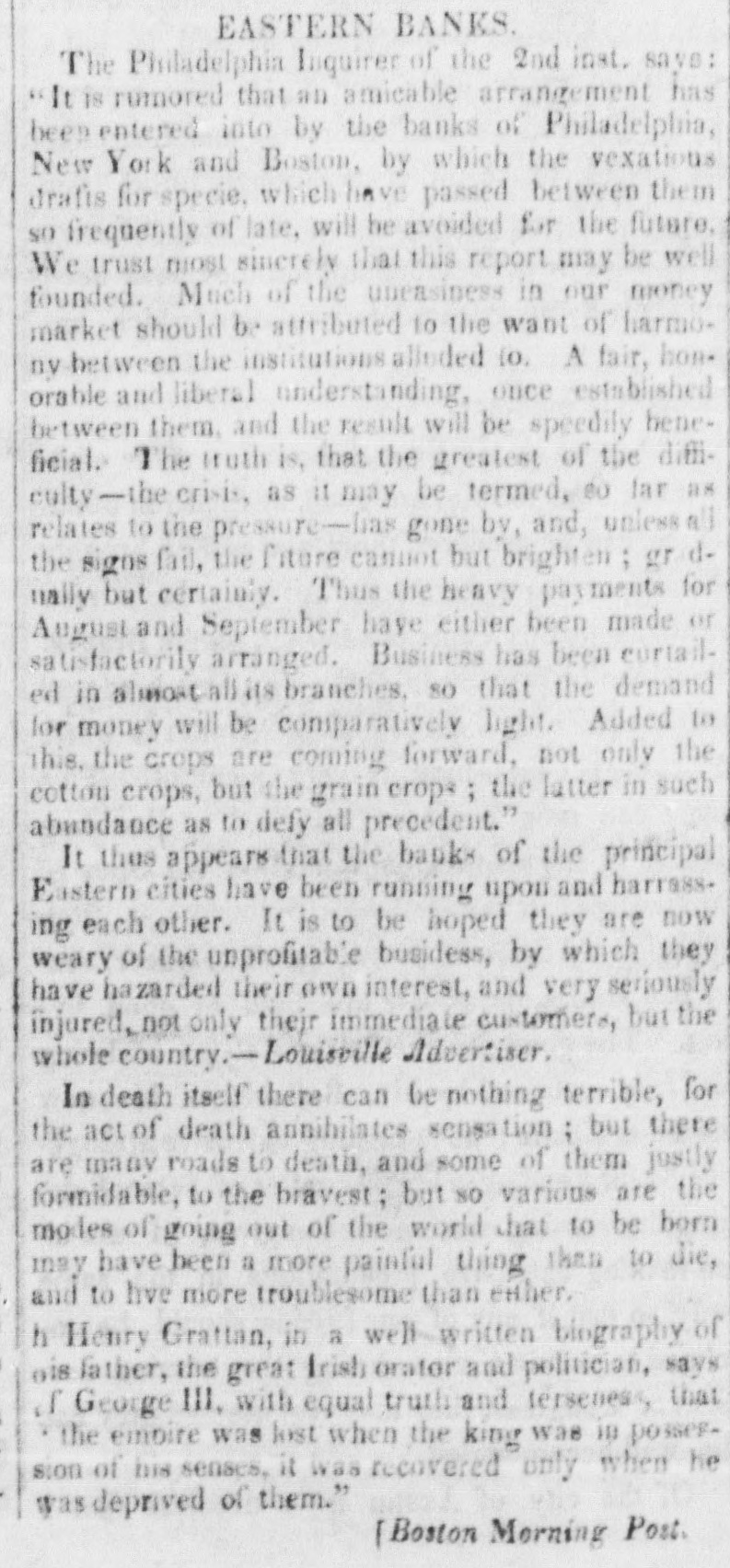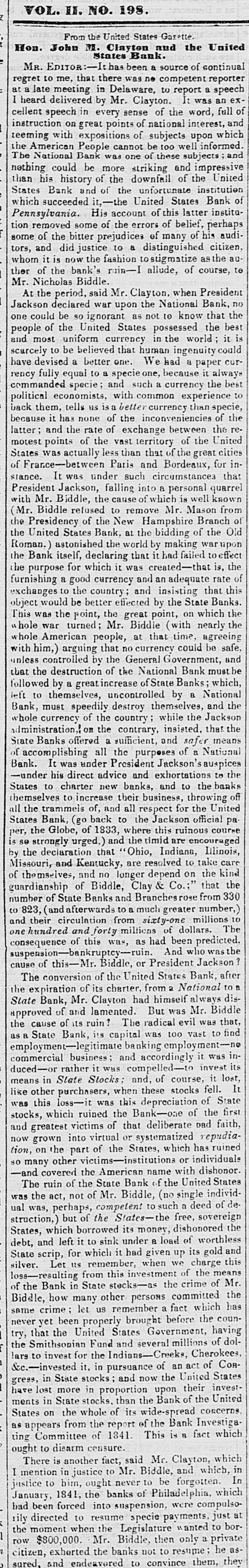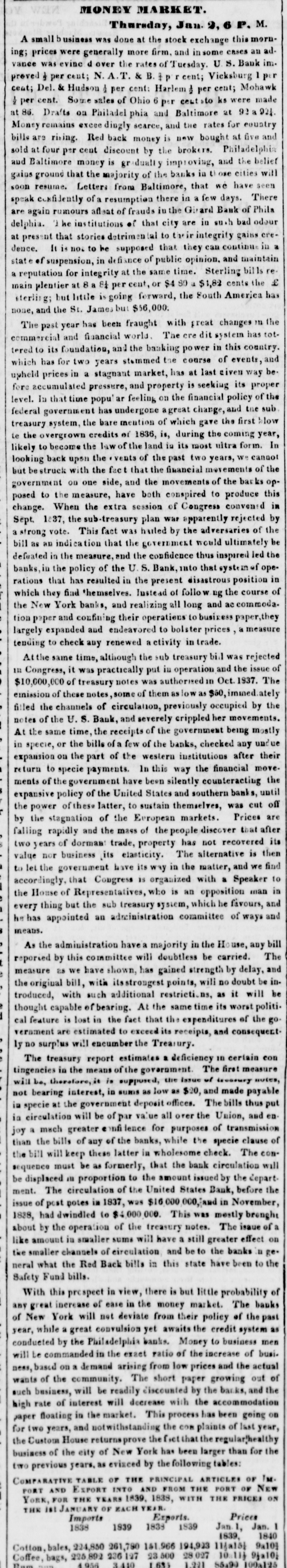 but, unwilling to create an unnecessary excitement, we merely said, in opposition to the Inquirer, which asserted the impossibility of a suspension, that it would take place very soon.--Our forebodings have been realized! This morning the unwelcome truth burst upon our citizens like a thunder clap All was suspense and consternation!- The day AFTER the ELECTION, too!! thereby proving it to be a piece of premeditated villainy-an outrageous conspiracy, between the banks and the Whig party, to promote the interests of the one, and the success of the other. If the banks had suspended but one day sooner, the whole Democratic city ticket would have been elected; for there is no man, no voter, no honest citizen, who would not have seen, who would not have felt, the iden- tity between the Bank Dynasty, Bank Tyranny, Bank Interest, and the domination throughout Philadelphia of Whig principles and their pernicious tendency. A spontaneous meeting of the people was held this morning, in consequence of the excitement (which may be found in another column) at the District Court-room, to take the subject into consideration: Lemuel Payn- ter, our Representative from the Ist Congressional Dis- trict, was called to the Chair, and Thomas Vaughan, C. V. Hagner, C. A. Koehler, William H. Hartnet, and J. Rutherford, sr., were appointed Vice Presidents, and Joseph M. Doran, Secretary. Mr. Doran made an eloquent speech on the occasion, and was pertinently followed by W. L Hirst and E. A Penniman-the lat- ter, one of our Representatives elect to the State Legis- lature. Like bold hearts, but true to the cause of De- mocracy and good morals, they deprecated all resort to violent action, even while they considered most unjustifi- ble this last high handed and atrocious act of our special privileged Corporations. They dwelt upon the beauty of a strict adherence to the law in a virtuous and well governed community, and begged the adoption on the part of the people of firm, but peaceable measures: in fine, to do nothing wrong, but to submit to nothing that was not unquestionably right. A Committee was ap- pointed, which will report to another meeting, to be held in Independence Square, on Saturday afternoon next at 4 o'clock. We want words to express our abhorrence of this last specimen of Philadelphia dishonesty! Citizens! look to it. It is thus ye are imposed upon; it is thus ye are trifled with; it is thus ye are deliberately cheated by your own privileged creatures, and then mocked at and despised for your credulity and long suffering. [Philad. Spirit of the Times, Oct. 10. # GREAT MEETING An immense concourse of ci- tizens, assembled without previous notice, at the county Court-house, yesterday morning about eleven o'clock, on learning the news that the banks of Philadelphia had suspended specie payment. The hall and avenues were thronged, and on motion of Jos. M. Doran, Esq, a meet- ing was organised by calling the Hon. LEMUEL PAYNTER to the Chair, and electing the following officers:--Thos Vaughan, Sen., Charles A. Koehler, George Hoffman. Joseph M. Doran, Wm. H. Hartnet, Wm W. Weeks, Charles V Hagner, John Rutherford, Sr., Abel M James, Thomas Daily, Vice Presidents; Augustus E Armstrong, Samuel C. Thompson, Edward G. Webb, Secretaries. On motion of C. F B. O'Neill, Esq it was Resolved, That a committee be appointed to inquire into the object of the meeting, and report facts and reso- lutions to a general meeting of the citizens of the city