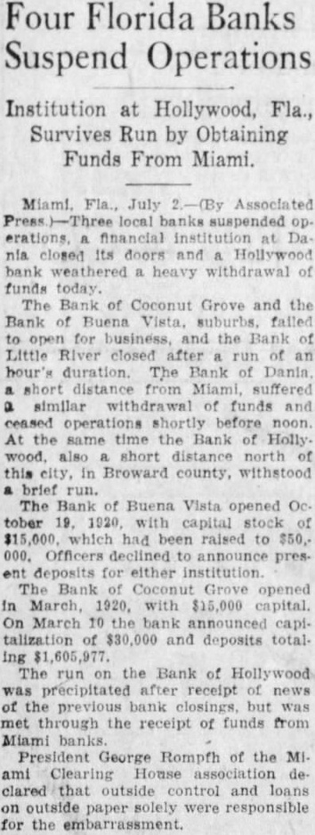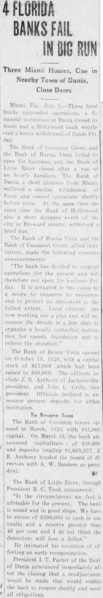 LORIDA BANKS STOP OPERATION Three in Miami-Run on Hollywood InstitutionBlame Loans. MIAMI, Fla., July Three local operations. financial institution at Dania closed its doors and a Hollywood weath heavy withdrawal of funds today The Bank of Cocoanut Grove and the Bank of Buena Vista falled to open for and the Bank of Little after an hour's duration The Bank of Dania, short distance Miami suffered similar withdrawal of funds and ceased operations shortly before noon At the same the Bank of Hollywood also short distance north this in Broward county, withstood a brief run. MAKE ANNOUNCE The Bank of Buena Vista and the Bank of Cocoanut Grove allied institutions, made the following separate an"The bank has decided to suspend operations for the and will therefore, not open for today It is actuated in this cause by desire to its and to protect its to the fullest extent. Local citizens now are working on plan and will announce the details in few days to organize locally controlled institution for speedy liquidation and to relieve the situa- The Bank of Buena Vista opened on capital stock of $15,000. had been raised to The officers include R. Anthony of president and John Grife vice Officials declined to announce present deposits for either The Bank March 1920. with $15,000 capital On March 10 the bank capitalizati of and deposits totaling the board of directors with A. Sanders president The Bank of Little River, through President B. Teed we feel It advisable And designble to oper ation for the present The bank is sound and good shape. We have in excess of $200,000 in cash in our vaults and a reserve than 40 per cent. do think the depositors will lose EXPECT He intimated his intention of effecting an early reorganization President I. T. Parker of the Bank of Dania announced after closing that readjustment would be made that would enable the bank to reopen short and meet all obligations. The run the Bank of wood was fter receipt news of the bank closings, but was met through the receipt of funds from Miami The run subsided shortafter President George the Miami House in the of suburban that control and loss on outside paper solely were responsible for the embar