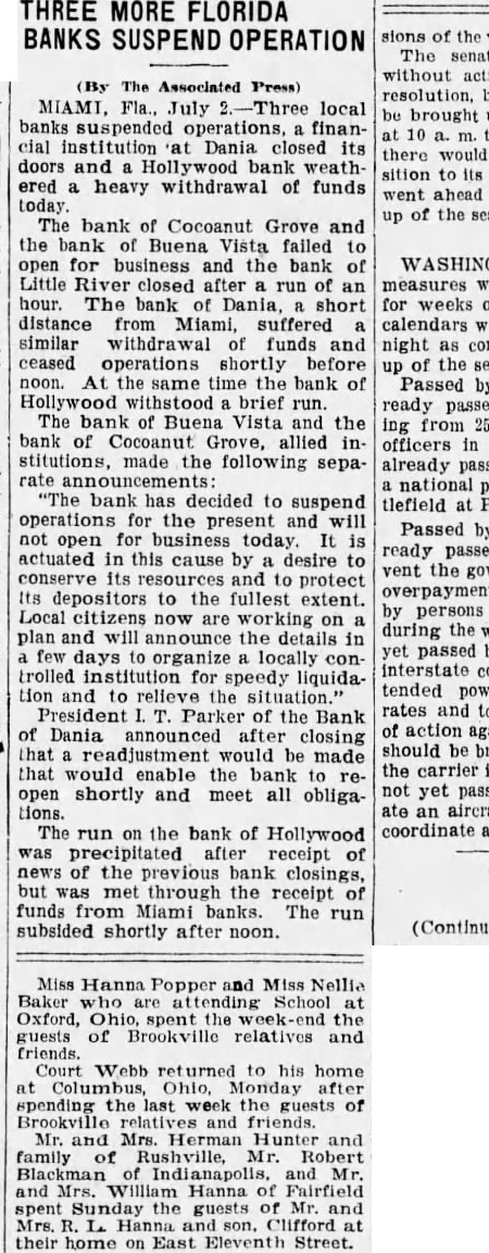 THREE MORE FLORIDA BANKS SUSPEND OPERATION (By The Associated Press) MIAMI. July local banks suspended operations, financial institution Dania closed its doors and Hollywood bank weathered heavy withdrawal of funds today. The bank of Cocoanut Grove and the Buena Vista failed open business the bank of Little River closed after run hour. The of Dania, short distance from Miami, suffered similar withdrawal funds and ceased operations shortly before noon. At the same time the bank of Hollywood brief run. The bank Buena Vista the 250 bank of Cocoanut Grove, allied stitutions, made the following separate "The bank decided to suspend operations for the present and will Passed by open for business today It actuated in this cause by desire to conserve its and to protect Its depositors the fullest extent. Local citizens now are on plan announce the details in days organize locally controlled institution for speedy liquidaand the situation." President Parker of the Bank Dania announced closing that readjustment would be made would the bank open shortly and meet all obligations. The run on the bank of Hollywood precipitated receipt the bank closings, but was met through the receipt funds from Miami banks. The run subsided shortly after noon. Miss Hanna Popper and Miss Nellia Baker are School Oxford, spent the guests of Brookville relatives and friends. Webb his home Columbus, spending the of Brookville friends. Mr. and Mrs. Herman Hunter and family of Rushville, Robert and Mr. Hanna Fairfield guests of Clifford their home on East Eleventh Street.