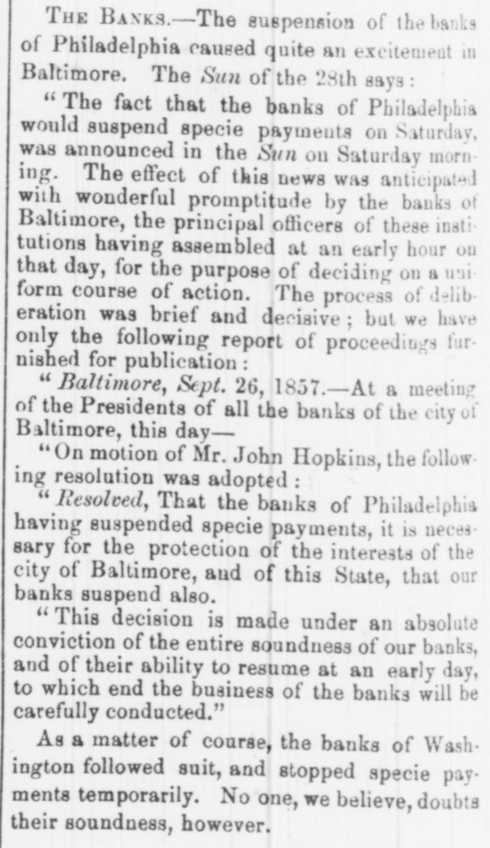 WASHINGTON CITY. SATURDAY EVENING. SEPT. 26. 1857. BANK SUSPENSIONS IN PHILADELPHIA, BALTIMORE, AND WASHINGTON. By referring to the telegraphic column it will be observed that the banks of Philadelphia have partially, and in some instances wholly, suspended specie payments. As a matter of precaution-it i is 80 alleged-the banks of Baltimore suspended specie payments to-day ; and from the same cause a similar course was adopted this morning by the Patriotic Bank and the Bank of Washington of this city. It may reasonably be expected that a large number of new and irresponsible banks in the North, East, and West, taking advantage of the general panic, will nominally refuse to part with what they really do not possess. The sooner these worthless institutions are out of the way the better it will be for all classes of the community. As a general rule, the southern banks are in a sound condition; and, with large and increasing resources at command, they will be able, with few, if any, exceptions, to weather the present storm with undiminished credit. The condition of the banks in the city of New York is such as to warrant the belief that their resources are fully equal to meet existing emergencies. Their strength will force the suspending banks into liquidation or the speedy resumption of specie payments. Looking at home, we can see nothing in the financial affairs of this city to warrant alarm or distrust. Our citizens are not suffering from the effects of overtrading or over-speculating; and the cash means of our banks are not locked up in protested paper or the depreciated bonds and stocks of "fancy" railroads. At no period in the history of our city was the condition of our merchants, hotel keepers, mechanics, traders, and real-estate owners more prosperous and promising than it is at the present time. Never before were clerks, journeymen, and laborers as liberally and promptly paid as now; and we venture to say that the balance-sheets of our banks show as large net profits for the past year as for any previous year of their existence. Compared with Baltimore, Philadelphia, New York, Boston, Cincinnati, or any other northern, eastern, or western city, the financial condition of Washington should be a source of congratulation instead of a cause for alarm. But still, with all our substantial means at command, with general freedom from debt and general well-paid employment, we are free to confess that a money panic and a money crisis can be soon got up in the federal capital, if our citizens desire such an expensive luxury. Let each distrust the other-let the usual money accommodations be withheld-and let all engage in the confidence-imparting business of withdrawing specie from the banks and the ordinary channels of trade for 'hoarding" purposes, and not many days or even hours will elapse before the business men of Washington are suffering as their brethren of New York and Philadelphia now suffer. Let the citizens of Washington have a true, realizing sense of their really prosperous condition, and the troubles which they invoke by their fears and distrust will not come near them. A "run" was made on the Bank of the Metropolis to-day, but it was met so cheerfully and promptly by the custodians of its well-filled vaults, that confidence was soon restored to depositors and noteholders.