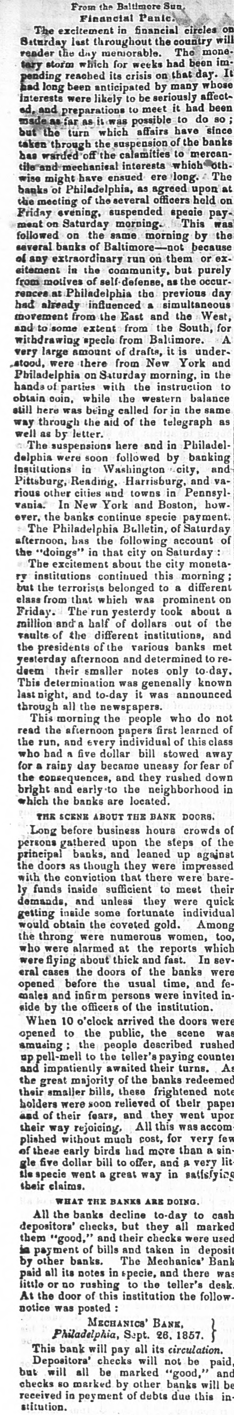 Part of the nationwide Panic of 1857 (failures such as Ohio Life & Trust and general financial panic) produced heavy withdrawals from Philadelphia banks on Sept. 26, 1857.