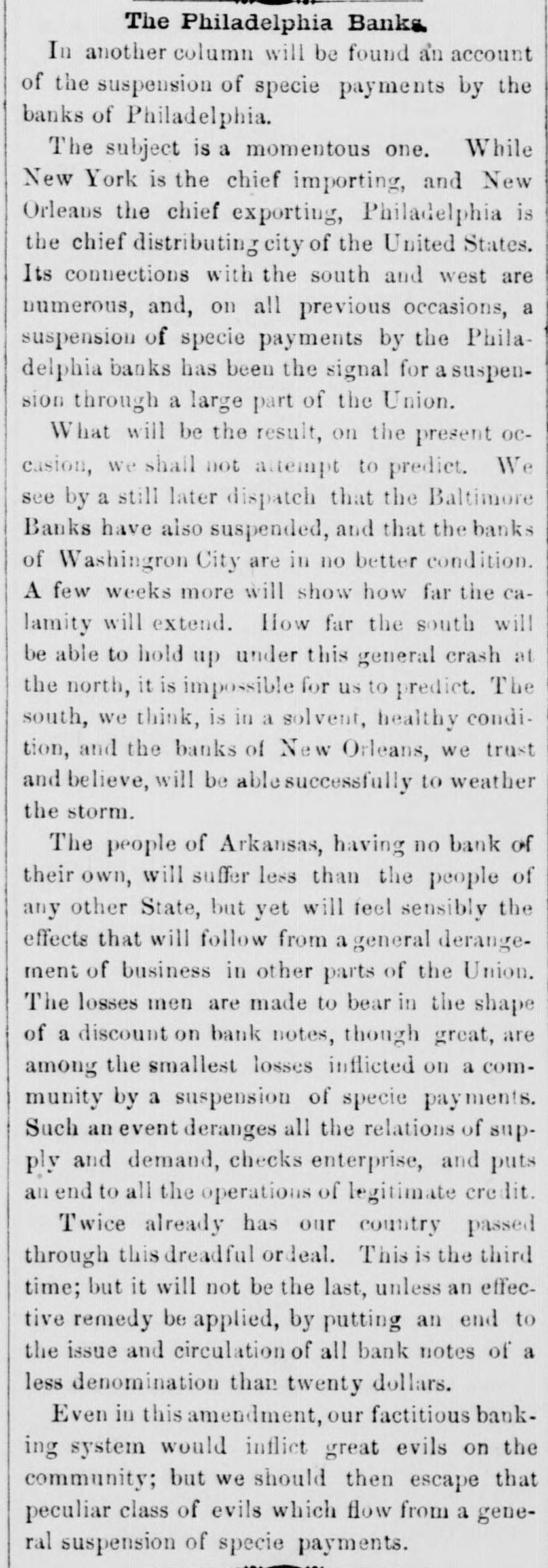 The Philadelphia Banks In another column will be found an account of the suspension of specie payments by the banks of Philadelphia. The subject is a momentous one. While New York is the chief importing, and New Orleans the chief exporting, Philadelphia is the chief distributing city of the United States. Its connections with the south and west are numerous, and, on all previous occasions, a suspension of specie payments by the Philadelphia banks has been the signal for a suspension through a large part of the Union. What will be the result, on the present OCcasion, we shall not attempt to predict. We see by a still later dispatch that the Baltimore Banks have also suspended, and that the banks of Washingron City are in no better condition. A few weeks more will show how far the calamity will extend. How far the south will be able to hold up under this general crash at the north, it is impossible for us to predict. The south, we think, is in a solvent, healthy condition, and the banks of New Orleans, we trust and believe, will be ablesuccessfully to weather the storm. The people of Arkansas, having no bank of their own, will suffer less than the people of any other State, but yet will feel sensibly the effects that will follow from a general derangement of business in other parts of the Union. The losses men are made to bear in the shape of a discount on bank notes, though great, are among the smallest losses inflicted on a community by a suspension of specie payments. Such an event deranges all the relations of supply and demand, checks enterprise, and puts an end to all the operations of legitimate credit. Twice already has our country passed through this dreadful ordeal. This is the third time; but it will not be the last, unless an effective remedy be applied, by putting an end to the issue and circulation of all bank notes of a less denomination than twenty dollars. Even in this amendment, our factitious banking system would inflict great evils on the community; but we should then escape that peculiar class of evils which flow from a general suspension of specie payments.