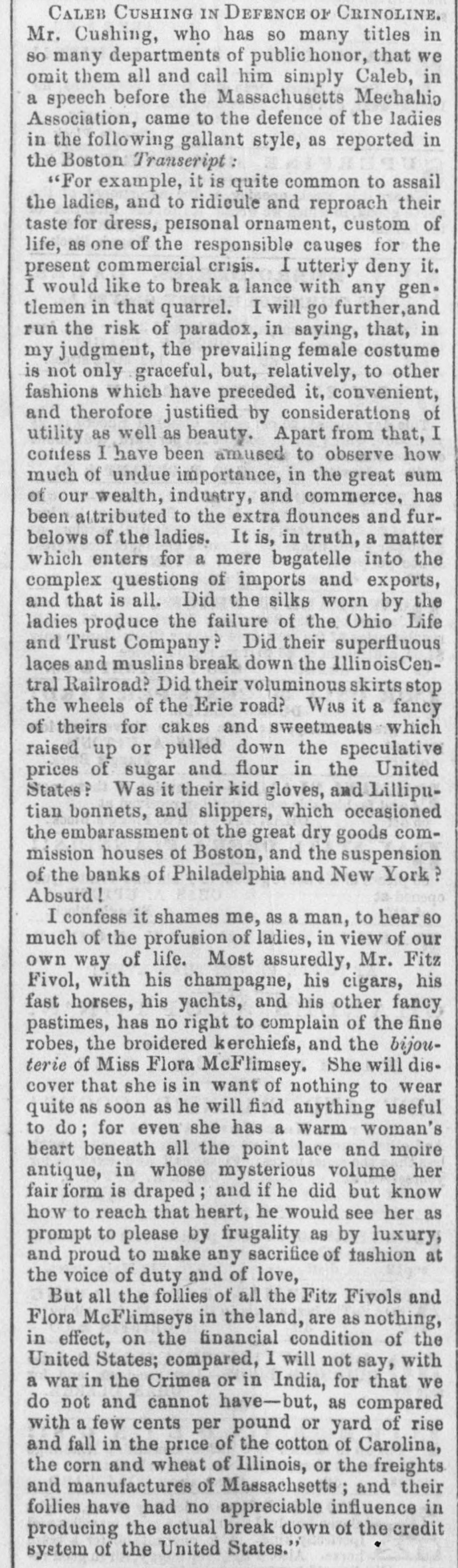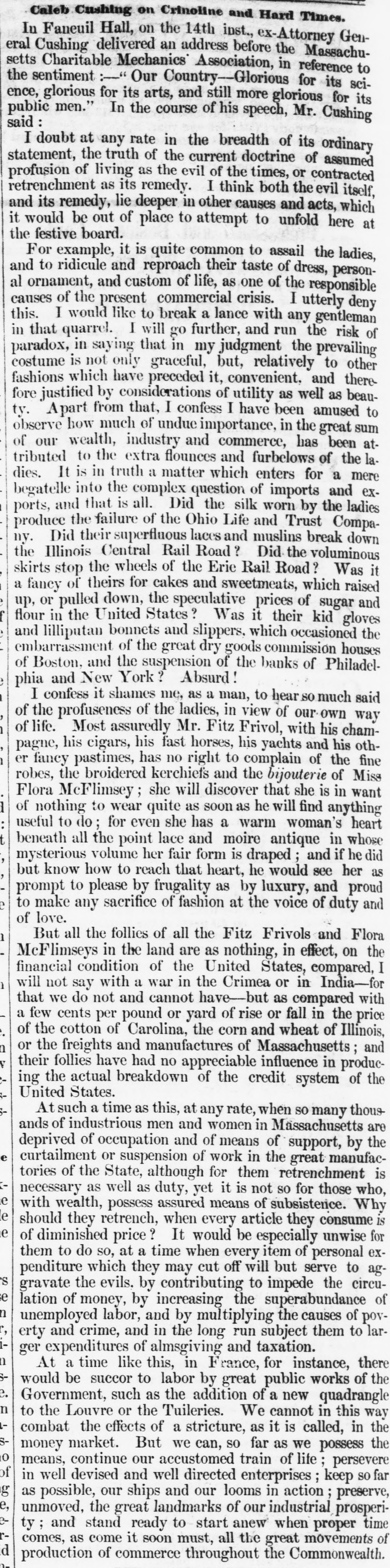 # Caleb Cushing on Crinoline and Hard Times. In Faneuil Hall, on the 14th inst., ex-Attorney General Cushing delivered an address before the Massachusetts Charitable Mechanics Association, in reference to the sentiment:"Our Country--Glorious for its science, glorious for its arts, and still more glorious for its public men." In the course of his speech, Mr. Cushing said: I doubt at any rate in the breadth of its ordinary statement, the truth of the current doctrine of assumed profusion of living as the evil of the times, or contracted retrenchment as its remedy. I think both the evil itself, and its remedy, lie deeper in other causes and acts, which it would be out of place to attempt to unfold here at the festive board. For example, it is quite common to assail the ladies, and to ridicule and reproach their taste of dress, personal ornament, and custom of life, as one of the responsible causes of the present commercial crisis. I utterly deny this. I would like to break a lance with any gentleman in that quarrel. I will go further, and run the risk of paradox, in saying that in my judgment the prevailing costume is not only graceful, but, relatively to other fashions which have preceded it, convenient, and therefore justified by considerations of utility as well as beauty. Apart from that, I confess I have been amused to observe how much of undue importance, in the great sum of our wealth, industry and commerce, has been attributed to the extra flounces and furbelows of the ladies. It is in truth a matter which enters for a mere begatelle into the complex question of imports and exports, and that is all. Did the silk worn by the ladies produce the failure of the Ohio Life and Trust Company. Did their superfluous laces and muslins break down the Illinois Central Rail Road? Did the voluminous skirts stop the wheels of the Erie Rail Road? Was it a fancy of theirs for cakes and sweetmeats, which raised up, or pulled down, the speculative prices of sugar and flour in the United States? Was it their kid gloves and lilliputan bonnets and slippers, which occasioned the embarrassment of the great dry goods commission houses of Boston, and the suspension of the banks of Philadelphia and New York? Absurd! I confess it shames me, as a man, to hear so much said of the profuseness of the ladies, in view of our own way of life. Most assuredly Mr. Fitz Frivol, with his champagne, his cigars, his fast horses, his yachts and his other fancy pastimes, has no right to complain of the fine robes, the broidered kerchiefs and the bijouterie of Miss Flora McFlimsey; she will discover that she is in want of nothing to wear quite as soon as he will find anything useful to do; for even she has a warm woman's heart beneath all the point lace and moire antique in whose mysterious volume her fair form is draped; and if he did but know how to reach that heart, he would see her as prompt to please by frugality as by luxury, and proud to make any sacrifice of fashion at the voice of duty and of love. But all the follies of all the Fitz Frivols and Flora McFlimseys in the land are as nothing, in effect, on the financial condition of the United States, compared, I will not say with a war in the Crimea or in India-for that we do not and cannot have-but as compared with a few cents per pound or yard of rise or fall in the price of the cotton of Carolina, the corn and wheat of Illinois, nor the freights and manufactures of Massachusetts; and their follies have had no appreciable influence in producing the actual breakdown of the credit system of the United States. At such a time as this, at any rate, when so many thousands of industrious men and women in Massachusetts are deprived of occupation and of means of support, by the curtailment or suspension of work in the great manufactories of the State, although for them retrenchment is necessary as well as duty, yet it is not so for those who, with wealth, possess assured means of subsistence. Why should they retrench, when every article they consume is of diminished price? It would be especially unwise for them to do so, at a time when every item of personal expenditure which they may cut off will but serve to aggravate the evils, by contributing to impede the circulation of money, by increasing the superabundance of unemployed labor, and by multiplying the causes of poverty and crime, and in the long run subject them to larger expenditures of almsgiving and taxation. At a time like this, in France, for instance, there would be succor to labor by great public works of the Government, such as the addition of a new quadrangle to the Louvre or the Tuileries. We cannot in this way combat the effects of a stricture, as it is called, in the money market. But we can, so far as we possess the means, continue our accustomed train of life; persevere in well devised and well directed enterprises; keep so far as possible, our ships and our looms in action; preserve, unmoved, the great landmarks of our industrial prosperity; and stand ready to start anew when proper time comes, as come it soon must, all the great movements of production of commerce throughout the Commonwealth.