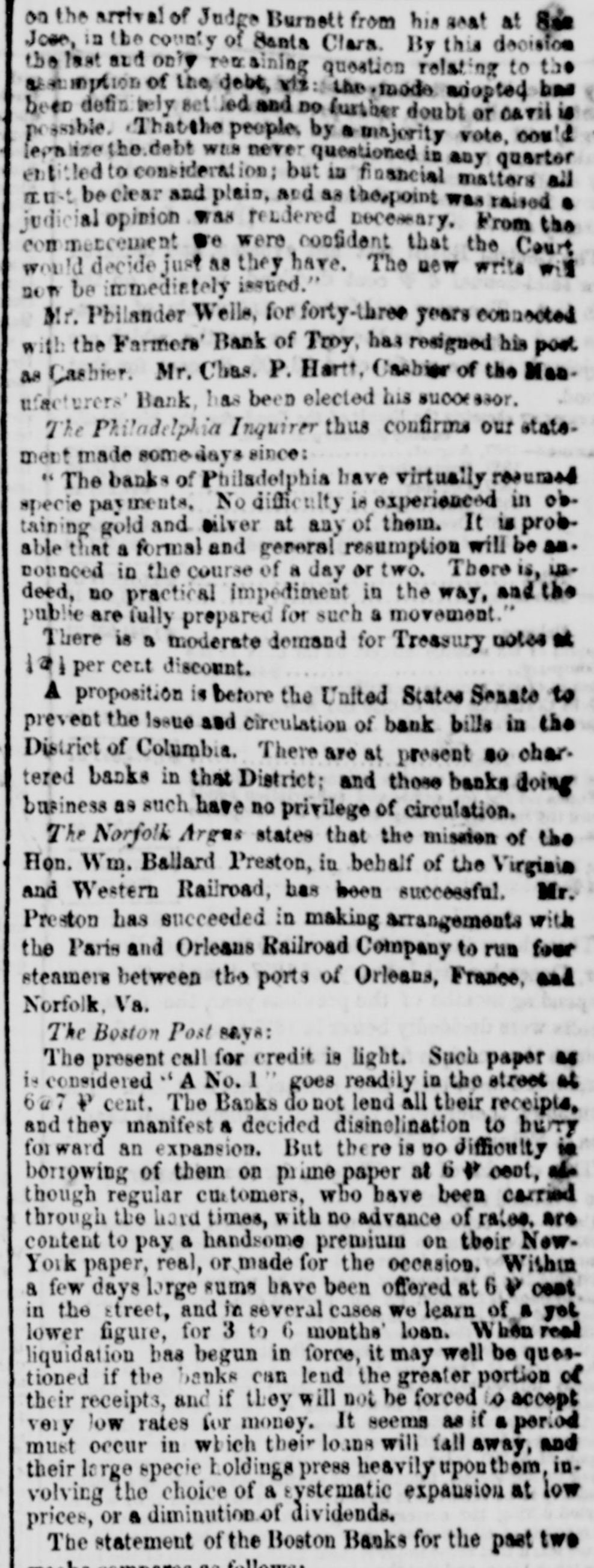 on the arrival of Judge Burnett from his gest at Sie Jose, in the county of Santa Clara. By this decision the last and only remaining question relating to the strupption of the debt, viz: mode adopted has been defin bely set led and no further doubt or cavil is possible. That he peoples by a majority vote, could fegalize the debt was never questioned in any quarter entitled must be to clear consideration: and plain, and but as in the,point financial was matters raised all . judicial opinion was reudered necessary. From the con mencement we were confident that the Court would decide just as they have. The new write will non be immediately issued. Mr. Pbilander Welle, for forty-three years connected with the Farmers' Bank of Troy, has resigned his post as Cashier. Mr. Chas. P. Hartt, Cashier of the Mas. ufacturers' Bank, has been elected his successor. The Philadelphia Inquirer thus confirms our state. ment made somedays since: " The banks of Philadelphia have virtually resumed specie payments. No difficulty is experienced in ob. taining gold and oilver at any of them. It is probable that a formal and general resumption will be ss. counced in the course of a day or two. There is, 5. deed, no practical impediment in the way, and the public are fully prepared for such a movement. There is a moderate demand for Treasury notes at 101 per cent discount. A proposition is before the United States Senate to prevent the Issue and circulation of bank bills in the District of Columbia. There are at present so ohar. tered banks in that District; and those banks doing business as such have no privilege of circulation. The Norfolk Argus states that the mission of the Hon. Wm. Ballard Preston, in behalf of the Virginia and Western Railroad, has been successful. Mr. Preston has succeeded in making arrangements with the Paris and Orleans Railroad Company to run four steamers between the ports of Orleans, France, and Norfolk Va. The Boston Post says: The present call for credit is light. Such paper as is considered A No. 1 goes readily in the street at 6@7 ₽ cent. The Banks do not lend all their receipts, and they manifest & decided disinclination to bury for ward an expansion. But there is DO difficulty is borrowing of them on prime paper at 6 v cent, as though regular customers, who have been carried through the hard times, with no advance of rates, are content to pay a handsome premium on tboir Now. York paper, real, or made for the occasion. Within a few days large sums have been offered at 6 P ceat in the street, and in several cases we learn of a yet lower figure, for 3 to 6 months' loan. When real liquidation has begun in force, it may well be questioned if the banks can lend the greater portion of their receipts, and if they will not be forced o accept very low rates for money. It seems as if a period must occur in which their loans will fall away, and their large specie holdings press heavily uponthem, in. volving the choice of & systematic expansion at low prices, or a diminution of dividends. The statement of the Boston Banks for the past two