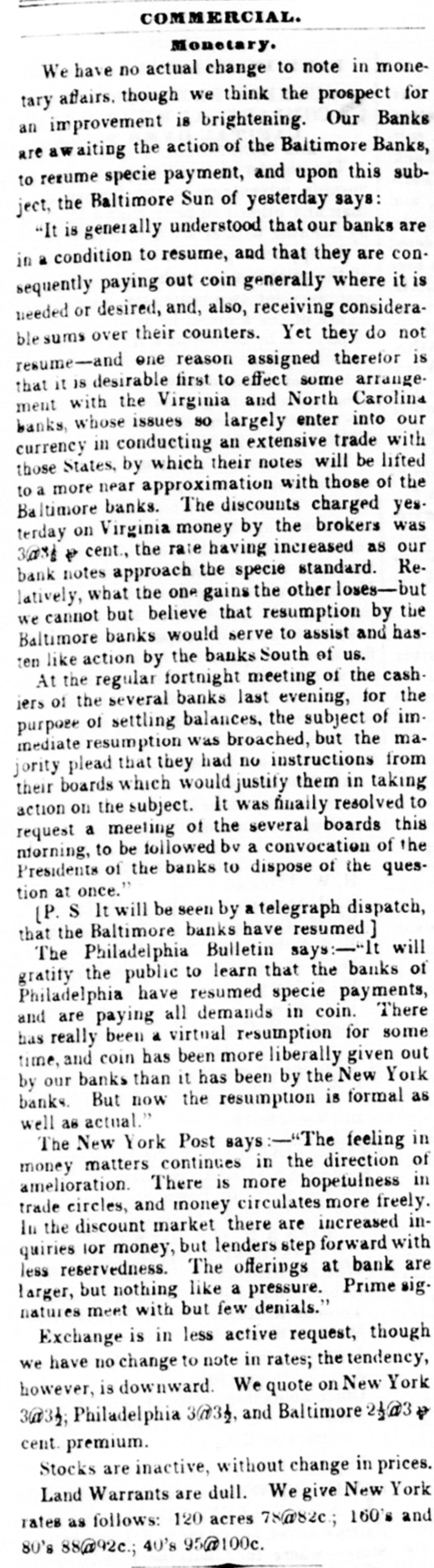 COMMERCIAL. (onetary. We have no actual change to note in monetary affairs, though we think the prospect for an improvement is brightening. Our Banks are awaiting the action of the Baltimore Banks, to resume specie payment, and upon this subject, the Baltimore Sun of yesterday says: "It is generally understood that our banks are in a condition to resume, and that they are consequently paying out coin generally where it is needed or desired, and, also, receiving considerable sums over their counters. Yet they do not resume-and one reason assigned therefor is that it IS desirable first to effect some arrangement with the Virginia and North Carolina banks, whose issues so largely enter into our currency in conducting an extensive trade with those States, by which their notes will be lifted to a more near approximation with those of the Baltimore banks. The discounts charged yes. terday on Virginia money by the brokers was 3@3 P cent., the rate having increased as our bank notes approach the specie standard. Relatively, what the one gains the other loses-but we cannot but believe that resumption by the Baltimore banks would serve to assist and hasten like action by the banks South of us. At the regular fortnight meeting of the cashiers of the several banks last evening, for the purpose of settling balances, the subject of immediate resumption was broached, but the majority plead that they had no instructions from their boards which would justify them in taking action on the subject. It was finally resolved to request a meeting of the several boards this morning, to be followed bv a convocation of the Presidents of the banks to dispose of the question at once." [P. S It will be seen by a telegraph dispatch, that the Baltimore banks have resumed] The Philadelphia Bulletin says:-"It will gratify the public to learn that the banks of Philadelphia have resumed specie payments, and are paying all demands in coin. There has really been a virtual resumption for some time, and coin has been more liberally given out by our banks than it has been by the New York banks. But now the resumption is formal as well as actual." The New York Post says:-"The feeling in money matters continues in the direction of amelioration. There is more hopetulness in trade circles, and money circulates more freely. In the discount market there are increased inquiries for money, but lenders step forward with less reservedness. The offerings at bank are larger, but nothing like a pressure. Prime sig. natures meet with but few denials." Exchange is in less active request, though we have no change to note in rates; the tendency, however, is downward. We quote on New York 3@3h; Philadelphia 3@34, and Baltimore 24@3 cent. premium. Stocks are inactive, without change in prices. Land Warrants are dull. We give New York rates as follows: 120 acres 78@82c.; 160's and 80's 88@92c.; 40's 95@100c.