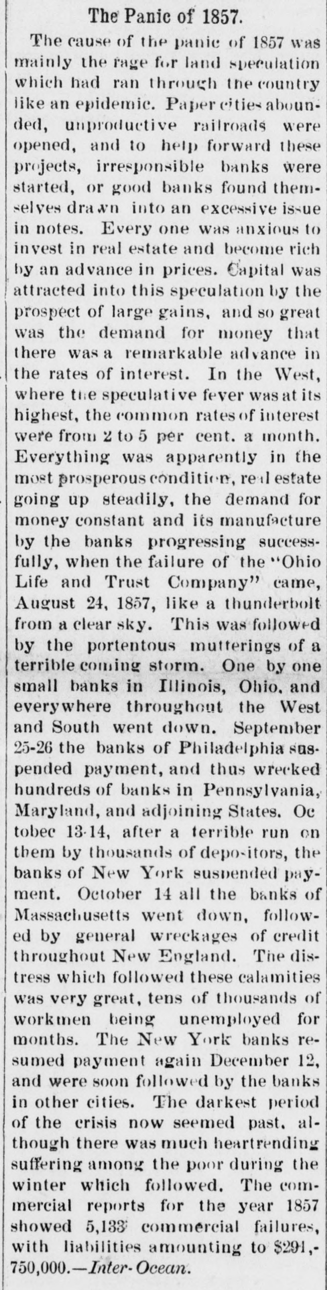 The Panic of 1857. The cause of the panic of 1857 was mainly the rage for land speculation which had ran through the country like an epidemic. Papercities abounded, unproductive railroads were opened, and to help forward these projects, irresponsible banks were started, or good banks found themselves drawn into an excessive issue in notes. Every one was anxious to invest in real estate and become rich by an advance in prices. Capital was attracted into this speculation by the prospect of large gains, and SO great was the demand for money that there was a remarkable advance in the rates of interest. In the West, where the speculative fever wasatits highest, the common rates of interest were from 2 to 5 per cent. a month. Everything was apparently in the most prosperous condition, real estate going up steadily, the demand for money constant and its manufacture by the banks progressing successfully, when the failure of the "Ohio Life and Trust Company" came, August 24, 1857, like a thunderbolt from a clear sky. This was followed by the portentous mutterings of a terrible coming storm. One by one small banks in Illinois, Ohio. and everywhere throughout the West and South went down. September 25-26 the banks of Philadelphia suspended payment, and thus wrecked hundreds of banks in Pennsylvania, Maryland, and adjoining States. Oc tobec 13.14, after a terrible run on them by thousands of depositors, the banks of New York suspended payment. October 14 all the banks of Massachusetts went down, followed by general wreckages of credit throughout New England. The distress which followed these calamities was very great, tens of thousands of workmen being unemployed for months. The New York banks resumed payment again December 12, and were soon followed by the banks in other cities. The darkest period of the crisis now seemed past. although there was much heartrending suffering among the poor during the winter which followed. The commercial reports for the year 1857 showed 5,133 commercial failures, with liabilities amounting to $291,750,000.-Inter-Ocean.