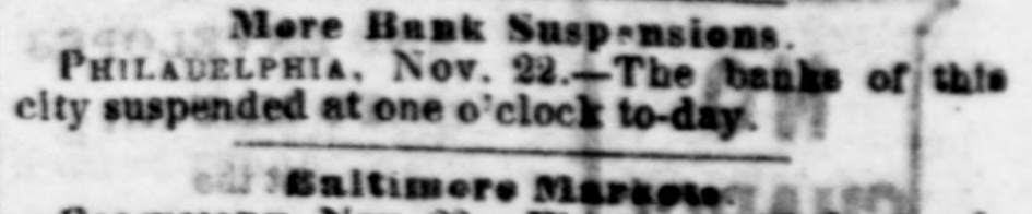 # More Bank Suspensions. PHILADELPHIA, Nov. 22. The banks of this city suspended at one o'clock to-day. Baltimore Markets