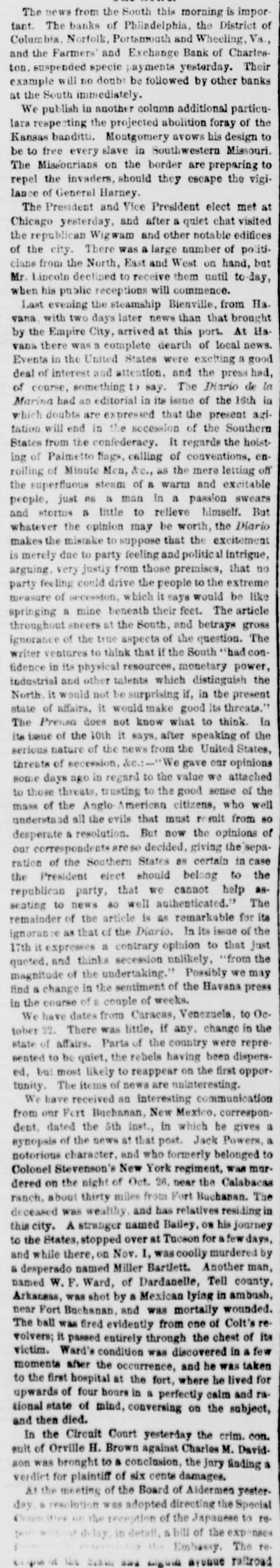 The news from the South this morning is important. The banks of Philadelphia, the District of Columbia, Norfolk, Portsmouth and Wheeling, Va., and the Farmers' and Exchange Bank of Charleston. suspended specie payments yesterday. Their example will no doubt be followed by other banks at the South immediately. We publish in another column additional particulars respecting the projected abolition foray of the Kansas banditti. Montgomery avows his design to be to free every slave in Southwestern Missouri. The Missourians on the border are preparing to repel the invaders, should they escape the vigilance of General Harney. The President and Vice President elect met at Chicago yesterday, and after a quiet chat visited the republican Wigwam and other notable edifices of the city. There was a large number of politicians from the North, East and West on hand, but Mr. Lincoln declined to receive them until to day, when his public receptions will commence. Last evening the steamship Bienville, from Havana with two days later news than that brought by the Empire City, arrived at this port. At Havana there was a complete dearth of local news. Events in the United States were exciting a good deal of interest and attention. and the press had, of course, something to say. The Diario de la Marina had an editorial in its issue of the 16th in which doubts are expressed that the present agitation will end in the secession of the Southern States from the confederacy. It regards the hoisting of Palmetto flags, calling of conventions, enrolling of Minute Men, &c., as the mere letting off the superfluous steam of & warm and excitable people, just as a man in a passion swears and storms a little to relieve himself. But whatever the opinion may be worth, the Diario makes the mistake to suppose that the excitement is merely due to party feeling and politic intrigue, arguing. very justly from those premises, that no party feeling could drive the people to the extreme measure of secession, which it says would be like springing a mine beneath their feet. The article throughout sneers at the South, and betrays gross ignorance of the true aspects of the question. The writer ventures to think that if the South "had confidence in its physical resources, monetary power, industrial and other talents which distinguish the North. it would not be surprising if, in the present state of affairs, it would make good its threats." The Prensa does not know what to think. In its issue of the 10th it says, after speaking of the serious nature of the news from the United States, threats of secession, &e.:-"We gave our opinions some days ago in regard to the value we attached to those threats, trusting to the good sense of the mass of the Anglo American citizens, who well understand all the evils that must result from 80 desperate a resolution. But now the opinions of our correspondents areso decided, giving the separation of the Southern States as certain in case the President elect should belong to the republican party, that we cannot help asseating to news 80 well authenticated." The remainder of the article is as remarkable for its ignorance as that of the Diario. In its issue of the 17th it expresses a contrary opinion to that just quoted. and thinks secession unlikely, "from the magnitude of the undertaking." Possibly we may find a change in the sentiment of the Havana press in the course of 8 couple of weeks. We have dates from Caracas, Venezuela, to October 22. There was little, if any, change in the state of affairs. Parts of the country were represented to be quiet, the rebels having been dispersed, but most likely to reappear on the first opportunity. The items of news are uninteresting. We have received an interesting communication from our Fort Buchanan, New Mexico, correspondent, dated the 5th inst., in which he gives a synopsis of the news at that post. Jack Powers, a notorious character, and who formerly belonged to Colonel Stevenson's New York regiment, was murdered on the night of Oct. 26, near the Calabacas ranch, about thirty miles from Fort Buchanan. The deceased was wealthy, and has relatives residing in this city. A stranger named Bailey, OR his journey to the States, stopped over at Tucson for a few days, and while there, on Nov. 1, was coolly murdered by a desperado named Miller Bartlett. Another man, named W. F. Ward, of Dardanelle, Tell county, Arkansas, was shot by a Mexican lying in ambush, near Fort Buchanan, and was mortally wounded. The ball was fired evidently from one of Colt's revolvers; it passed entirely through the chest of its victim. Ward's condition was discovered in a few moments after the occurrence, and he was taken to the first hospital at the fort, where he lived for upwards of four hours in a perfectly calm and rational state of mind, conversing on the subject, and then died. In the Circuit Court yesterday the crim. con. suit of Orville H. Brown against Charles M. Davidson was brought to a conclusion, the jury finding a verdict for plaintiff of six cents damages. At the meeting of the Board of Aldermen yester. day " resolution was adopted directing the Special on the reception of the Japanese to rein detail, bill of the expenses The reEmbassy. of les any Liguid avenue railroad