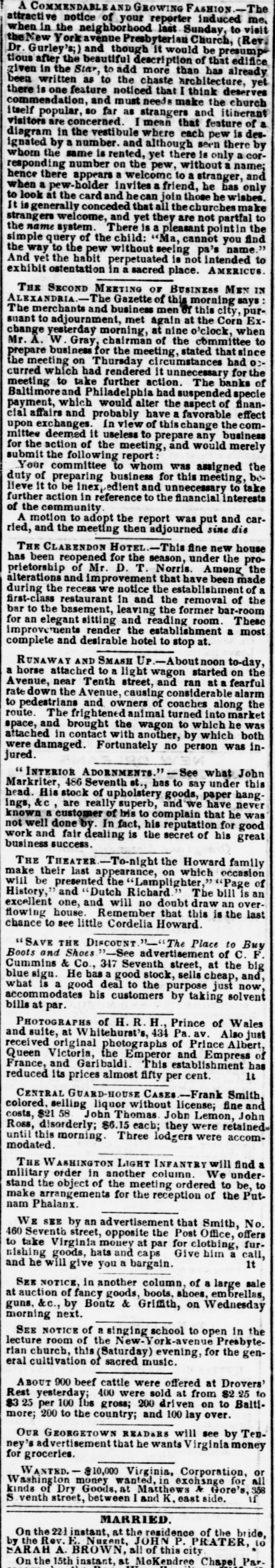 neighborhood last Sunday, to visit theNew Yorkavenue Presbyterian Church, (Rev. Dr. Gurley's;) and though it would be presump tious after the beautiful description of that edifice given in the Star, to add more than has already been written as to the chaste architecture, yet there is one feature noticed that I think deserves commendation, and must needs make the church itself popular, so far as strangers and itinerant visitors are concerned. I mean that feature of a diagram in the vestibule where each pew is designated by a number. and although seen there by whom the same is rented, yet there is only a corresponding number on the pew, without a name; hence there appears a welcome to a stranger, and when a pew-holder invites a friend, he has only to look at the card and hecan join those he wishes. It isgenerally conceded that all the churches ke strangers welcome, and yet they are not partfal to the name system. There is a pleasant point in the simple query of the child: "Ma, cannot you find the way to the pew without seeing pa's name And vet the habit perpetuated is not intended to exhibit ostentation in a sacred place. AMERICUS. THE SECOND MEETING OF BUSINESS MEN IN ALEXANDRIA. Gazette of this morning says: The merchants and business men of this city, pursuant to adjournment, met again at the Corn Exchange yesterday morning, at nine o'clock, when Mr. A. W. Gray, chairman of the committee to prepare business for the meeting, stated that since the meeting on Thursday circumstances had 03curred which had rendered it unnecessary for the meeting to take further action. The banks of Baltimoreand Philadelphia had suspended specie payment, which would alter the aspect of financial affairs and probably have a favorable effect upon exchanges. In view of thischange the committee deemed it useless to prepare any business for the action of the meeting, and would merely submit the following report: Your committee to whom was assigned the duty of preparing business for this meeting, believe it to be inexpedient and unnecessary to take further action in reference to the financial interests of the community A motion to adopt the report was put and carried, and the meeting then adjourned sine die THE CLARENDON HOTEL-This fine new house has been reopened for the season, under the proprietorship of Mr. D. T. Norris. Ameng the alterations and improvement that have been made during the recess we notice the establishment of a first-class restaurant in and the removal of the bar to the basement, leaving the former bar-room for an elegant sitting and reading room. These improvements render the establishment a most complete and desirable hotel to stop at. Runaway AND SMASH UP.-Aboutnoon to-day, a horse attached to a light wagon started on the Avenue, near Tenth street, and ran at a fearful rate down the Avenue, causing considerable alarm to pedestrians and owners of coaches along the route. The frightened animal turned into market space, and brought the wagon to which he was attached in contact with another, by which both jured. were damaged. Fortunately no person was in" INTERIOR ADORNMENTS." See what John Markriter, 486 Seventh st., has to say under this head. His stock of upholstery goods, paper hangings, &c, are really superb, and we have never known a customer of his to complain that he was not well done by. In fact, his reputation for good work and fair dealing is the secret of his great business success. THE THEATER - To-night the Howard family make their last appearance, on which occasion will be presented the "Lamplighter, "Page of History, and "Dutch Richard The bill is an excellent one, and will no doubt draw an overflowing house. Remember that this is the last chance to see little Cordelia Howard. "SAVE THE DISCOUNT Place to Buy Boots and Shoes "See advertisement of C. F. Cummins & Co., 347 Seventh street, at the big blue sign. He has a good stock, sells cheap, and, what is a good deal to the purpose just now, accommodates his customers by taking solvent bills at par. PHOTOGRAPHS of H. R. H., Prince of Wales and suite, at Whitehurst's, 434 Pa. av. Also just received original photographs of Prince Albert, Queen Victoria, the Emperor and Empress of France, and Garibaldi. This establishment has It reduced its prices almost fifty per cent. CENTRAL GUARD-HOUSE CASES-Frank Smith, colored, selling liquor without license; fine and costs, $21 58 John Thomas John Lemon, John Ross, disorderly; $6.15 each; they were retained modated. until this morning. Three lodgers were accomTHE WASHINGTON LIGHT INFANTRY will find a military order in another column. We understand the object of the meeting ordered to be, to make arrangements for the reception of the Putnam Phalanx. WE SEE by an advertisement that Smith, No. 460 Seventh street, opposite the Post Office, offers to take Virginia money at par for clothing, furnishing goods, hats and caps Give him a call, It and he will give you a bargain. SEE NOTICE, in another column, of a large sale at auction of fancy goods, boots, shoes, embrellas, guns, &c., by Bontz & Griffith, on Wednesday morning next. SEE NOTICE of a singing school to open in the lecture room of the New- York-avenue Presbyterian church, this (Saturday) evening, for the general cultivation of sacred music. ABOUT 900 beef cattle were offered at Drovers' Rest yesterday; 400 were sold at from $2 25 to $3 25 per 100 lbs gross; 200 driven on to Baltimore; 200 to the country; and 100 lay over. OUR GEORGETOWN READERS will see by Tenney's advertisement that he wants Virginia money for groceries. WANTED. $10,000 Virginia, Corporation, or Washington money wanted, in exchange for all kinds of Dry Goods, at Matthews & Gore's, 358 if S venth street, between I and K, east side. MARRIED. On the 221 instant, at the residence of the bride, by the Rev. E. Nugent, JOHN P. PRATER, to SARAH A. BROWN, all of this city ParOn the 15th instant, at MoKendree Chapel