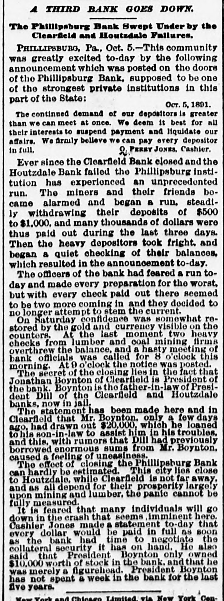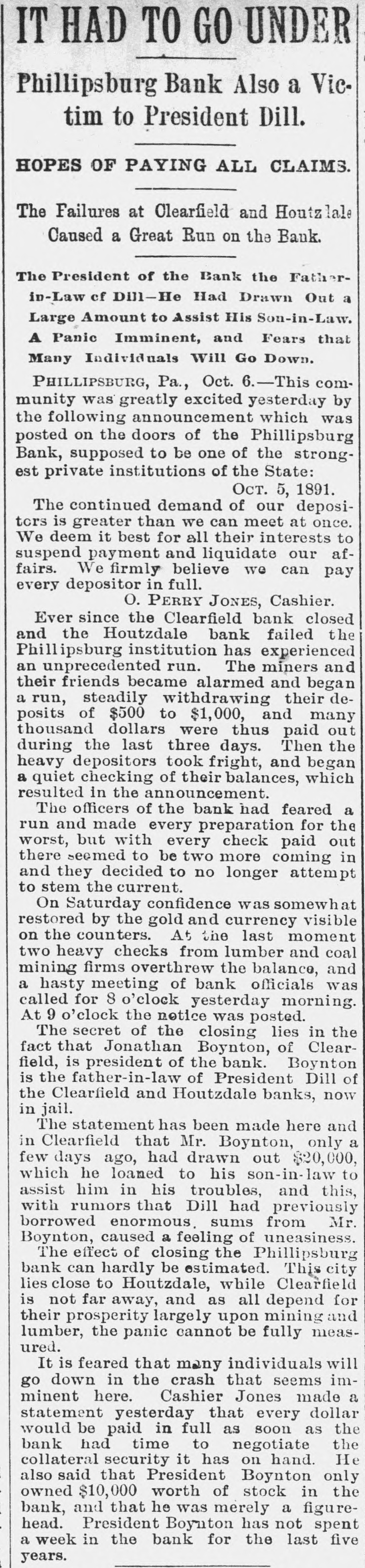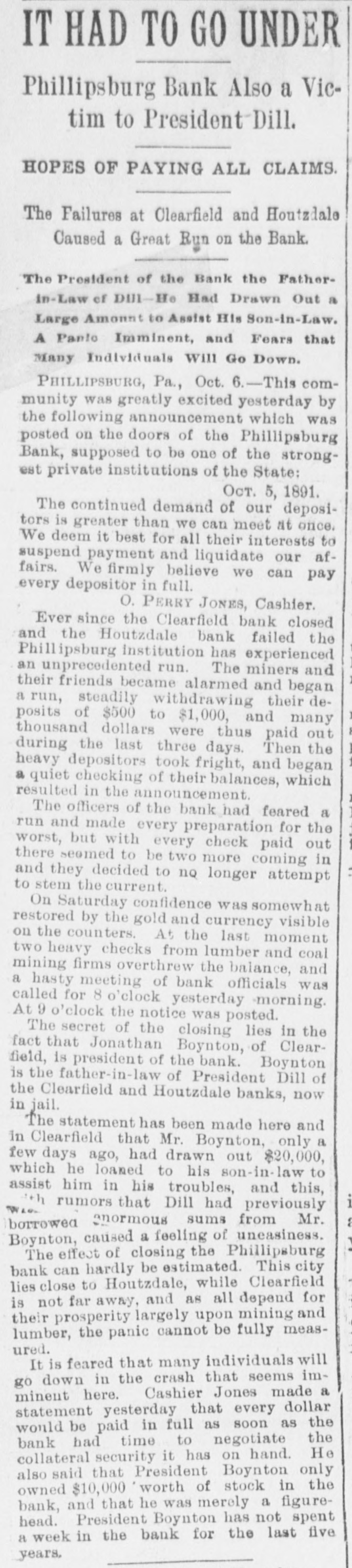IT HAD TO GO UNDER Phillipsburg Bank Also a Victim to President Dill. HOPES OF PAYING ALL CLAIMS. The Failures at Clearfield and Houtzlale Caused a Great Run on the Bank. The President of the Bank the Fatherin-Law cf Dill-He Had Drawn Out a Large Amount to Assist His Son-in-Law. A Panic Imminent, and Fears that Many Individuals Will Go Down. PHILLIPSBURG, Pa., Oct. 6.-This community was greatly excited yesterday by the following announcement which was posted on the doors of the Phillipsburg Bank, supposed to be one of the strongest private institutions of the State: OCT. 5,1891. The continued demand of our depositcrs is greater than we can meet at once. We deem it best for all their interests to suspend payment and liquidate our affairs. We firmly believe we can pay every depositor in full. O. PERRY JONES, Cashier. Ever since the Clearfield bank closed and the Houtzdale bank failed the Phillipsburg institution has experienced an unprecedented run. The miners and their friends became alarmed and began a run, steadily withdrawing their deposits of $500 to $1,000, and many thousand dollars were thus paid out during the last three days. Then the heavy depositors took fright, and began a quiet checking of their balances, which resulted in the announcement. The officers of the bank had feared a run and made every preparation for the worst, but with every check paid out there seemed to be two more coming in and they decided to no longer attempt to stem the current. On Saturday confidence was somewhat restored by the gold and currency visible on the counters. At the last moment two heavy checks from lumber and coal mining firms overthrew the balance, and a hasty meeting of bank officials was called for 8 o'clock yesterday morning. At 9 o'clock the notice was posted. The secret of the closing lies in the fact that Jonathan Boynton, of Clearfield, is president of the bank. Boynton is the father-in-law of President Dill of the Clearfield and Houtzdale banks, now in jail. The statement has been made here and in Clearfield that Mr. Boynton, only a few days ago, had drawn out $20,000, which he loaned to his son-in-law to assist him in his troubles, and this, with rumors that Dill had previously borrowed enormous, sums from Mr. Boynton, caused a feeling of uneasiness. The effect of closing the Phillipsburg bank can hardly be estimated. This city lies close to Houtzdale, while Clearfield is not far away, and as all depend for their prosperity largely upon mining and lumber, the panic cannot be fully measured. It is feared that many individuals will go down in the crash that seems imminent here. Cashier Jones made a statement yesterday that every dollar would be paid in full as soon as the bank had time to negotiate the collateral security it has on hand. He also said that President Boynton only owned $10,000 worth of stock in the bank, and that he was merely a figurehead. President Boynton has not spent a week in the bank for the last five years.