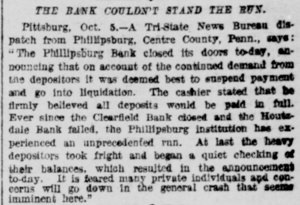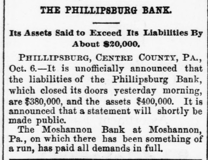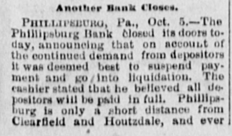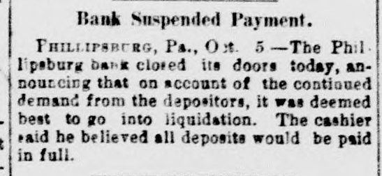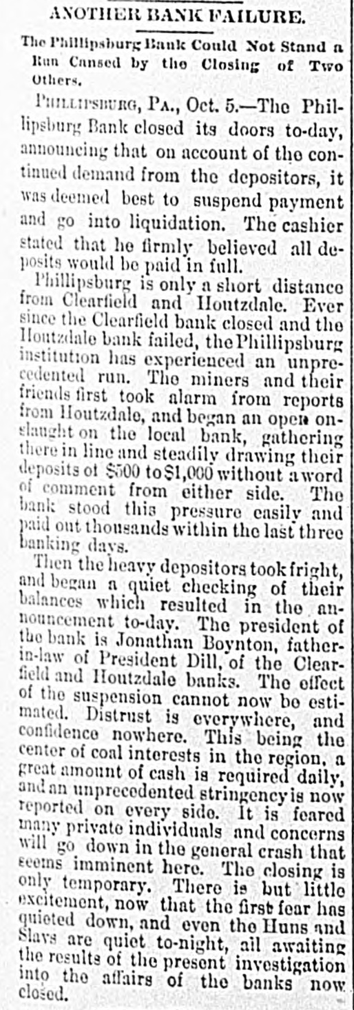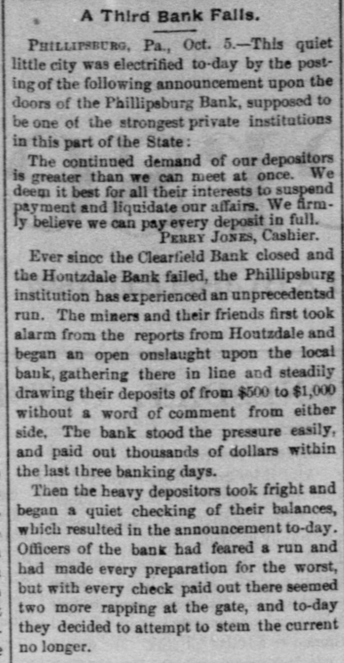 IT HAD TO GO UNDER Phillipsburg Bank Also a Victim to President Dill. HOPES OF PAYING ALL CLAIMS. The Failures at Clearfield and Houtzlale Caused a Great Run on the Bank. The President of the Bank the Fatherin-Law cf Dill-He Had Drawn Out a Large Amount to Assist His Son-in-Law. A Panic Imminent, and Fears that Many Individuals Will Go Down. PHILLIPSBURG, Pa., Oct. 6.-This community was greatly excited yesterday by the following announcement which was posted on the doors of the Phillipsburg Bank, supposed to be one of the strongest private institutions of the State: OCT. 5,1891. The continued demand of our depositcrs is greater than we can meet at once. We deem it best for all their interests to suspend payment and liquidate our affairs. We firmly believe we can pay every depositor in full. O. PERRY JONES, Cashier. Ever since the Clearfield bank closed and the Houtzdale bank failed the Phillipsburg institution has experienced an unprecedented run. The miners and their friends became alarmed and began a run, steadily withdrawing their deposits of $500 to $1,000, and many thousand dollars were thus paid out during the last three days. Then the heavy depositors took fright, and began a quiet checking of their balances, which resulted in the announcement. The officers of the bank had feared a run and made every preparation for the worst, but with every check paid out there seemed to be two more coming in and they decided to no longer attempt to stem the current. On Saturday confidence was somewhat restored by the gold and currency visible on the counters. At the last moment two heavy checks from lumber and coal mining firms overthrew the balance, and a hasty meeting of bank officials was called for 8 o'clock yesterday morning. At 9 o'clock the notice was posted. The secret of the closing lies in the fact that Jonathan Boynton, of Clearfield, is president of the bank. Boynton is the father-in-law of President Dill of the Clearfield and Houtzdale banks, now in jail. The statement has been made here and in Clearfield that Mr. Boynton, only a few days ago, had drawn out $20,000, which he loaned to his son-in-law to assist him in his troubles, and this, with rumors that Dill had previously borrowed enormous, sums from Mr. Boynton, caused a feeling of uneasiness. The effect of closing the Phillipsburg bank can hardly be estimated. This city lies close to Houtzdale, while Clearfield is not far away, and as all depend for their prosperity largely upon mining and lumber, the panic cannot be fully measured. It is feared that many individuals will go down in the crash that seems imminent here. Cashier Jones made a statement yesterday that every dollar would be paid in full as soon as the bank had time to negotiate the collateral security it has on hand. He also said that President Boynton only owned $10,000 worth of stock in the bank, and that he was merely a figurehead. President Boynton has not spent a week in the bank for the last five years.