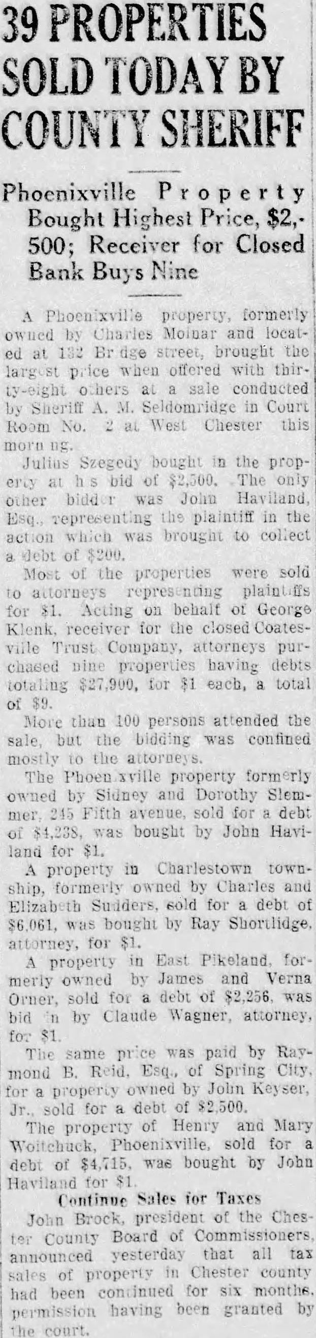 PROPERTIES COUNTY SHERIFF Phoenixville Bought Highest Price, $2,500; Receiver for Closed Bank Buys Nine Phoenixville property, formerly by Charles Moinar and locatbrought the offered with Sheriff in Court Room West Chester this Julius Szegedy bought in the $2,500. other was John Esq., plaintiff the which brought to collect of Most the properties sold attorneys representing $1. Acting on behalf George Klenk, receiver for the ville Trust Company, attorneys purchased properties debts totaling for each, total More than persons attended the but the bidding was confined mostly The Phoen property formerly owned Sidney Dorothy Slemmer, sold for debt bought by John Haviland for $1. property in Charlestown township, by and for debt bought by Ray Shortlidge. attorney, for $1. East for property owned James and Verna merly sold for of Orner, bid by Claude Wagner, attorney, for The same was paid by Raymond B. Esq., Spring owned by John Keyser, property sold debt of Henry and Mary The Phoenixville, sold debt of $4,715, bought by John Haviland Continue Sales for Taxes John Brock, of the ChesCounty Board of Commissioners, that all tax property county had been for six months. having been granted the