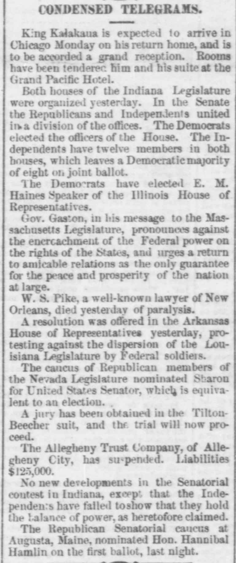 CONDENSED TELEGRAMS. King Kalakaua is expected to arrive in Chicago Monday on his return home, and is to be accorded a grand reception. Rooms have been tenderec him and his suite at the Grand Pacific Hotel. Both houses of the Indiana Legislature were organized yesterday. In the Senate the Republicans and Independents united in a division of the offices. The Democrats elected the officers of the House. The Independents have twelve members in both houses, which leaves a Democratie majority of eight on joint ballot. The Democrats have elected E. M. Haines Speaker of the Illinois House of Representatives. Gov. Gaston, in his message to the Massachusetts Legislature, pronounces against the enercachment of the Federal power on the rights of the States, and urges a return to amicable relations as the only guarantee for the peace and prosperity of the nation at large. W. S. Pike, a well-known lawyer of New Orleans, died yesterday of paralysis. A resolution was offered in the Arkansas House of Representatives yesterday, protesting against the dispersion of the Louisiana Legislature by Federal soldiers. The cancus of Republican members of the Nevada Legislature nominated Sharon for United States Senator, which is equivalent to an election. A jury has been obtained in the TiltonBeecher suit, and the trial will now proceed. The Allegheny Trust Company, of Allegheny City, has suspended. Liabilities $125,000. No new developments in the Senatorial contest in Indiana, except that the Independents have failed toshow that they hold the balance of power, as heretofore claimed. The Republican Senatorial caucus at Augusta, Maine, nominated Hon. Hannibal Hamlin on the first ballot, last night.