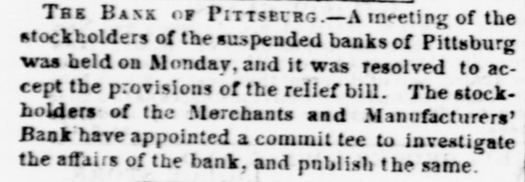 far Southern as neighbors. they express confidence in their ability to maintain specie payments. The Nicaragua Transit Company. as the Ameri can. Atlantic and Pacific Canal Company, is popu larly called. has made an assessment of 85 on what are known as the Canal rights. We understand that the British Bank of North America has ordered gold from England and will remit its bills for collection instead of selling then at the present low rates. The amount of gold t cover its operation will reach £500,000 per month of which £100.000 has been ordered. The New York Journal of Commerce of Friday aftenoon, says: We regret to announce the suspension of P Choutou Jr. & Co., fur dealers. with large liabili ties. The house of P. Choutou Jr., Sanf & Co. dealers in iron, although composed of several o the same partners. is a different concern with dis tinet interests and is not affected by the above sus pension. The suspension of the house of Brum mel & Roysters. tobacco dealers. is also announced This respectable firm were winding up their affair preparatory to going out of busines. but have beer caught in the storm. Messrs Swift, Ransom & Co bankers are also reported. The same paper of Saturday afternoon, has th following: The pressure to-day is not greater than expected nor the financial disasters altage unexpected Some who have stood heretofore unshaken hav gone down but the most of the suspensions hav occurred among those who were widely known Messrs. E. W. Clarke, Dodge & Co., bankers and co lecting agents. after making every possible effor to sustain themselves have at last stopped pay ment. The primary cause was the large advance required by their Boston house. J. W. Clarke & Co but they had also large connections with the west both with railroads and business firms. and hav become 80 much involved that they could not easil disentangle themselves. They have been ver) much respected. with a wide circle of friends, an will have much sympathy in their misfortunes. We also notice with regret the suspension o Messrs Gage. Dater & Sloan dry goods jobbers it Chambers street. enjoying a fair credit, and o Messrs L Bauer & Co., in the hosiery trade. The failure of Messrs. Powell, Ramsdell & Co o Newburg has been followed by the suspension 0 the Powell Bank of that city. Foreign Exchange continues inactive. with considerable quantity floating upon the market and but few buyers. Bills on London. draw against produce, have been sacrificed at 90a95 pe cent but bankers rates are quoted at 100a103. The Tribune of Saturday gives a list of the note thrown out of the banks there: The following Banks are thrown out to-day The Farmers' Bank and Hudson River Bank. at Hud son; Old Saratoga Bank. N. Y.; Thompson Bank Conn.: Phillipsburg Bank, N. J.; Bass River Bank Mass.; and Stark Bank, Vt. Many of the uncurren money dealers have been unwilling to purchase Eastern currency to-day, and buy State only to moderate extent at 1 to 2 per cent. discount. The American Exchangeand Metropolitan Banks, how ever. continue to receive as usual at 1-10 for Eas tern, and 1/4 per cent. for State, from their dealer and correspondent Banks. and we are assured the will continue to receive as long as the New York Banks sustain specie payments. THE SUSPENSION AT WILLIAMSBURG, N. Y. The Farmers' and Citizens' Bank of Williams burg, L. I., which suspended in consequence of on Thursday, had $103,000 on deposit, and about $277. discounted paper in its possession $225,000 of the latter is considered perfectly good Depositors have been assured that they will no lose in the slightest degree, although they may have to wait a short time for their money. The circulation of the Bank was $100.000, and as this i secured by State stocks, the bill-holders canno suffer. It is believed that the Bank will very soor redeem all its circulation. dollar for dollar. MARYLAND. The Baltimore Patriot of Saturday, learns th following: Our banks are discounting only to a limited ex tent, and disposed to restrict their lines as much a possible-hence mercantile accommodations ar less than generally supposed. As much, however, is being done as can be with prudence and due regard to the future. Quite large amount of good business paper is offering or the street, but capitalists being backward-not posed at present to invest largely-negotiation are consequently, restricted. Good to first clas notes may be quoted nominally at to 2 per cent a month-very little under the highest name figure and difficult to sell at that. Second clas meets with but little consideration. Money on call ranges from 13/4 to 2 per cent. Exchange on the North has materially advanced and is now selling at to 10 per cent. premium We quote Virginia bank notes (old) at 3a 4 pe cent. discount, and other descriptions at 5 a 6 pe cent. discount. North Carolina difficult of sal at 5 to 6 and 7 per cent. discount. Ohio and West ern bank notes are not selling to any considerabl extent. Specie in demand. Gold has advanced. and sell to-day at 7 to 10 per cent. premium. as to amounts &c. Silver is also in pressing request, and som banks have been selling it in small sums to mee exigencies. at to 6 per cent. premium. This ad vance in price is caused by an absolute necessit for small change in the way of convenience to pa laborers and others. The banks. we learn, are obtaining as much of it a they possibly can to accommodate their customers Great difficulty and much distress exists amongs the poorer classes. Many of them are forced t sacrifice, comparatively speaking. much of thei earnings, in order to procure small change, or us the money given for services rendered. IN PENNSYLVANIA. The Philadelphia Ledger of Saturday. says: Monetary affairs here. are more quiet. but mone is as hard to command as ever. and if there is les excitement. it is only because there is lessened et fort to resist the seemingly overwhelming difficult ties that threaten to whelm in ruin SO many of on active, though unwisely extended, b