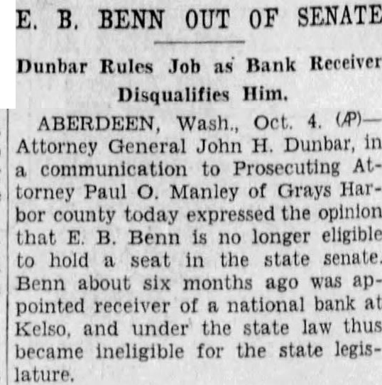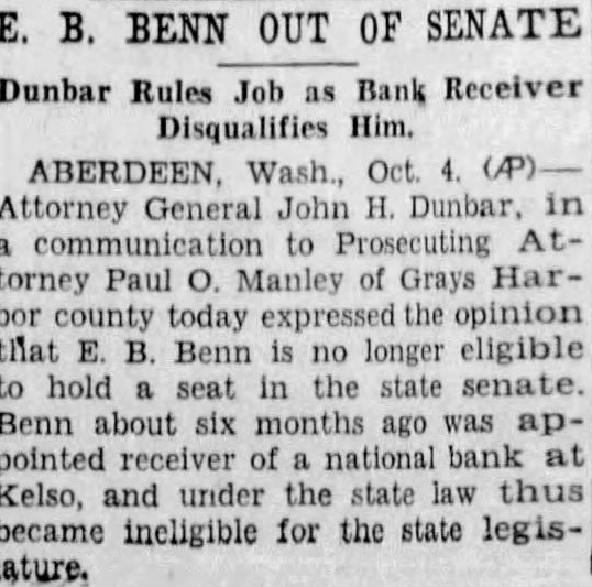 E. B. BENN OUT OF SENATE Dunbar Rules Job as Bank Receiver Disqualifies Him. Attorney General John H. Dunbar, to Attorney Paul Manley of Grays Harbor today the opinion that B. Benn no longer eligible to hold in the state senate. Benn about six months ago was pointed of national bank Kelso, and under the state law thus became ineligible for the state legislature.